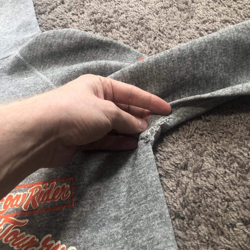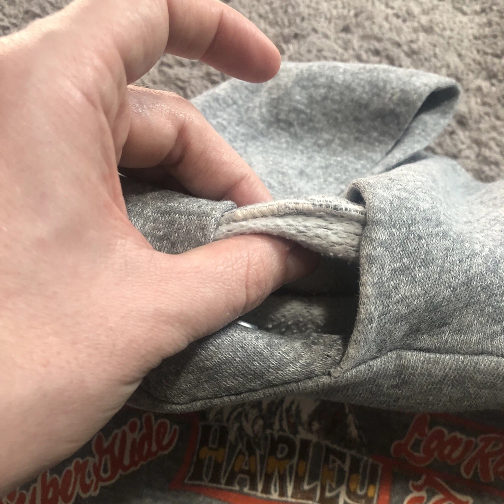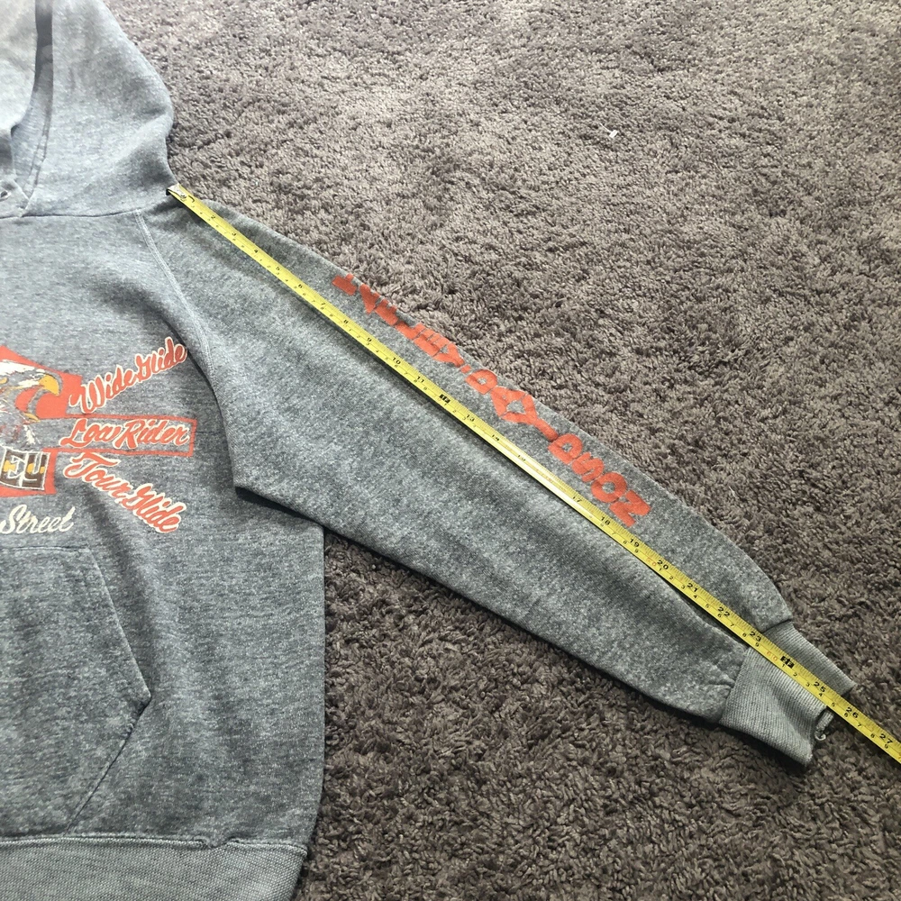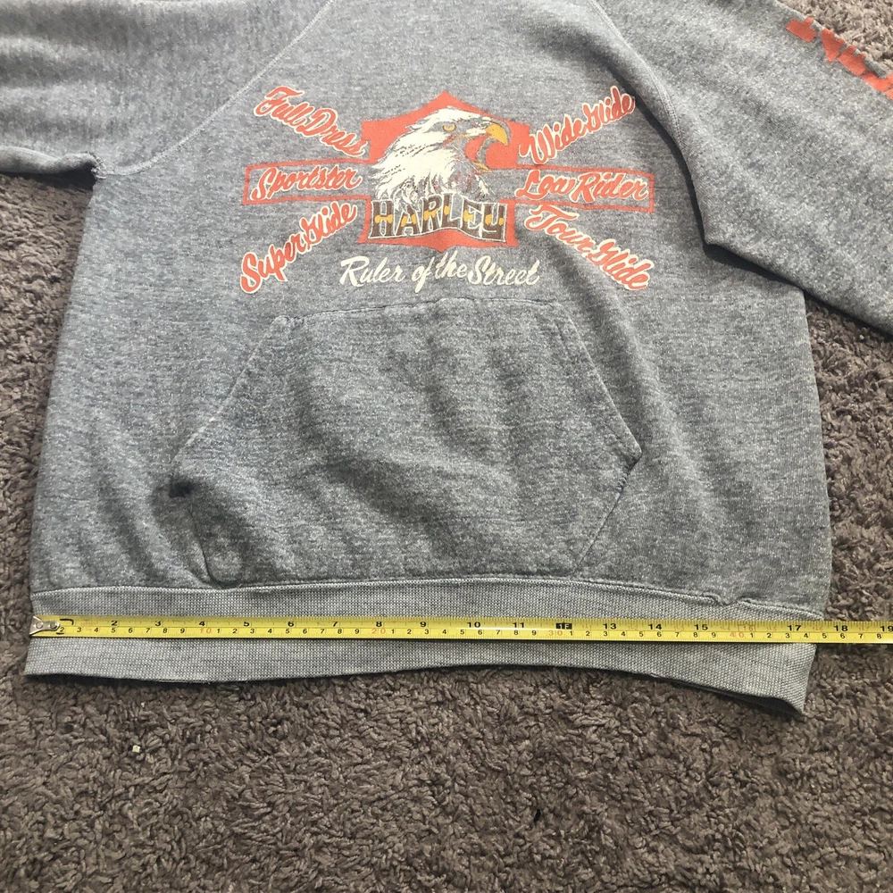Vintage 70s 80s Harley Davidson Eagle Raglan Hoodie Size Small Grey Tilley Inc. Good condition for age with some flaws Size tag is missing, but measurements are provided in photos. A couple holes under each arm, stitching up could be a fix. Small hole at pocket corner. Small hole at bottom hem too. Missing drawstring. Graphics look to be in really nice looking shape.