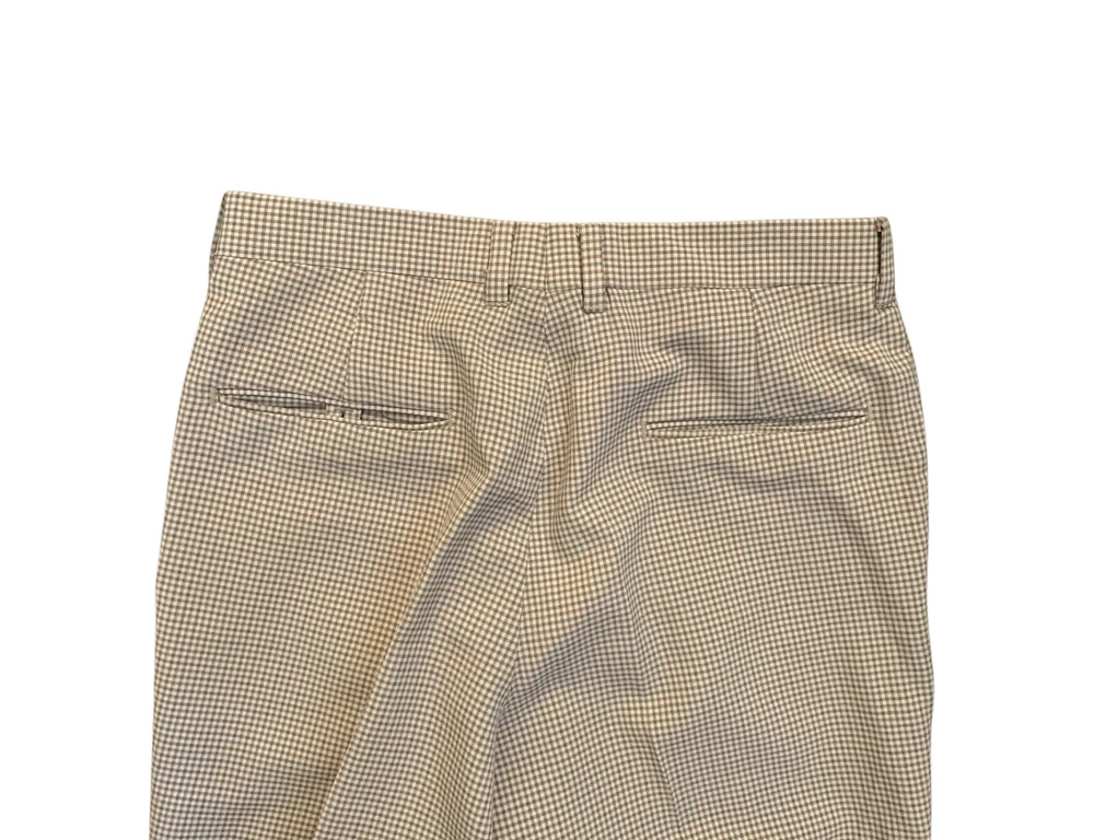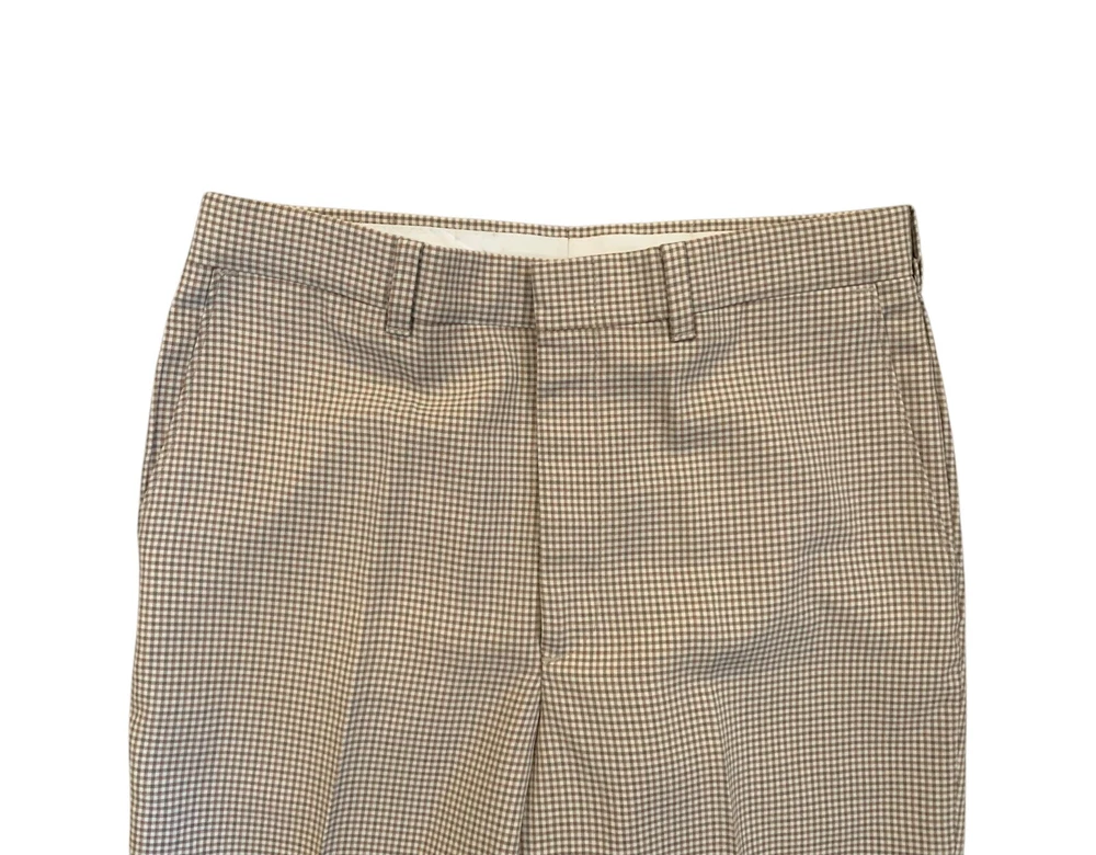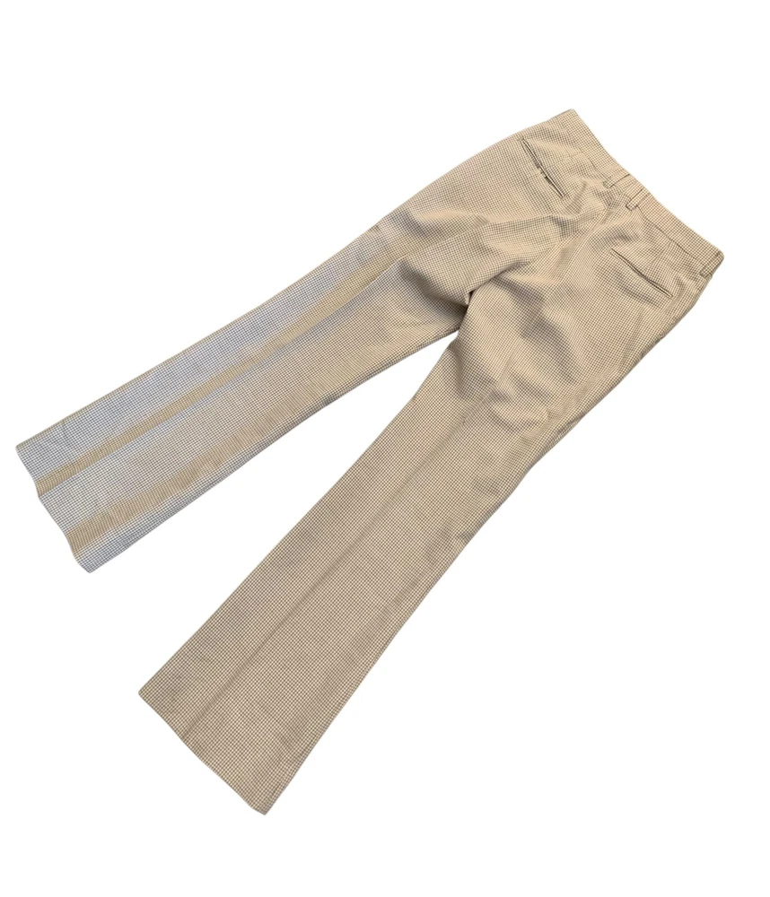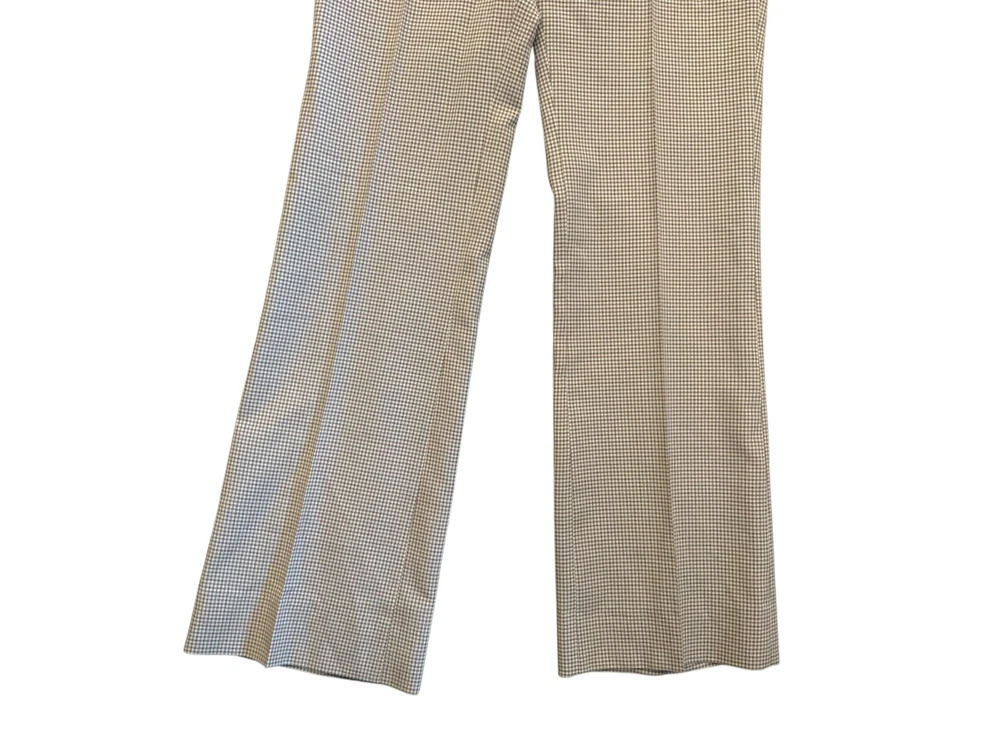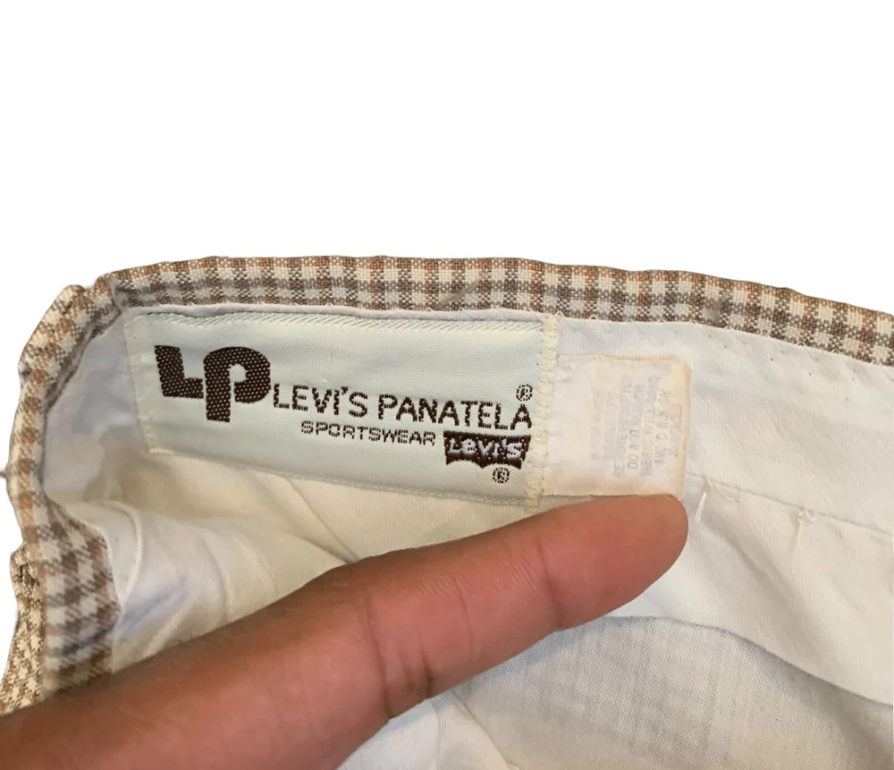 This vintage pair of Levi's Panatela pants from the 1970s features a beige gingham pattern with a bootcut and flared style, making them a unique addition to any wardrobe. The pants are made of polyester and rayon fabric, with a pleated front and a classic fit, perfect for a retro USA or hippie-themed look. With a zipper closure and pockets, these pants are ideal for various occasions from casual to formal, making them versatile and stylish for any event. Measurements: Waist: 16” Rise: 8” Outseam length: 44” Inseam length: 34” Leg opening: 10”