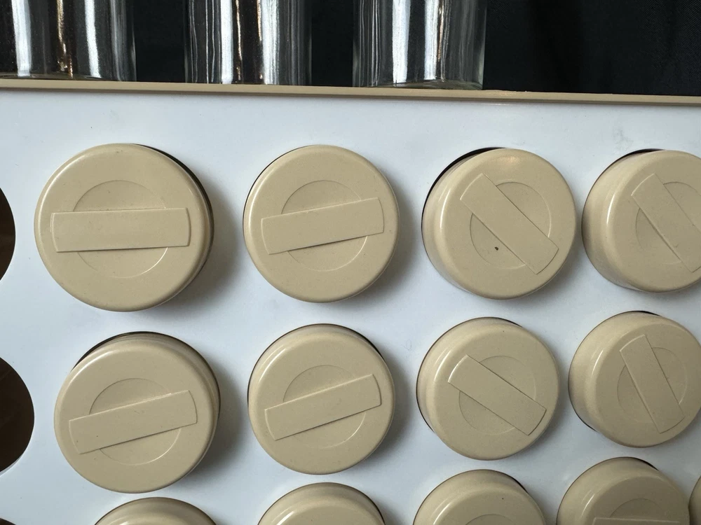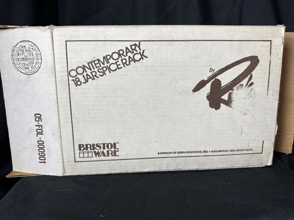 The product is a vintage 70s MOD spice rack shelf made of tan beige plastic in a Mid-Century Modern style. It features an oval shape with 18 compartments for spice jars, with three tiers for organizing. The set includes a rack, lid, and jar, and is wall-mounted for easy access. Made in the United States by Bristol Ware, this spice rack is a practical and stylish addition to any kitchen, providing airtight storage for reusable jars with label tags for easy identification.
