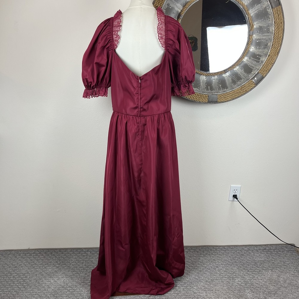 Vintage Burgundy Lace Maxi Dress Womens Size 20 Puff Sleeve 70s 80s Formal Gown Bridesmaid Prom Condition: Gently worn, no visible flaws. Zipper is functional, lace trim intact, and fabric has no stains or holes noted. Classic vintage formal gown likely from the 1970sb or the 1980s featuring a rich burgundy color with matching lace trim detail at neckline and sleeve cuffs. Puff short sleeves with elastic and lace edge, V-neck with scalloped lace, and a gathered skirt for a full silhouette. Deep V back with functional zipper closure for secure fit. Tag size 20 (see photo for original tag). Flat measurements (approximate): pit to pit ~20.5", total length from shoulder to hem ~59". Estimated for plus size/curvy fit; please compare measurements to your own for best fit. Weight: 13.5 ounces (see scale photo). Color: Burgundy/wine with tonal lace accents. Fabric has a light sheen, likely synthetic blend (no fabric content tag present). Great for formal, costume, prom, period, or stage wear. Stored in a labeled poly bag for protection (see storage photo). Style: Vintage 70s formal gown, prom dress, maxi puff sleeve, lace trim, zip back.