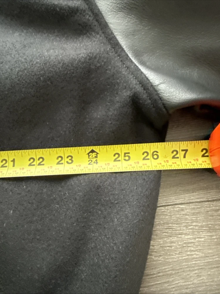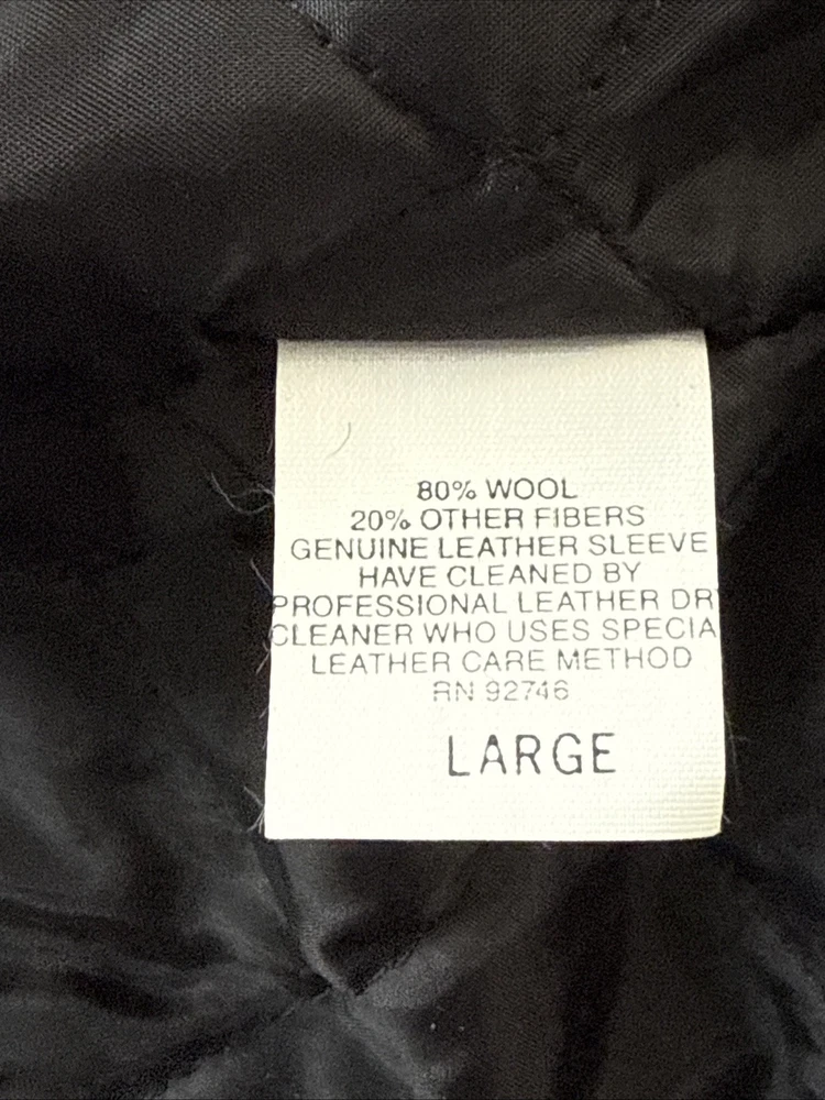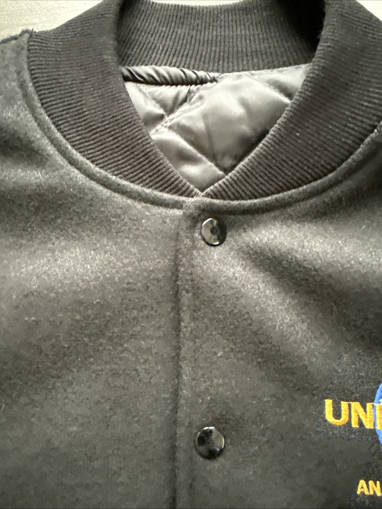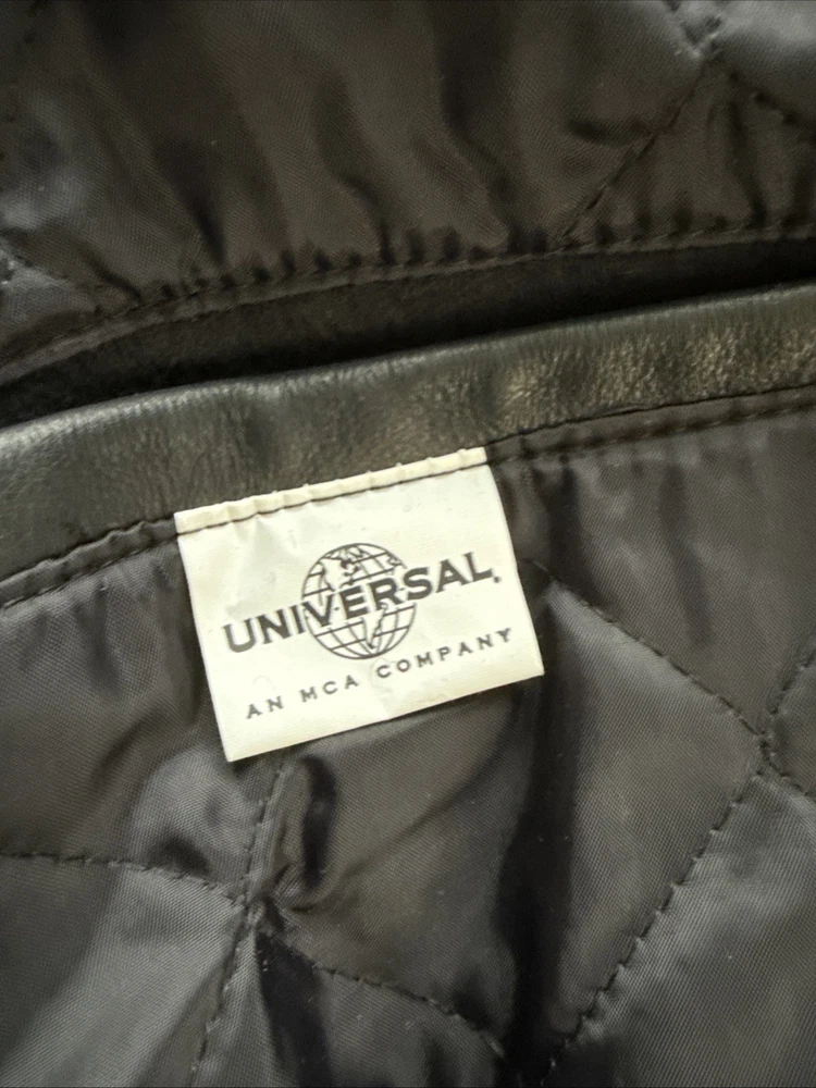 Insulation Material: Wool Type: Jacket Style: Bomber Jacket Outer Shell Material: Leather Country/Region of Manufacture: United States Occasion: Casual, Party/Cocktail, Travel Color: Black Size: L Department: Men Jacket/Coat Length: Mid-Length Season: Fall, Spring, Summer, Winter Closure: Snap Brand: Universal Studios Hollywood Accents: Embroidered Pattern: Solid Theme: 80s, 90s, Movie, University, Company, Pictures, letterman, rare, varsity Vintage: Yes Size Type: Regular Lining Material: Leather Fit: Classic