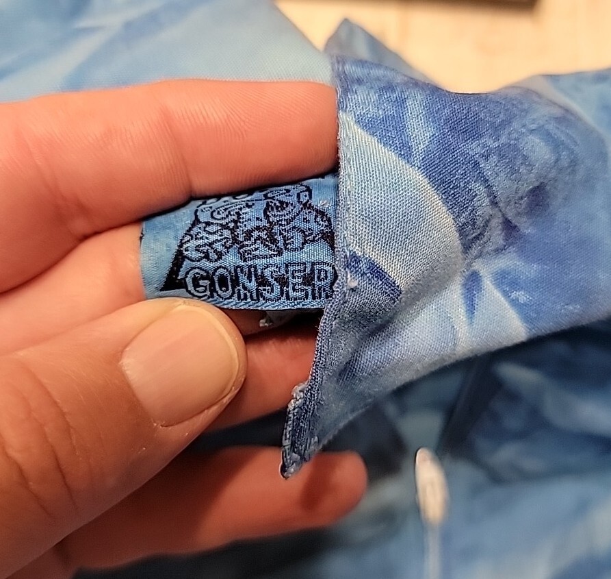 This lot includes two vintage tie-dye parachute tops from the 1980s. The tops feature the brand Gonser and are made from a comfortable cotton blend material. These unique tops were made in the United States and will make a great addition to any vintage clothing collection. Perfect for men who love vintage style, these tops are sure to stand out and make a statement. Don't miss out on the chance to own a piece of 80s fashion with these eye-catching parachute tops!