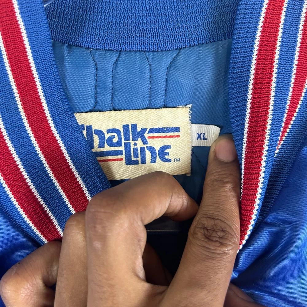 Show off your love for the Chicago Cubs with this vintage MLB 80s Chalk Line blue satin jacket. This unisex adult jacket is officially licensed and made in the United States. It features the iconic team logo and is perfect for regular season games. The jacket is size XL and comes in a beautiful blue color. It is a great addition to any baseball fan's collection and is perfect for showing support for your favorite team. Don't miss out on this opportunity to own a piece of baseball history! SKU: 180041