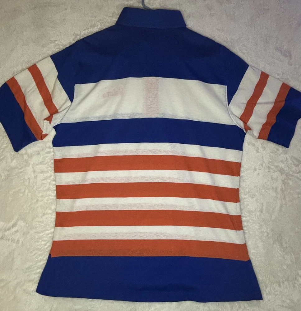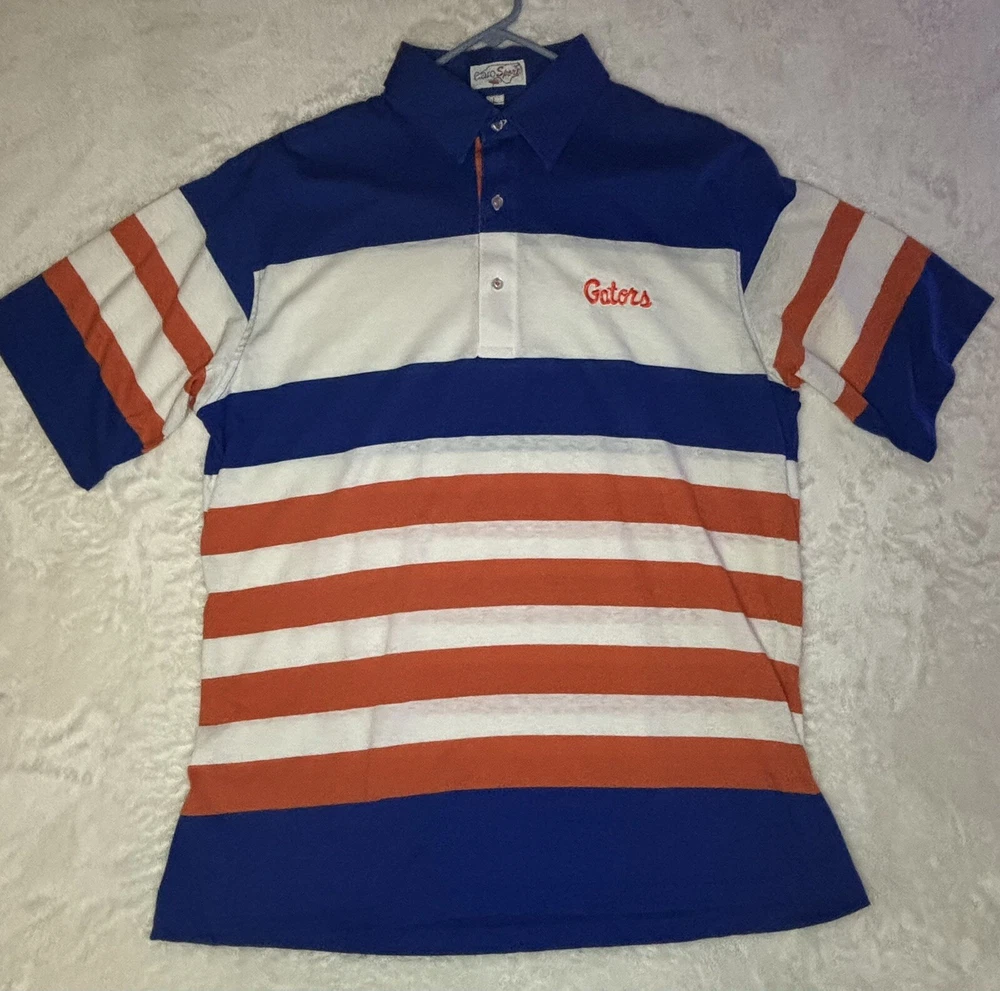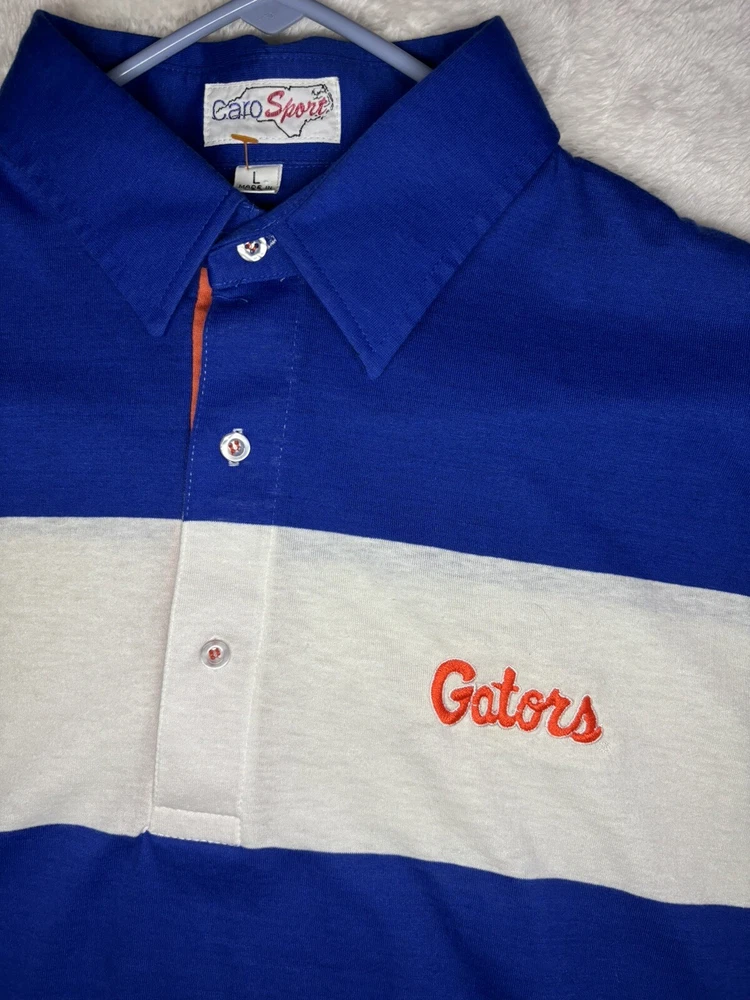 Show off your love for the Florida Gators with this vintage 80's Caro Sport polo shirt. This rare find is perfect for any fan of the team looking to add a unique piece to their collection. The shirt features the official team colors and logo, making it a great way to show support during the regular season. It's officially licensed and made in the United States, ensuring its quality and authenticity. Perfect for golf enthusiasts, this shirt is a must-have for any Florida Gators fan.