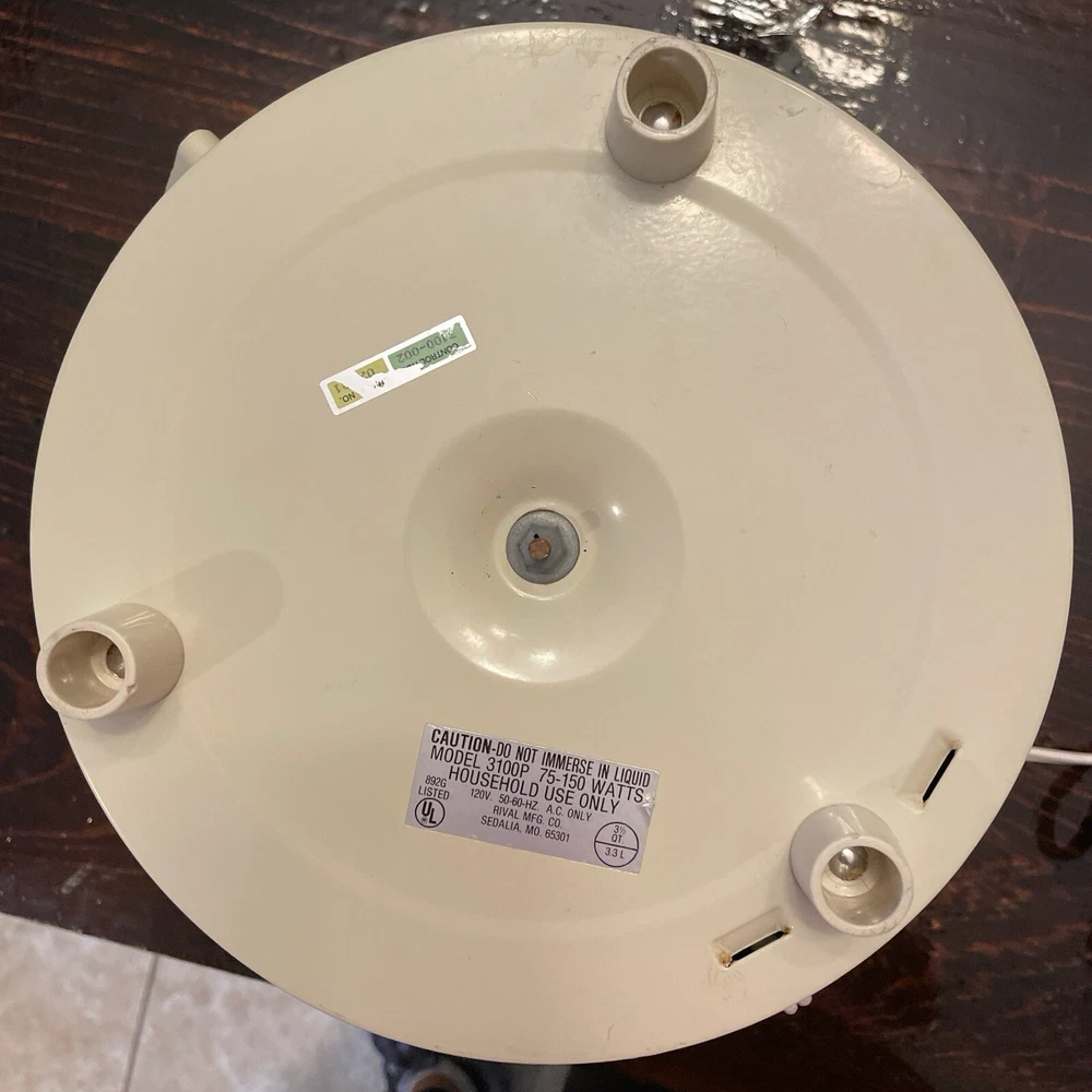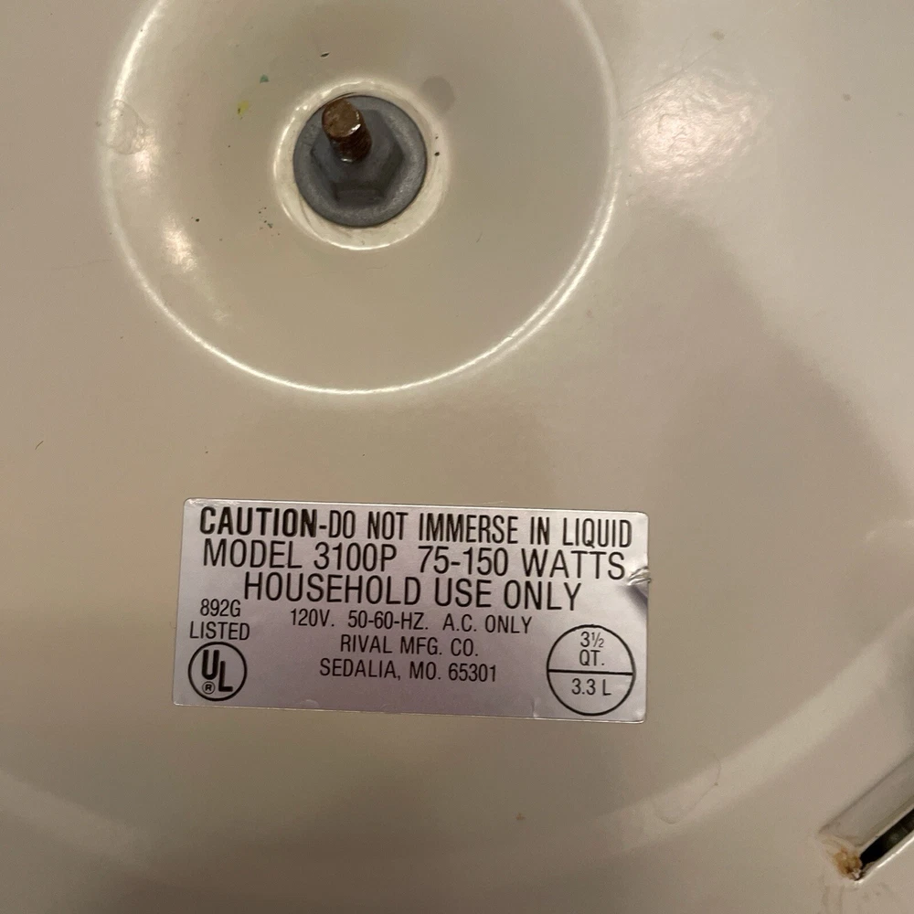 Cable Length:24" electric plug in cordFinish:GlossyComponents Included:Lid, PotColor:BeigeMaterial:CeramicModel:Crock Pot Model 3100PType:Slow CookerMaximum Timer Setting:N/ANumber of Settings/Programs:2Item Depth:9 inItem Weight:7.8 lbs.Item Height:11.5 in with lidBrand:RivalFeatures:Stay-Cool HandlesPower:75-150 WattsPower Source:ElectricVoltage:120 VMPN:N/AItem Width:11 inCustom Bundle:NoCountry/Region of Manufacture:United StatesCapacity:3.5 qt