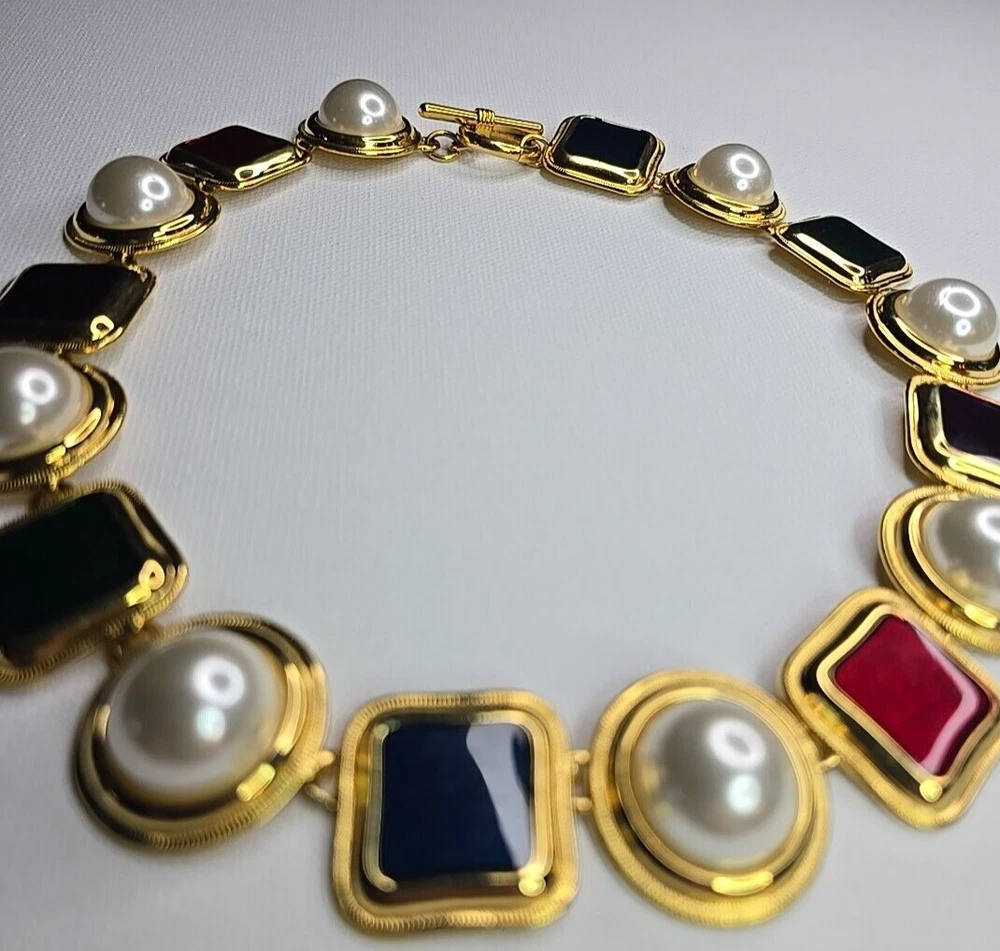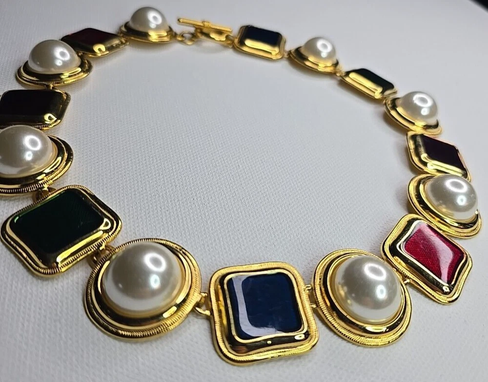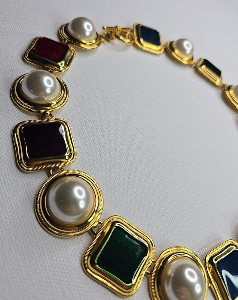 The product is a vintage 80's multicolor choker necklace. It features a vibrant mix of gold,pearl,red green,amethyst,green and has a choker style, making it a trendy and statement piece of fashion jewelry. Perfect for adding a pop of color to any outfit with its unique and retro-inspired design.