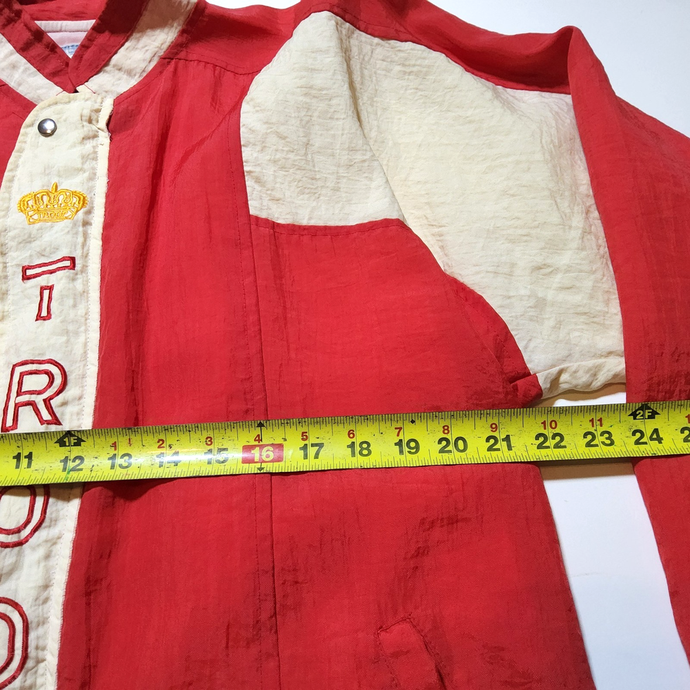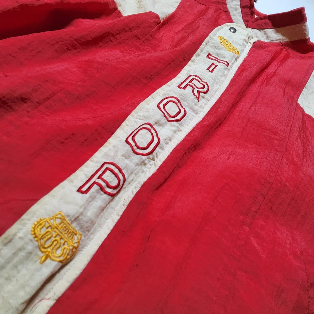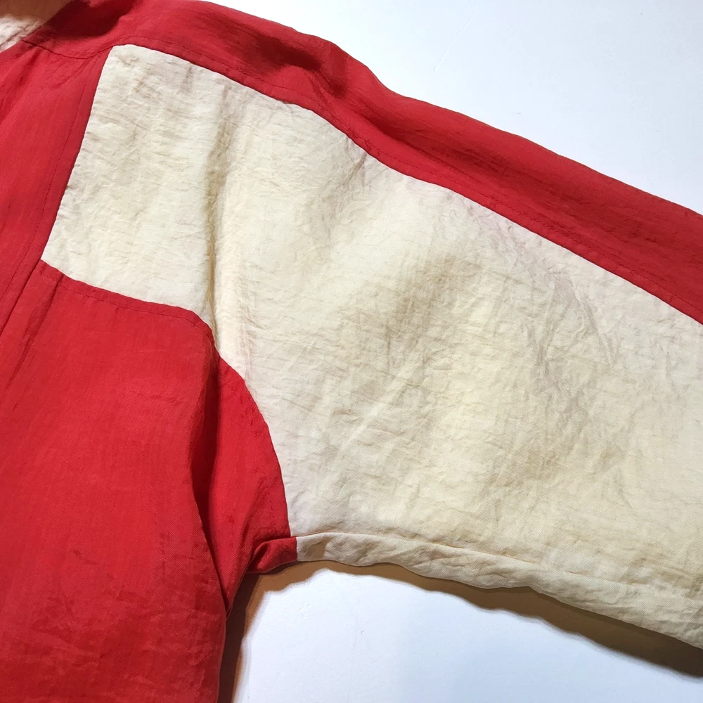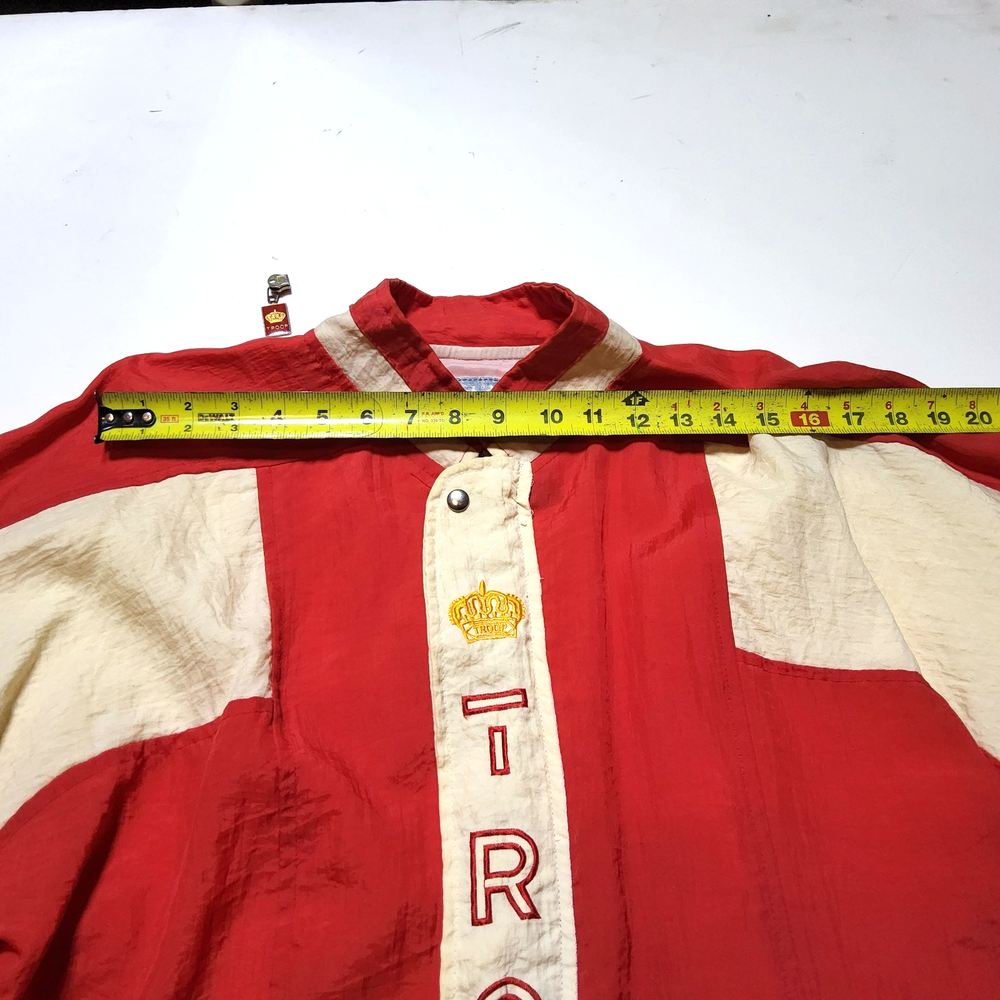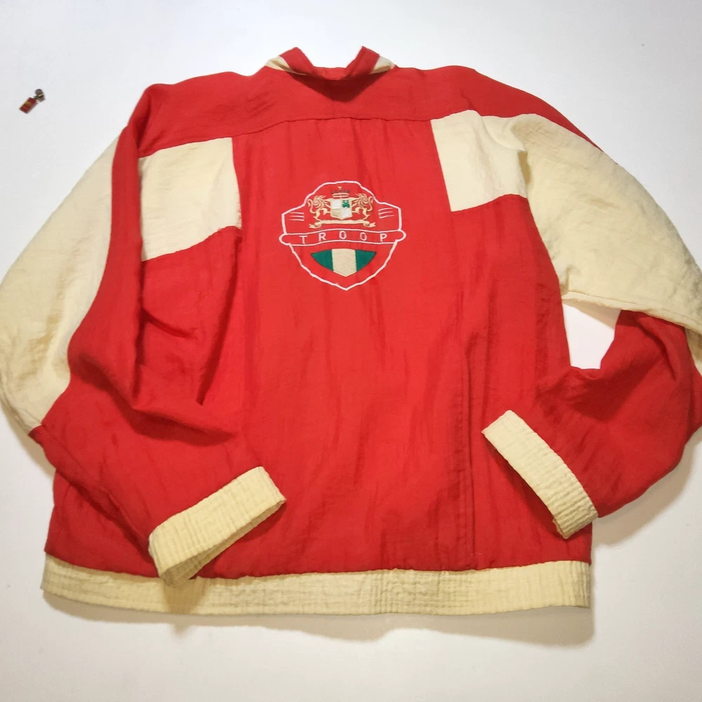 Can combine shipping on all orders. Vintage 80's world of troop windbreaker hip hop rap zip up jacket size large Had a new zipper installed cause the old one was busted. I specifically asked seamstress to install the signature Troop original zipper pull but didn't. Perhaps you can get it put on. Comes with jacket. Could use a nice oxy clean bath to get the brights out on cream colored sections. The reds, embroidery, and logos are crisp. Definitely early 80s. Definitely not owned by a breakdancer or else colors and fabric would be faded. All pre-owned clothes sourced from thrift stores,yard sales,estate sales,flea markets,etc. and have NOT been washed by me. My household is non smoking and do my best not to pick up stinky items.
