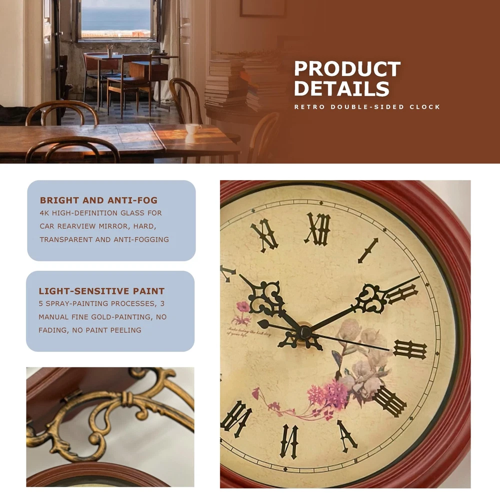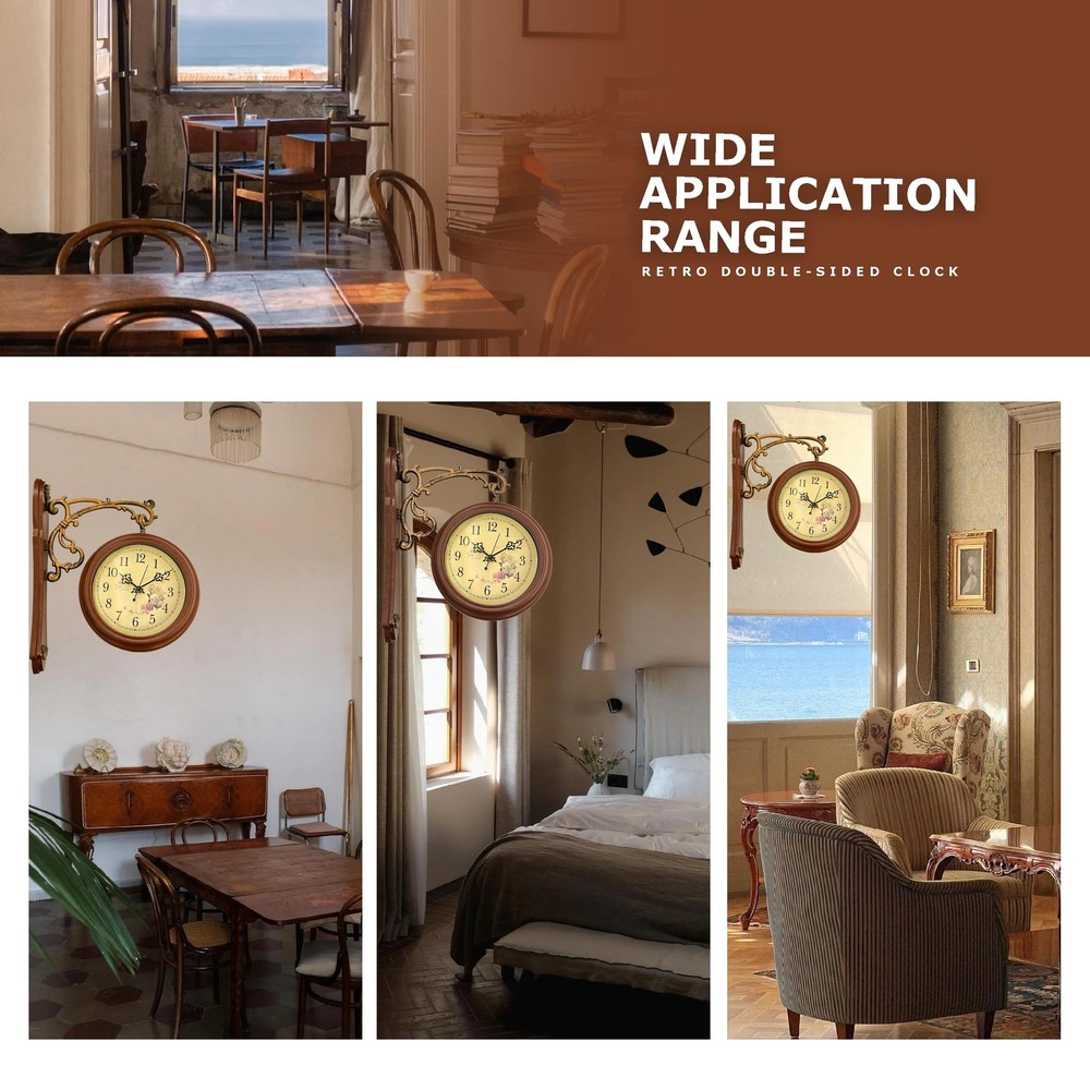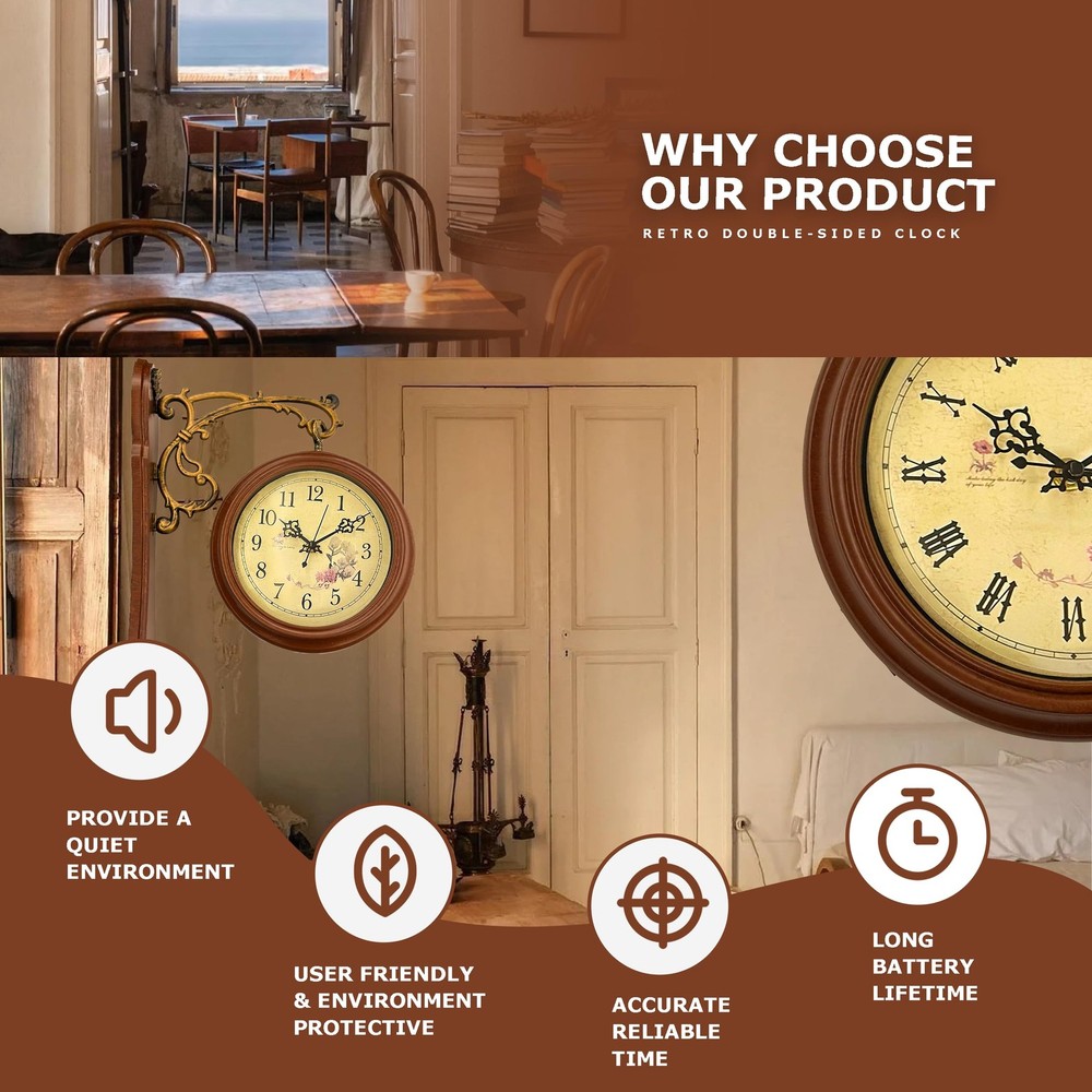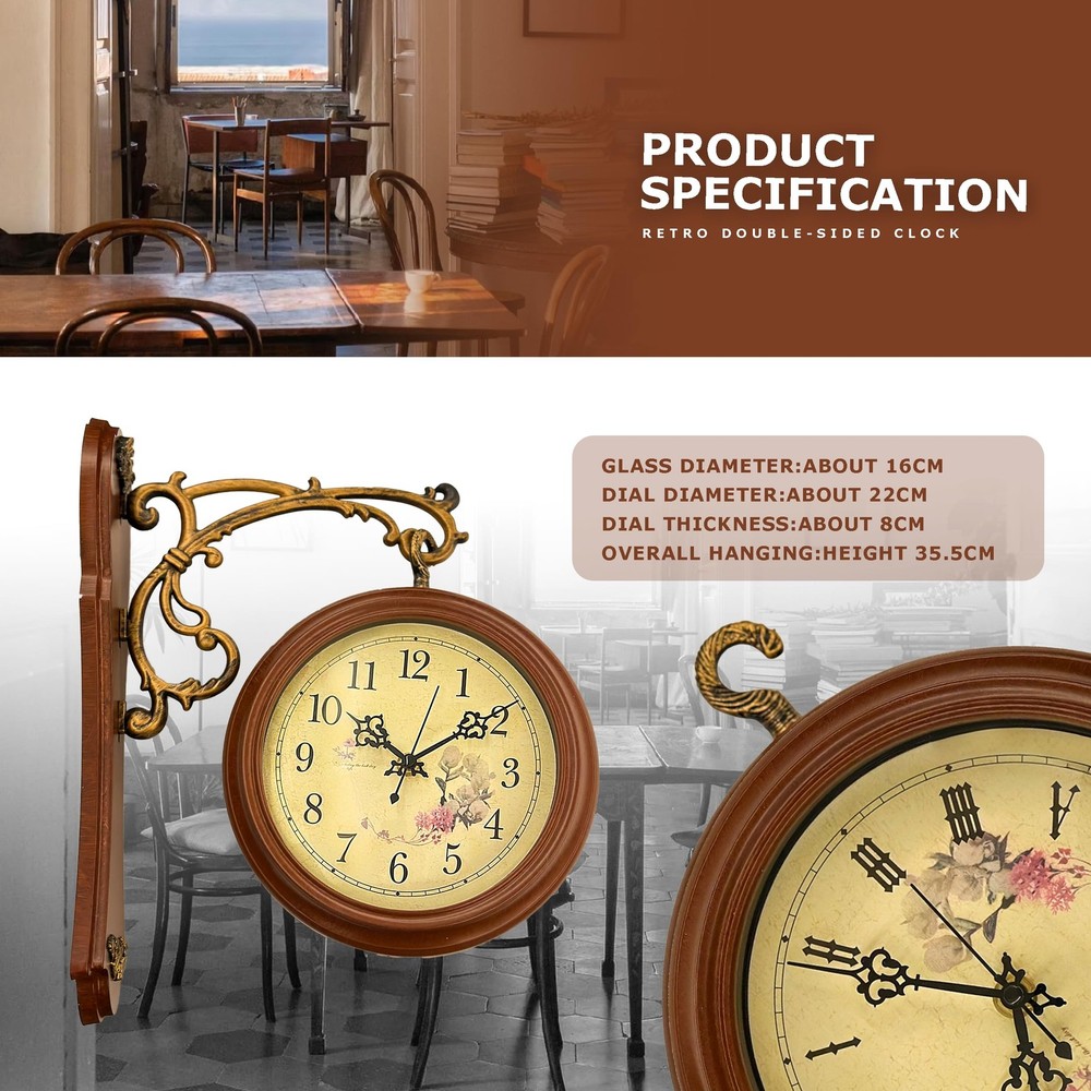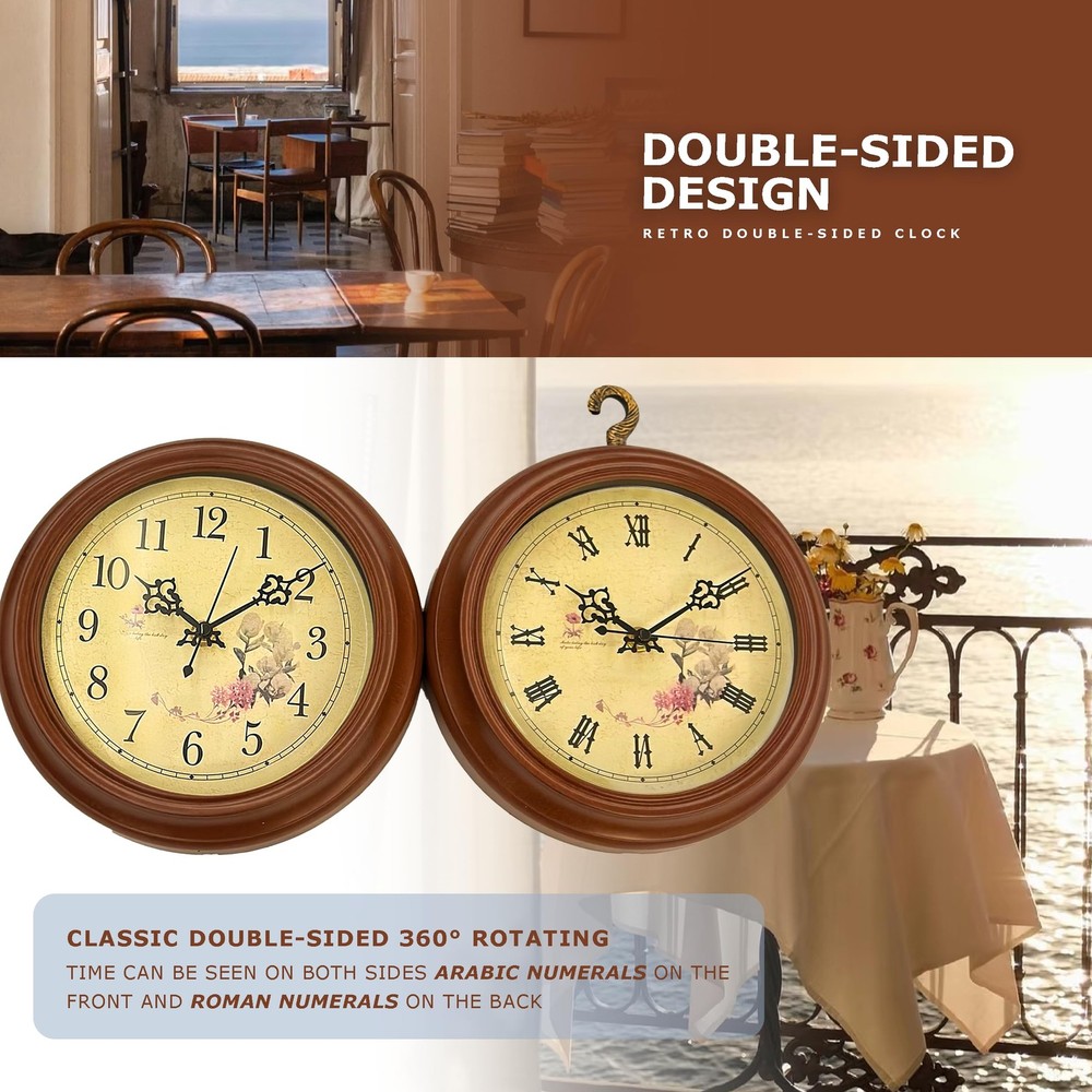 Bring timeless elegance to your space with this vintage double-sided wall clock. Featuring a 360° rotating design and dual clock faces, it allows you to read the time effortlessly from any angle. The intricate metal scrollwork, paired with a sturdy wooden base and antique finish, creates a stunning retro aesthetic that adds charm to any room. The aged yellow clock face, adorned with delicate floral patterns, evokes a nostalgic 20th-century feel, making it perfect for living rooms, studies, cafés, or shops. Equipped with a silent quartz movement, this clock ensures precise, noise-free timekeeping for a serene environment. The 9-inch large dial with bold numbers and elegant hands makes it easy to read the time from a distance, while its battery-powered(batteries and nails not included) design ensures hassle-free installation and maintenance. Both functional and decorative, this clock is a must-have for anyone seeking vintage-inspired decor. Built to Last – Quality You Can Trust Crafted with high-quality metal brackets and good quality glass, this clock features a wooden base accented by intricate metal embellishments, ensuring stability and long-lasting performance. Its evenly applied antique finish resists rust and fading, making it a timeless piece of decor that combines style and durability. Silent Quartz Movement – Pure Peace This clock is equipped with a high-quality quartz movement that delivers precise timekeeping while remaining completely silent. Whether you’re relaxing in a quiet bedroom or focusing in your study, this clock ensures a calm, distraction-free environment. Double-Sided Elegance – Time from Any Angle Why settle for one clock face when you can have two? This double-sided design allows you to read the time effortlessly from any angle, with both faces featuring the same exquisite vintage style. The beautifully detailed metal scrollwork and sturdy hanging structure make it a functional yet eye-catching addition to your home or shop. Classic Vintage Style – A Nostalgic Touch Step back into the elegance of the 20th century with this stunning vintage clock. The clock face features a beautifully aged yellow background adorned with delicate floral patterns, perfectly complemented by ornate metal scrollwork. Whether in a living room, study, or café, this clock adds a touch of old-world charm to any space. Easy to Read, Simple to Use The 9-inch large clock face, bold black numbers, and elegant hands make it easy to read the time from any distance. Powered by two AA batteries (batteries and nails not included), this clock is easy to set up and maintain. Both functional and stylish, it’s an essential addition to any retro-inspired decor.