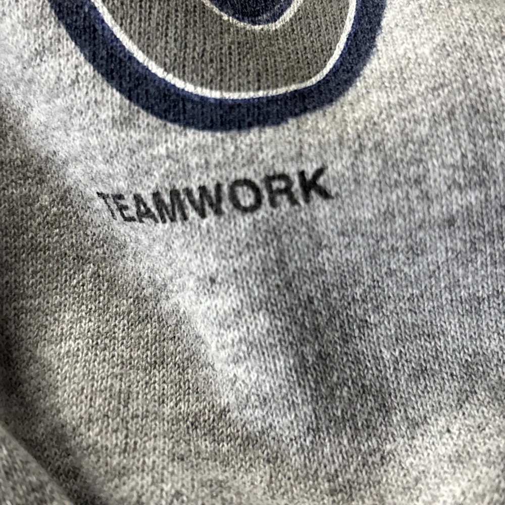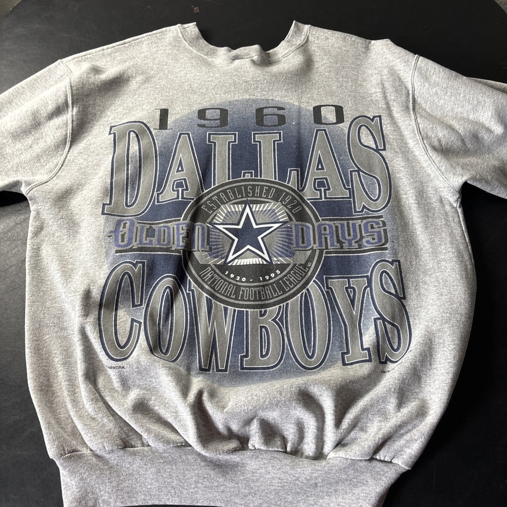 This vintage 90's TEAMWORK NFL Dallas Cowboys print sweatshirt is a stylish addition to any man's wardrobe. The gray color and XL size make it a versatile piece that can be easily paired with jeans or a casual outfit. The classic design and long sleeves give off a retro vibe, perfect for fans of the Dallas Cowboys or vintage sports memorabilia. Made with quality materials, this sweatshirt is a timeless piece that captures the essence of 90's style.