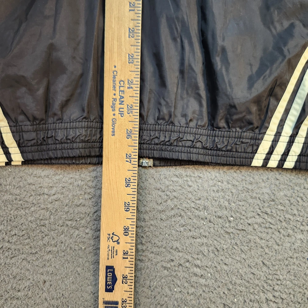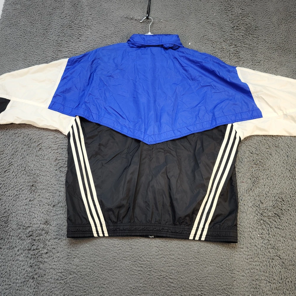 Vintage Adidas Jacket Mens Large Blue Black White Trefoil Windbreaker 90s Retro Condition: Good – minor signs of general wear, light discoloration on white sleeve panels and some overall wrinkling, no holes or major damage Classic Adidas trifecta colorblock windbreaker in blue, black, and white Features iconic embroidered Adidas Trefoil logo on chest Full front zip closure Mesh lining for breathability Two front zip hand pockets Signature three-stripe detailing down sides and sleeves Material tag not visible, feels like nylon shell with polyester mesh lining Tag size: Large (Mens) Approximate flat measurements: Pit to pit 26.5 inches, back length 27.5 inches Authentic vintage Adidas piece from the 1990s with retro styling Perfect for streetwear, track, or casual athletic outfits