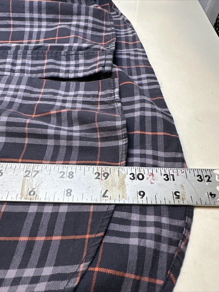 Elevate your wardrobe with this classic Burberry Nova Check button-up shirt. Made of 100% cotton, this navy plaid shirt features short sleeves and a collared neckline, making it perfect for travel, casual outings, or business meetings. The shirt is vintage from the 90s and has a regular fit, with button accents and a woven fabric type. The Burberry shirt is perfect for men who want to add a touch of vintage style to their wardrobe. The Nova Check pattern and 90s theme make it a unique and stylish choice for any occasion. This shirt is available in size L and is a great addition to any collection. In excellent used condition. A couple of pulled threads on bottom see pics