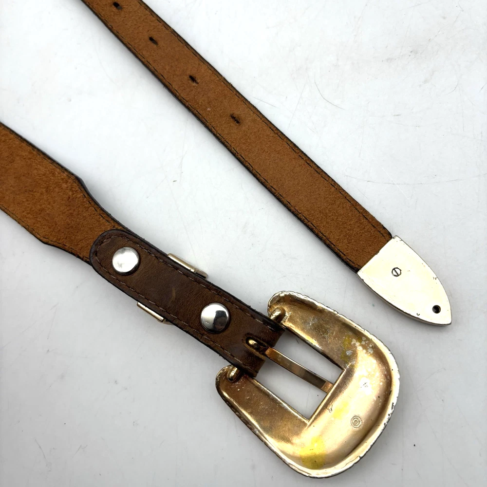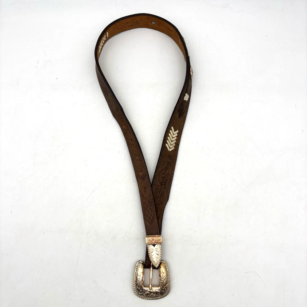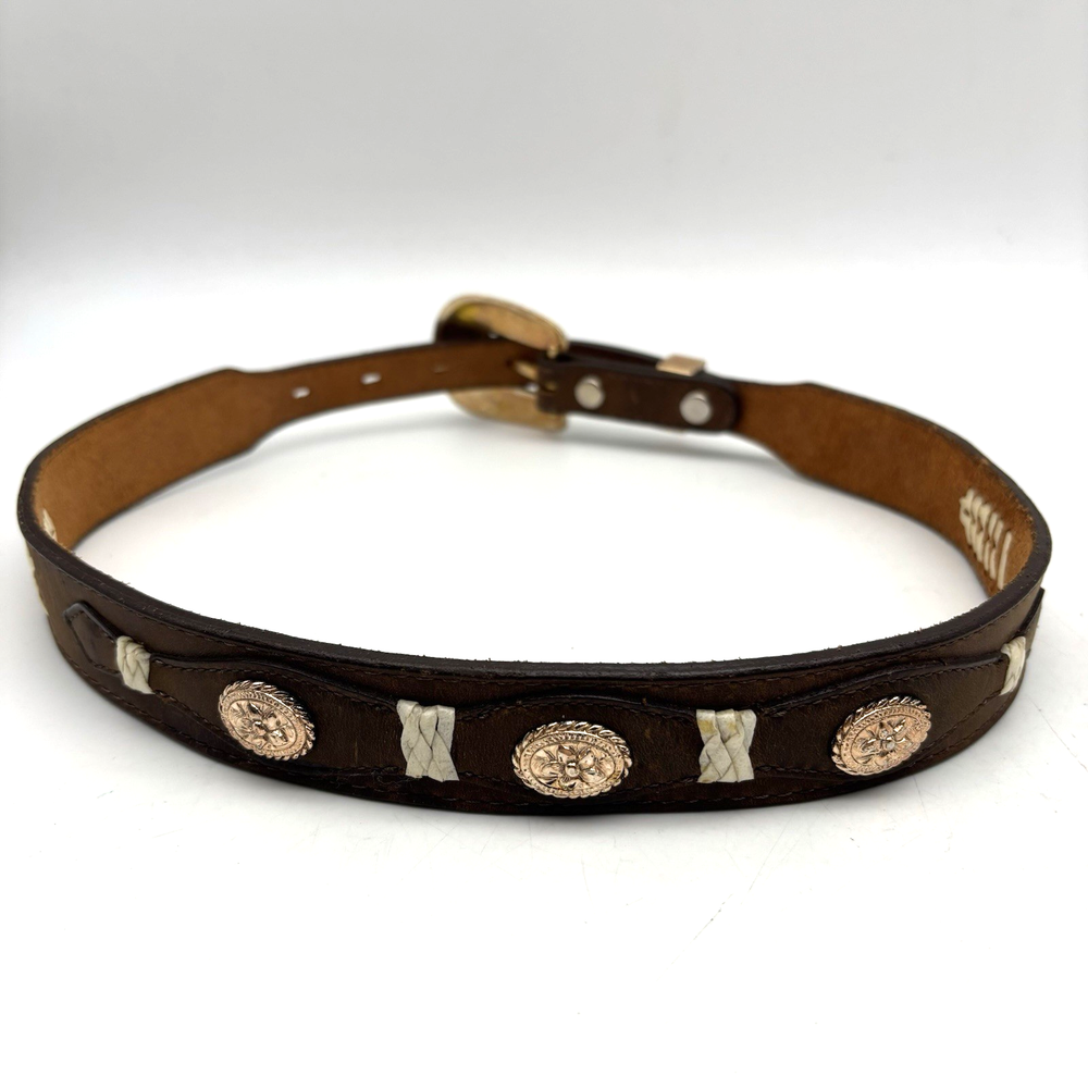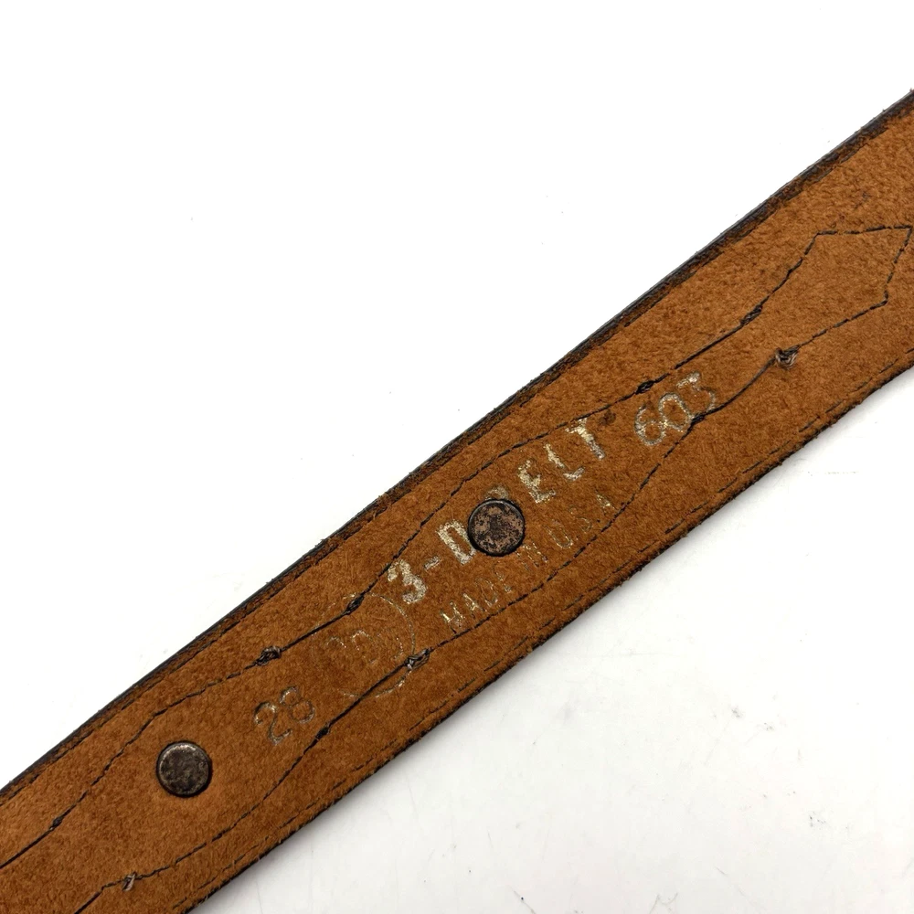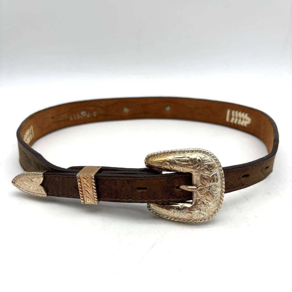 Vintage 90s 3D Women's Western Belt Made in USA Style Code: 603 Brown Genuine Leather White Whipstitch Accents Three 1/2" x 3/4" Oval Rose Gold-tone Floral Conchos Rose Gold-tone Floral Engraved Interchangeable Buckle Women's Size 28 Refer to measurements below to ensure accurate fit before purchase! Buckle: 2" long 2" wide Belt Measurements: 1 1/8" wide 3/4" wide at ends 33" full length from buckle prong to belt end 25" smallest hole 29" largest hole 5 holes total Great vintage pre owned condition. Very gently owned. No rips, tears, stains, holes or other notable flaws. Clean and from a smoke free home.