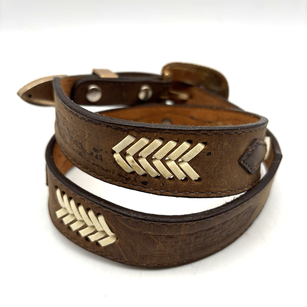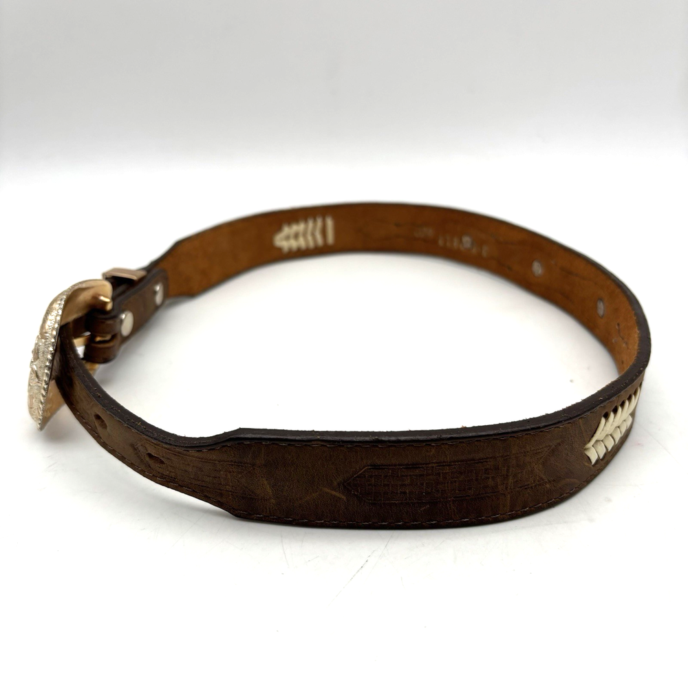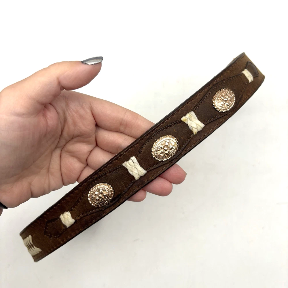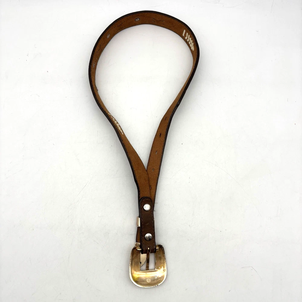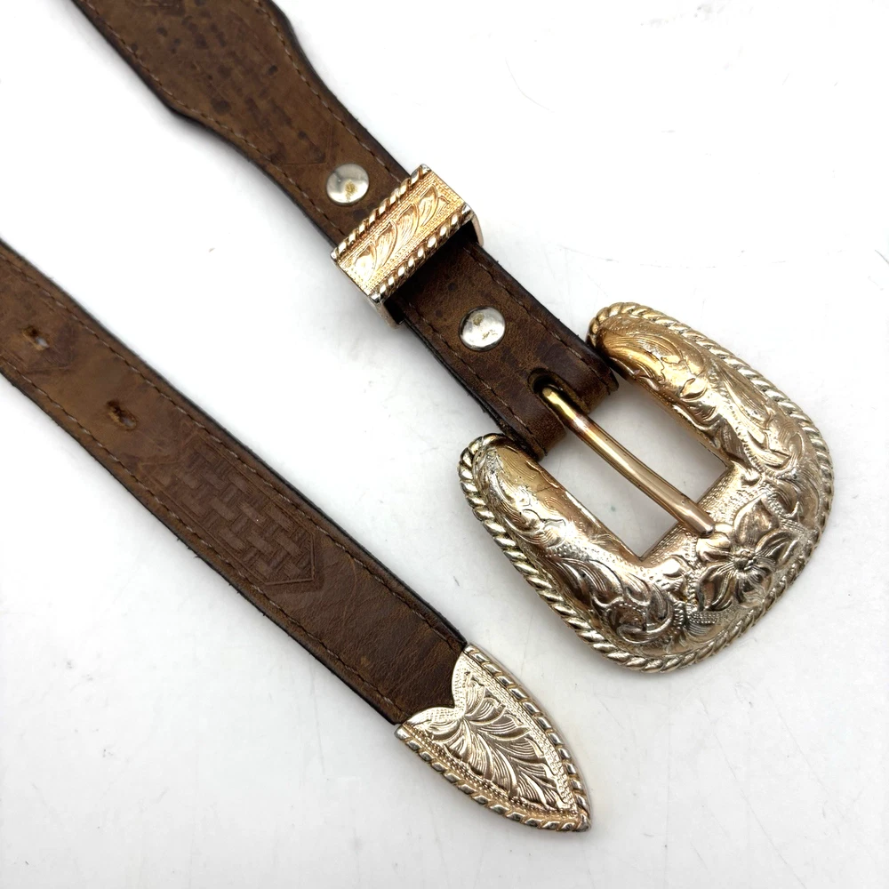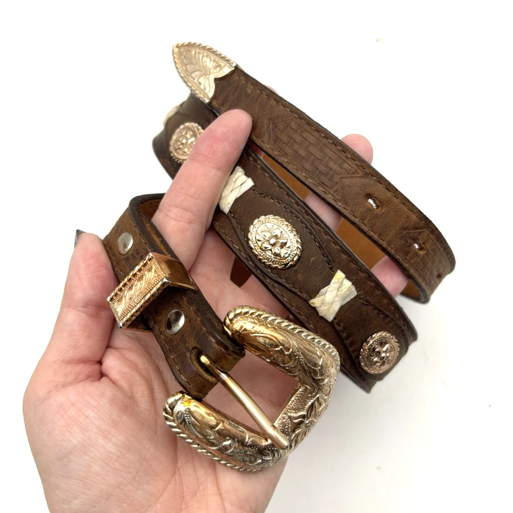 Vintage 90s 3D Women's Western Belt Made in USA Style Code: 603 Brown Genuine Leather White Whipstitch Accents Three 1/2" x 3/4" Oval Rose Gold-tone Floral Conchos Rose Gold-tone Floral Engraved Interchangeable Buckle Women's Size 28 Refer to measurements below to ensure accurate fit before purchase! Buckle: 2" long 2" wide Belt Measurements: 1 1/8" wide 3/4" wide at ends 33" full length from buckle prong to belt end 25" smallest hole 29" largest hole 5 holes total Great vintage pre owned condition. Very gently owned. No rips, tears, stains, holes or other notable flaws. Clean and from a smoke free home.