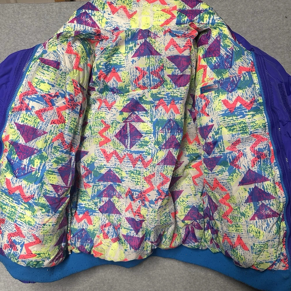 The Vintage Columbia Neon Bugaboo Ski Jacket is a retro piece from the 90s, featuring a colorful multicolor design with a unique radial sleeve and zipper accents. Made from durable nylon, this 3-in-1 jacket is perfect for casual occasions and outdoor activities like skiing and snowboarding. With waterproof features and multiple pockets for convenience, this Columbia Bugaboo Interchange model is a stylish and functional choice for men looking to add a touch of nostalgia to their winter wardrobe. This coat is in great shape and made fully of reflective material. You have the blue coat that lines the purple coat. The coat is reversible to full neon print that you can see in the interior of the coat.