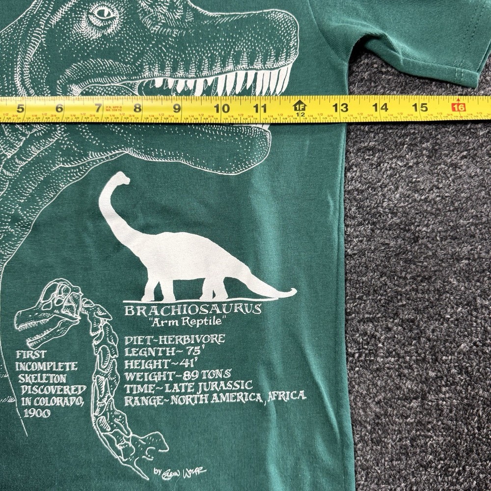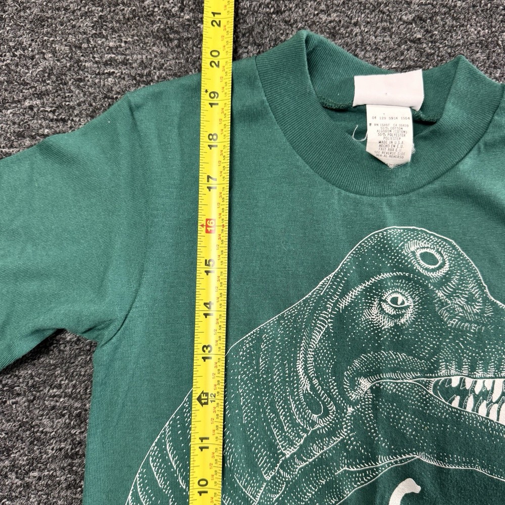 This Vintage 90s Dinosaur Information Green Art T-Shirt in size S (8) is a perfect choice for young boys interested in dinosaurs, art, and retro themes. The short sleeve, crew neck shirt features a graphic print of a dinosaur scene, adding an element of fun and education to their wardrobe. Made by Garan, the pullover T-shirt is ideal for summer, fall, and spring seasons, making it a versatile and stylish addition for any young boy's closet. The photos are the BEST indication of the condition please use the presented photos before purchasing the item. Thank you for checking out our page and let us know if you have any questions!