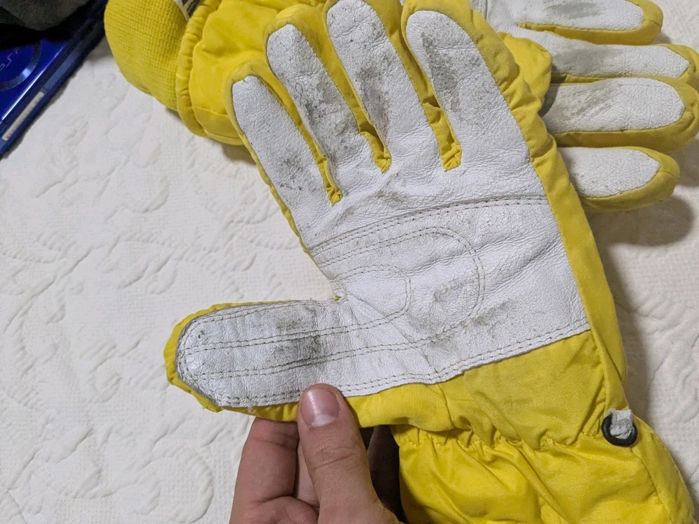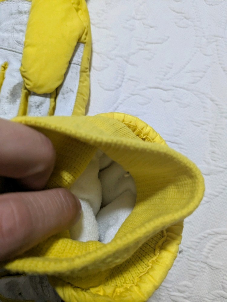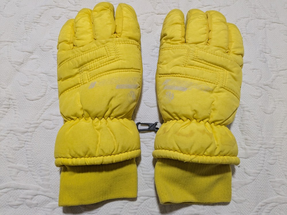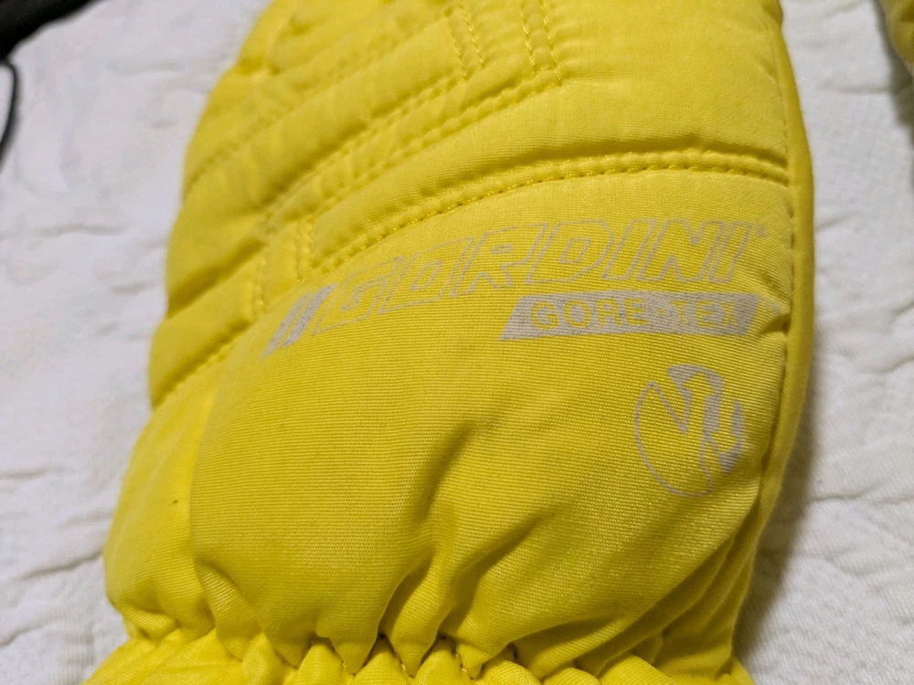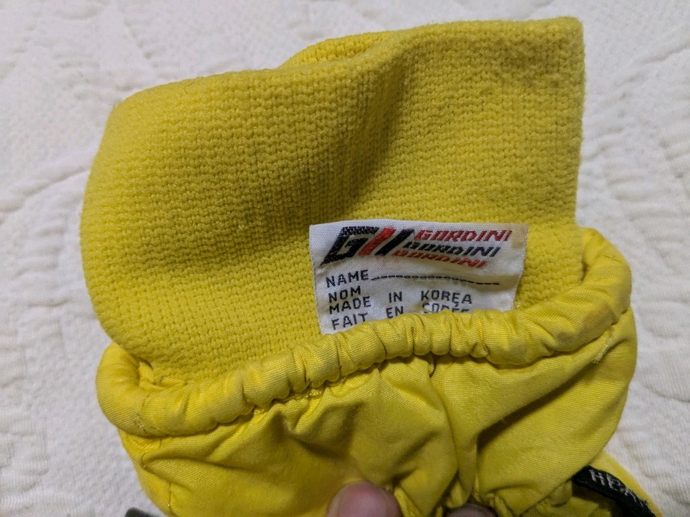 As you can see the grip area is coming undone a little bit. Please ask if you have any questions at all. I'll be happy to answer them. These have plenty of life left in them. Vintage 90's Gordini Winter Gloves in yellow and black color, featuring Gortex material for waterproofing. These large-sized ski gloves are made of 100% Nylon with polyester insulation. The design includes a logo accent, suitable for winter sports like skiing. Made in Korea, Republic of, these neon-themed gloves are a stylish and functional choice for men.