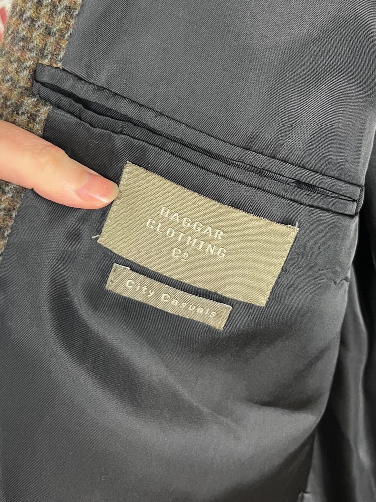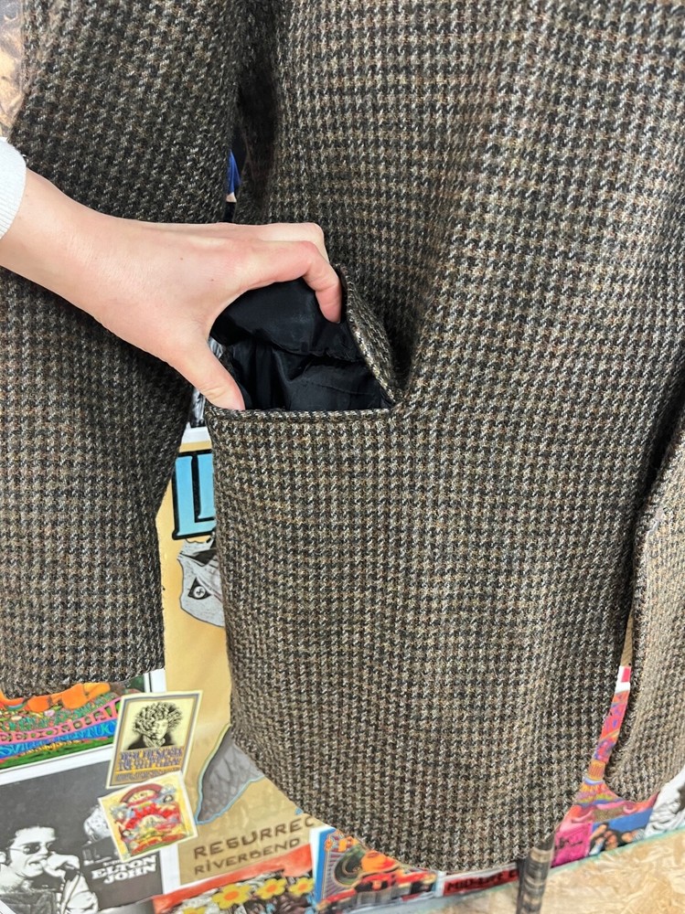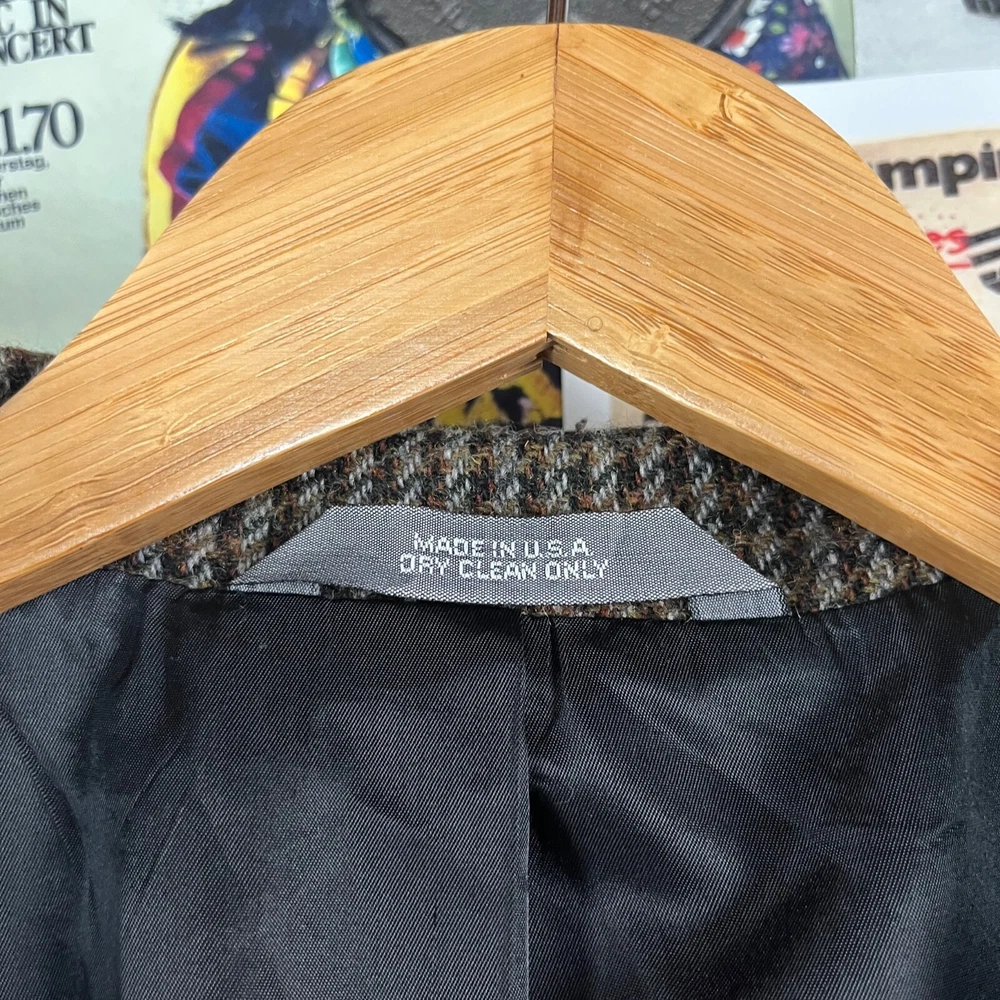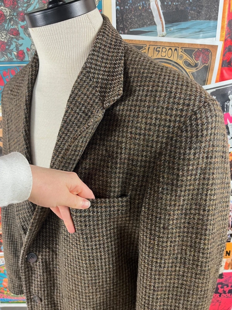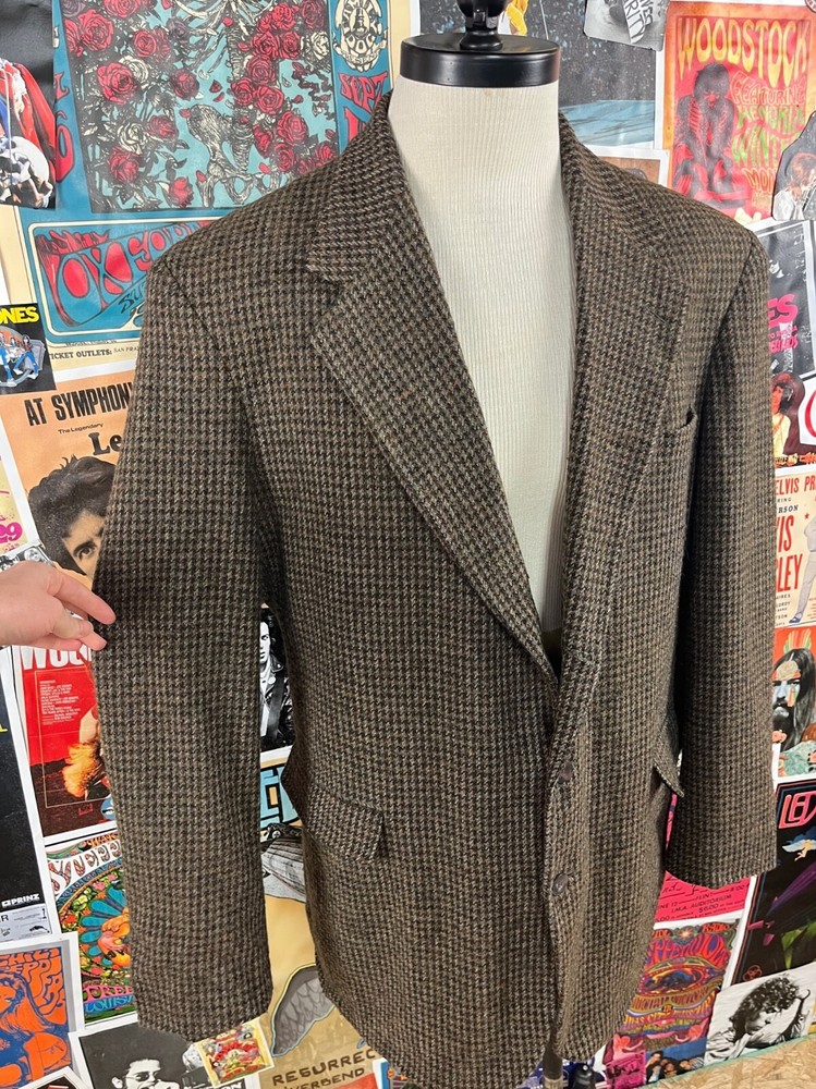 Vintage men's 90s brown tweed houndstooth single breasted sport coat by Haggar. Tagged size 44L. In good, pre-owned condition. Features built in shoulder pads. shoulders -- 20" chest -- 44" waist -- 43" sleeve length from shoulder seam -- 26" bottom of collar to sleeve cuff -- 33" total length -- 33.5" *please note any shipping overages will be refunded