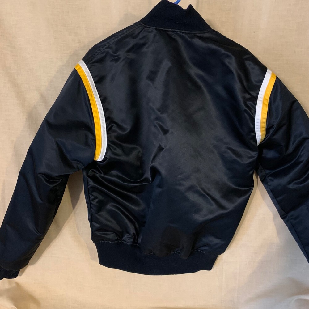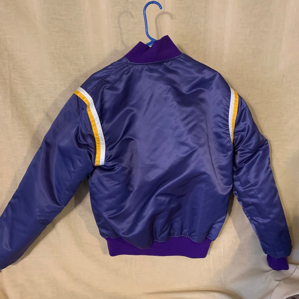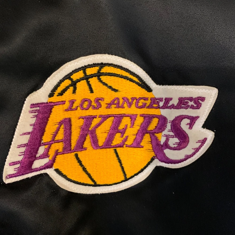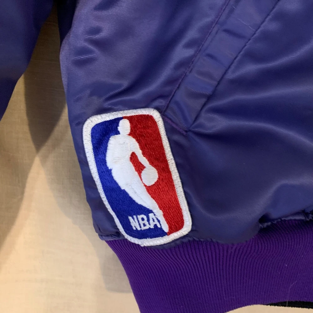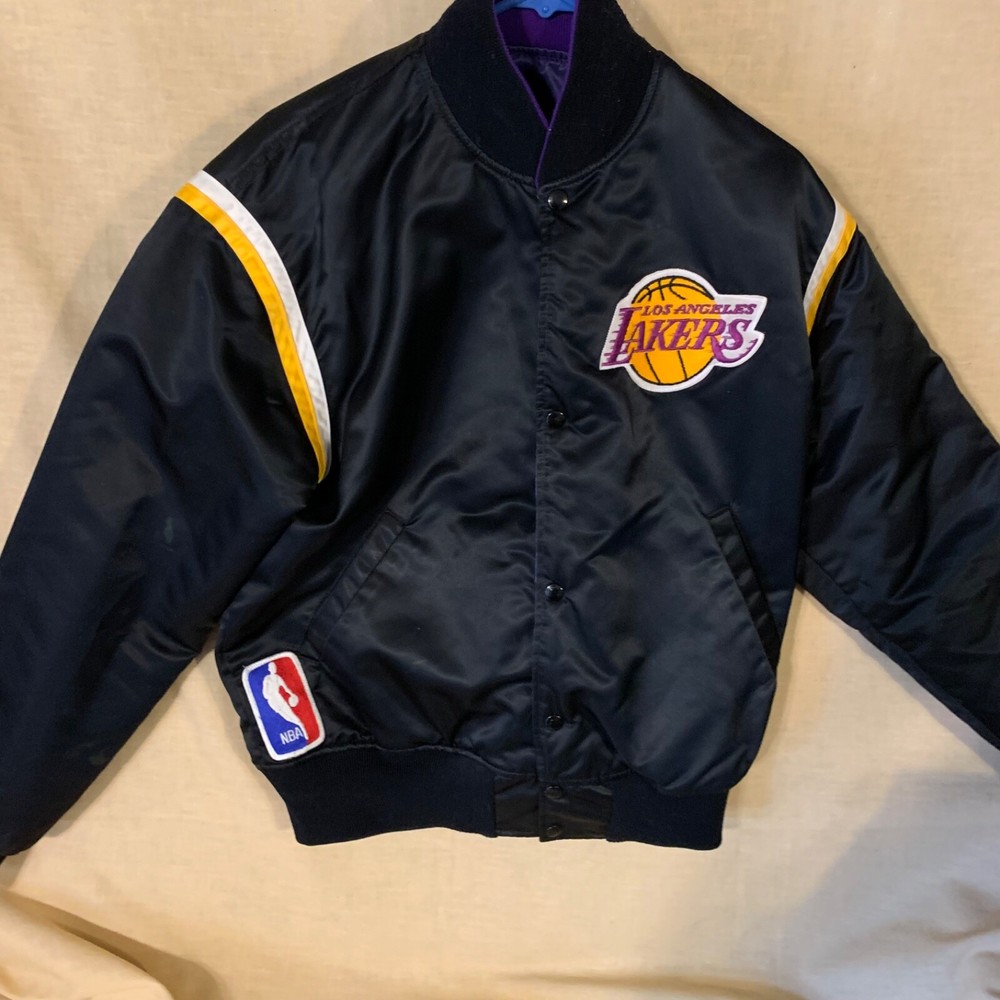 Show your love for the Los Angeles Lakers with this vintage 90s Starter satin reversible jacket. The black and purple color combination is perfect to represent your favorite team during regular season games. This jacket is officially licensed by the National Basketball Association (NBA) and is unisex, making it a great fan apparel for any basketball enthusiast. The jacket is size XL and made in the United States. It features the Los Angeles Lakers team logo and is perfect for both men and women. Whether you are going to the game or just want to show off your team spirit, this jacket is a must-have for any Lakers fan.