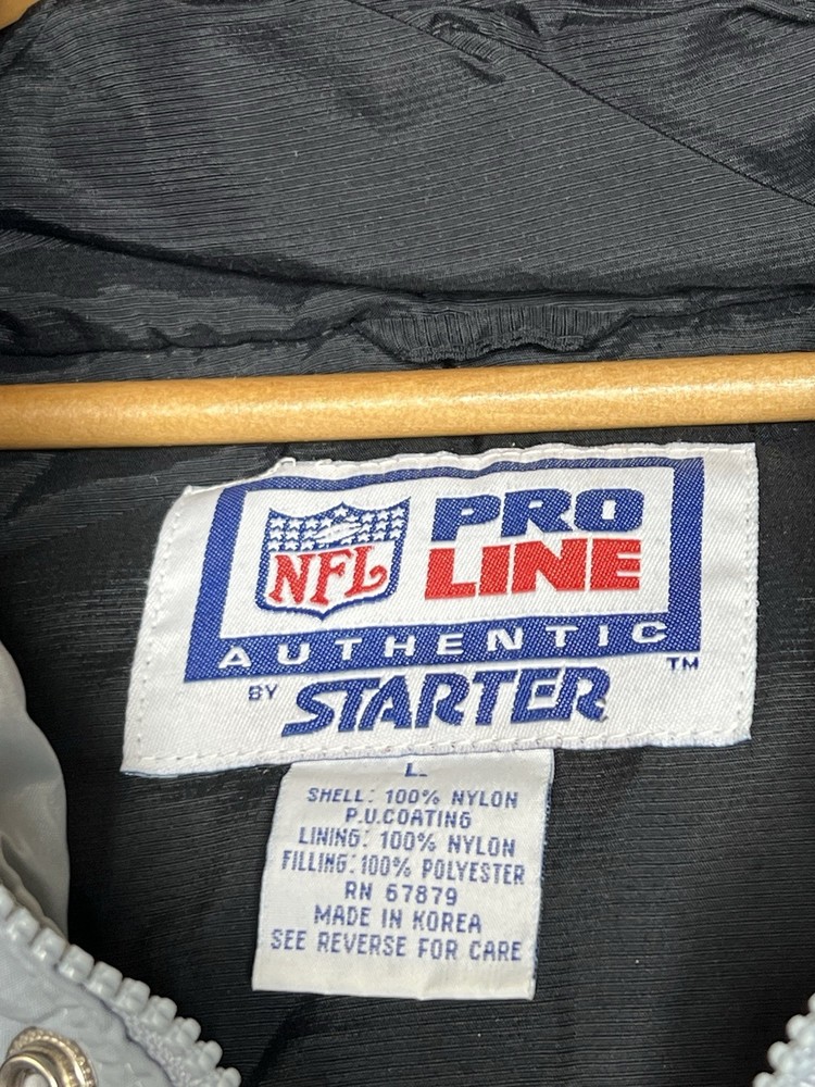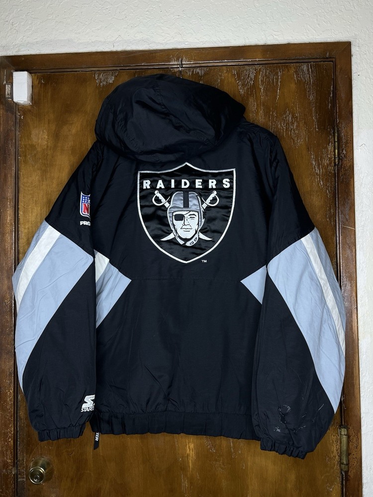 Color: Black Style: Puffer Jacket Type: Jacket Country/Region of Manufacture: Korea, Republic of Size Type: Regular Features: Lined Department: Men Jacket/Coat Length: Mid-Length Brand: Starter Outer Shell Material: Nylon Product: Jacket Lining Material: Nylon Closure: Zip Fit: Regular Pattern: Geometric Sport: Football League: National Football League (NFL) Team: Oakland Raiders Vintage: Yes Size: L Gender: Men Theme: 90s