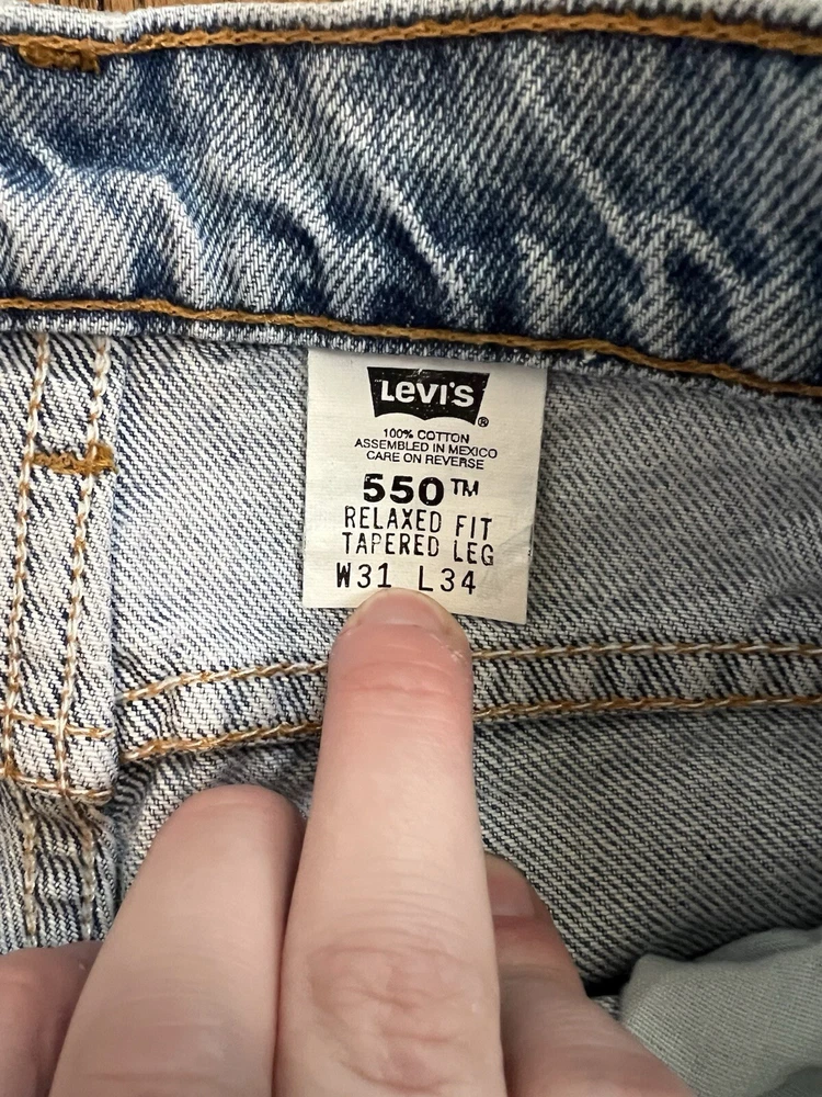 Size Type: Regular Material: Cotton Pattern: Solid Country/Region of Manufacture: Mexico Inseam: 34 in Closure: Zip Fabric Wash: Light Department: Men Theme: 90s Color: Blue Waist Size: 30 in Vintage: Yes Style: Tapered Size: 31 Model: Levi's 550 Type: Jeans Brand: Levi's Fit: Relaxed