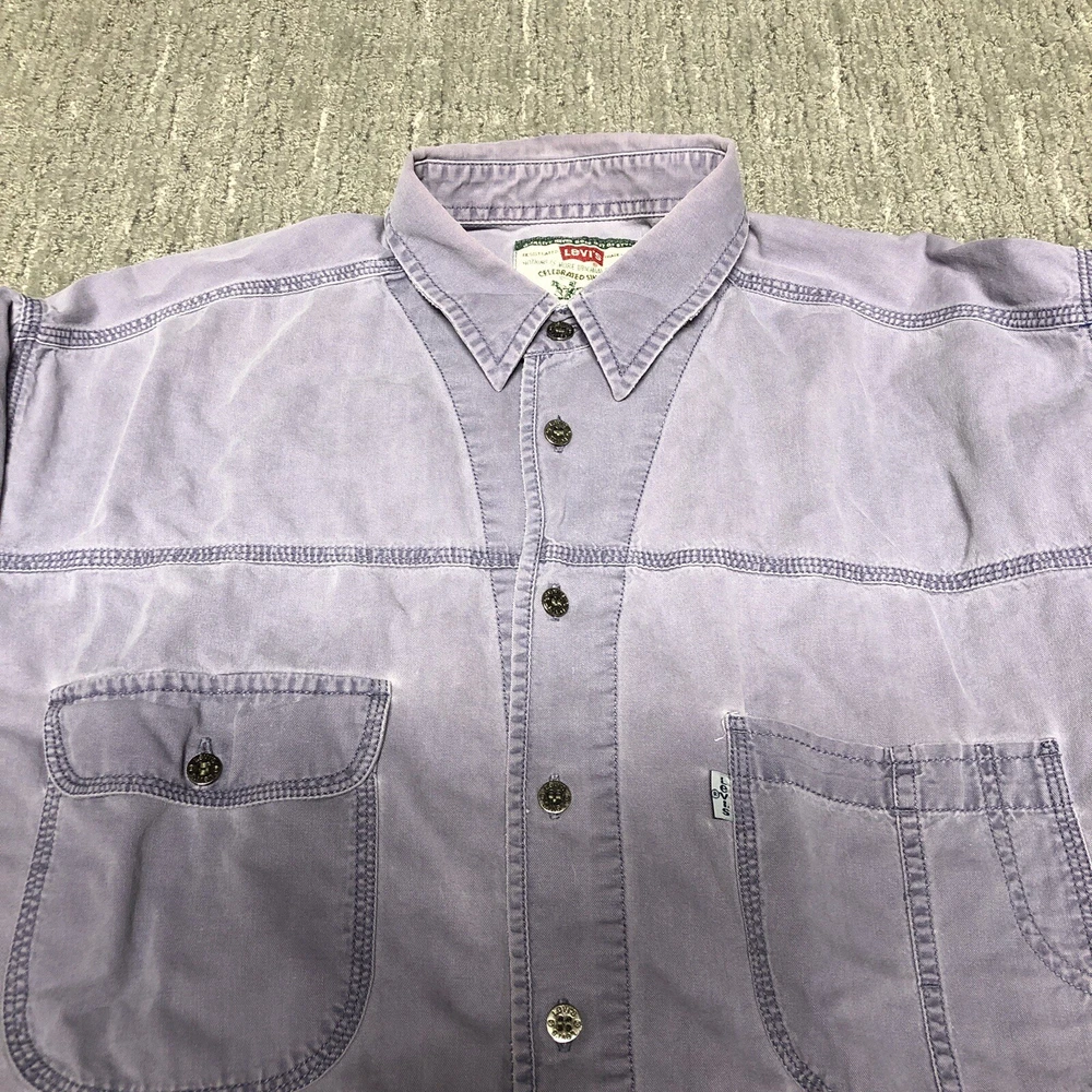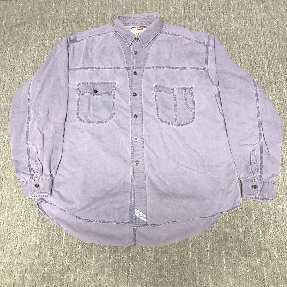 Vintage 90s Levi’s Denim Button Up Shirt Men’s Size L Purple Western Cowboy Preowned Good condition No major flaws that stand out. May have some minor spot that I missed. Size part of tag is missing, measurements are in pictures Please see pics and ask questions before purchasing Thanks!