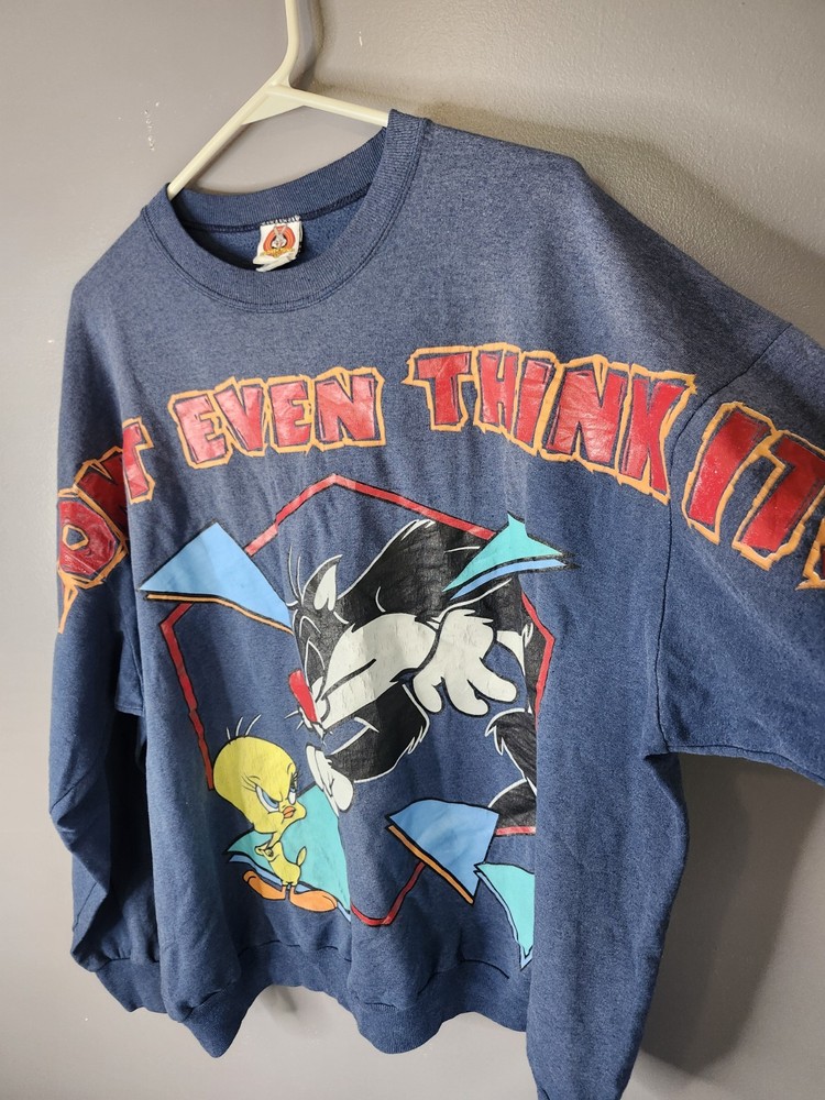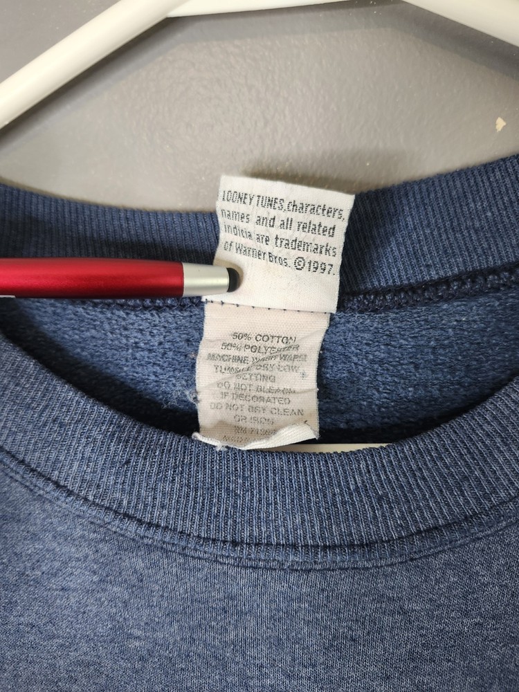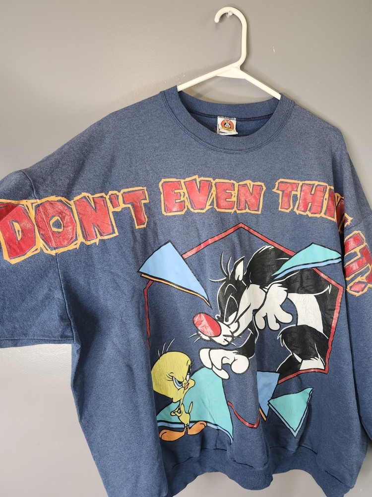 This Vintage 90s Looney Toons Sylvester Tweety Crewneck Sweatshirt in size 2XL is a graphic print sweatshirt featuring iconic Looney Tunes characters like Sylvester and Tweety. Made of cotton knit fabric in a blue color, this classic pullover sweatshirt with a crew neckline and long sleeves is suitable for all seasons and various activities such as gym training, walking, and running. The vintage design, retro theme, and heavyweight construction make it a timeless piece for fans of 90s cartoons and vintage style fashion. Made in the United States, this unisex sweatshirt is a must-have for collectors and enthusiasts of classic Looney Tunes memorabilia. I ship IMMEDIATELY 🚢 💖