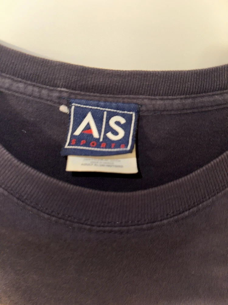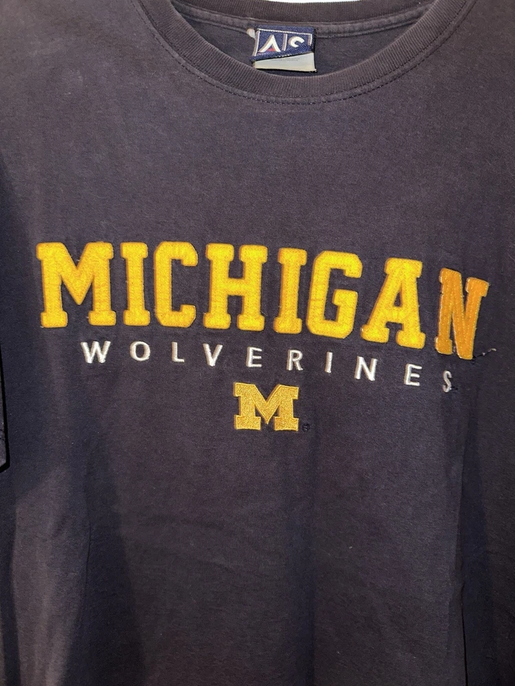 Show your love for the Michigan Wolverines with this vintage 90s NCAA college T-shirt from AS Sports. The shirt features an embroidered pattern with the team's name and a navy blue color that represents the team's spirit. It has short sleeves and is made of cotton, making it comfortable to wear during the summer, fall, and spring seasons. This regular fit T-shirt is perfect for men who want to represent their favorite college football team. Its size is L, and it is suitable for casual occasions. The Wolverine character and the 90s theme add an extra touch of nostalgia. Get your hands on this AS Sports product line and wear it with pride!