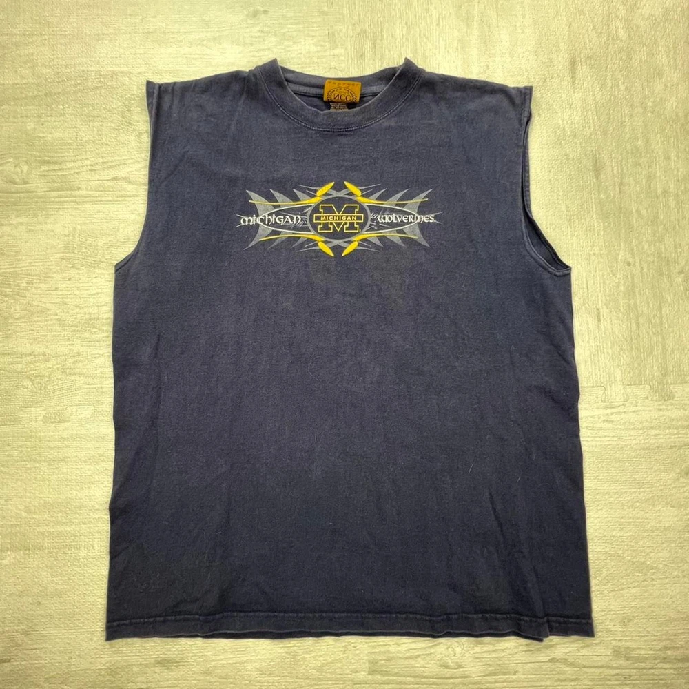 Vintage 90s university of Michigan wolverines navy yellow sleeveless t shirt tee NCAA college sportswear streetwear retro boho Size: XL Pit to pit: 23 Length: 29