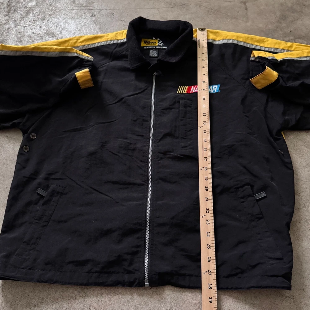 Vintage-inspired NASCAR racing jacket, featuring a bold black and yellow color scheme with reflective accents. This full-zip windbreaker showcases the Nikon Binoculars logo on the collar, along with prominent NASCAR branding on the front and back. Type: Jacket Style: Windbreaker Outer Shell Material: Nylon Department: Men Color: Black Lining Material: Polyester Insulation Material: Polyester Fabric Type: Microfiber Features: Reflective, Full Zip, Lined Pattern: Solid Accents: Logo, Reflective Stripe Model: Nikon NASCAR Racing Keywords: Nikon, NASCAR, racing jacket, windbreaker, full zip, black yellow jacket, vintage jacket, retro jacket, motorsport, race car, mens jacket, XL jacket, reflective jacket, NASCAR jacket