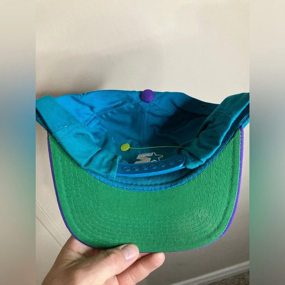 Charlotte Hornets hat from 1990s by Starter. Blue and purple with embroidered logo. Good condition other than some light staining on logo, as seen in the images. One size fits all