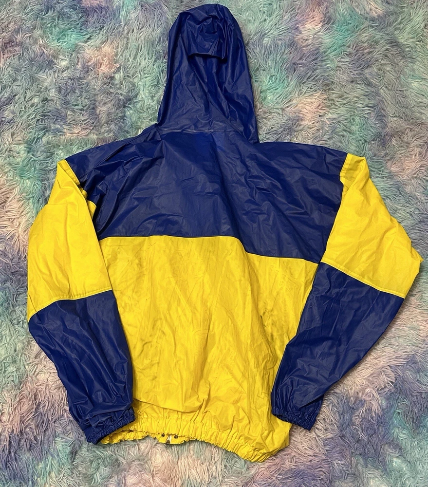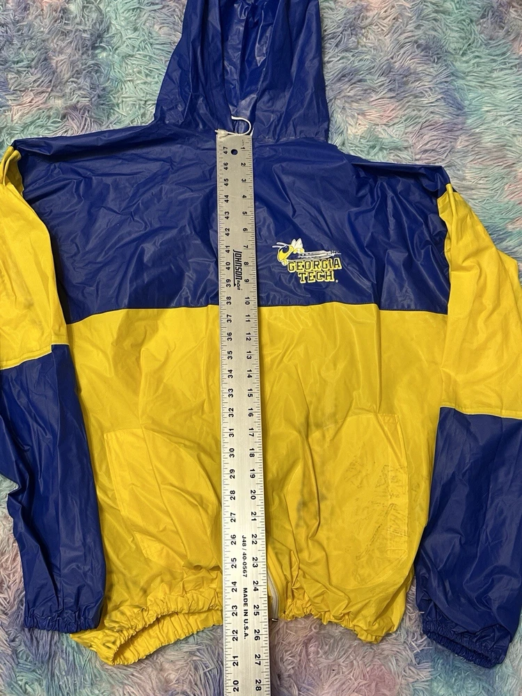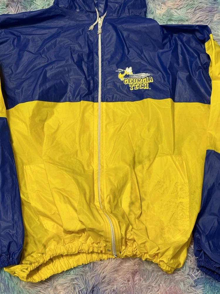 This vintage 90s NCAA Georgia Tech Yellow Jackets Windbreaker Rainmate Jacket is a must-have for any football fan. Show off your team spirit with this officially licensed, Genuine Stuff brand jacket. The blue jacket features the Georgia Tech Yellow Jackets team logo and is made from high-quality materials. It's perfect for regular season games and is available in size L. This jacket is designed for men and has a unique style that will make you stand out from the crowd. The jacket is made in Indonesia and is a great addition to any sports memorabilia collection.