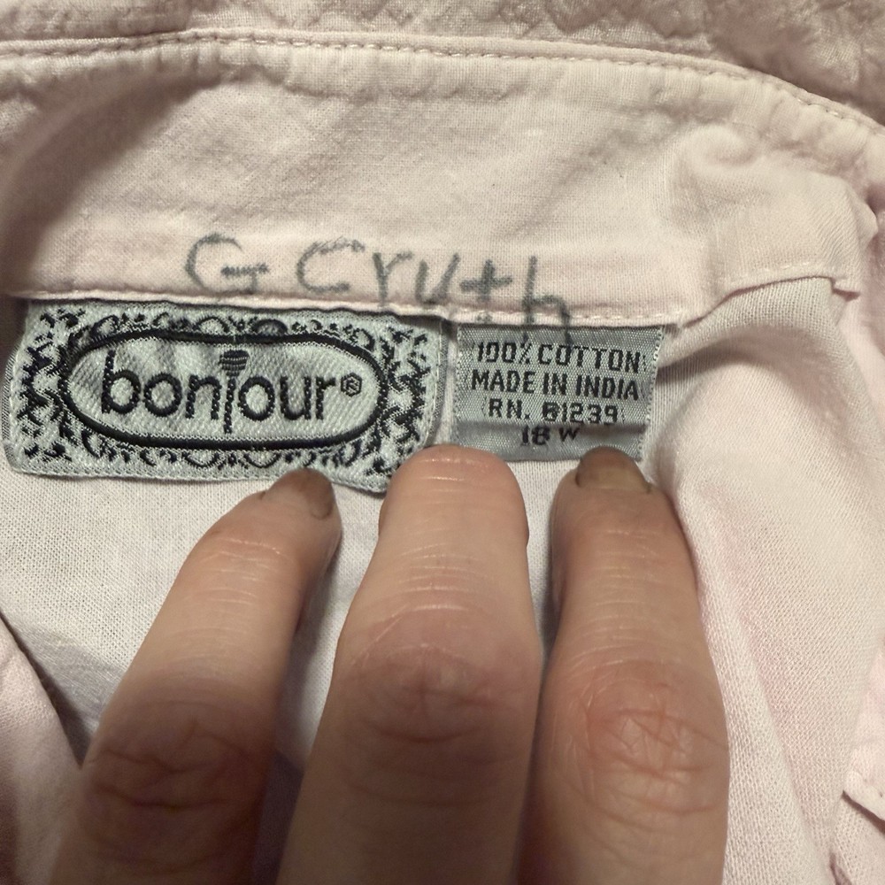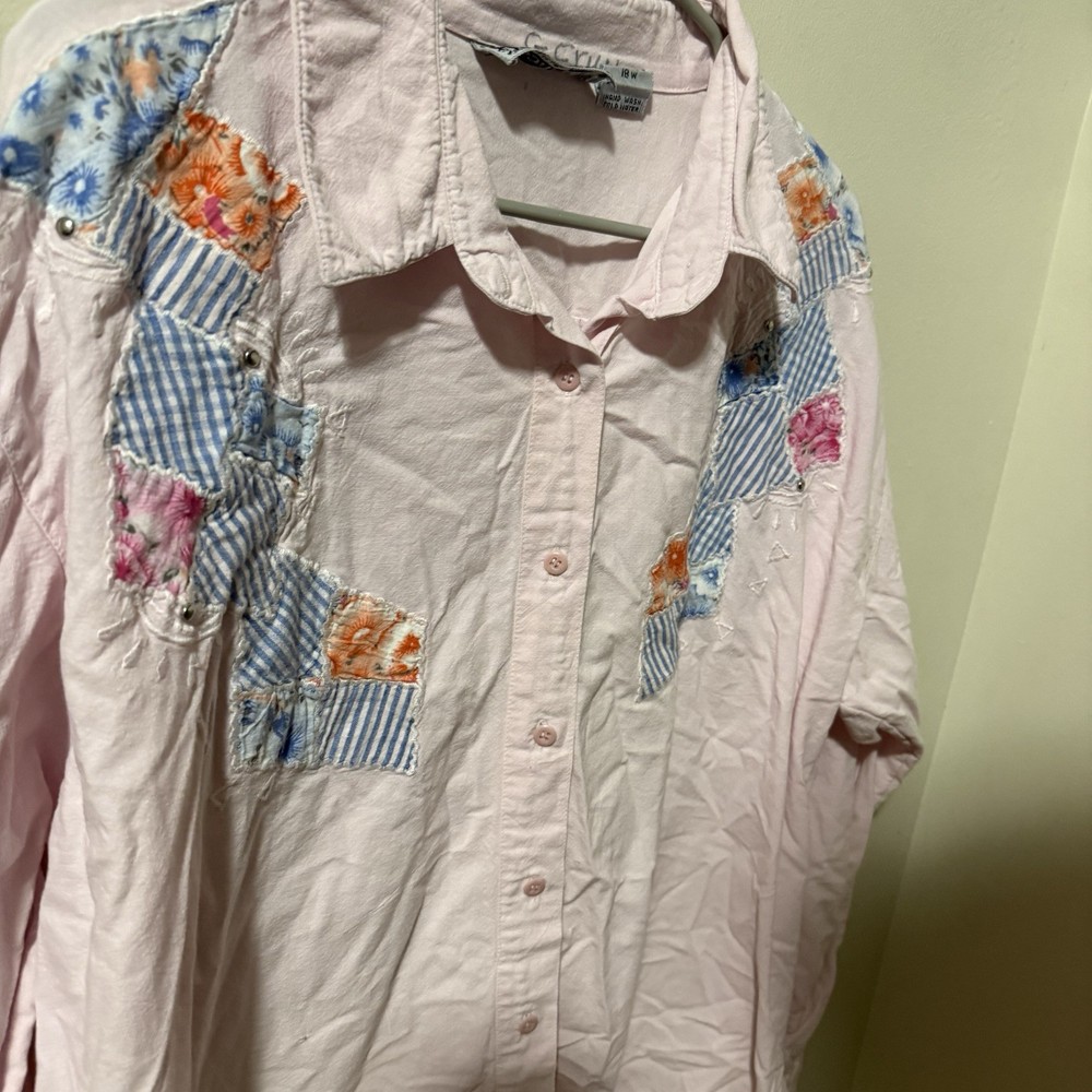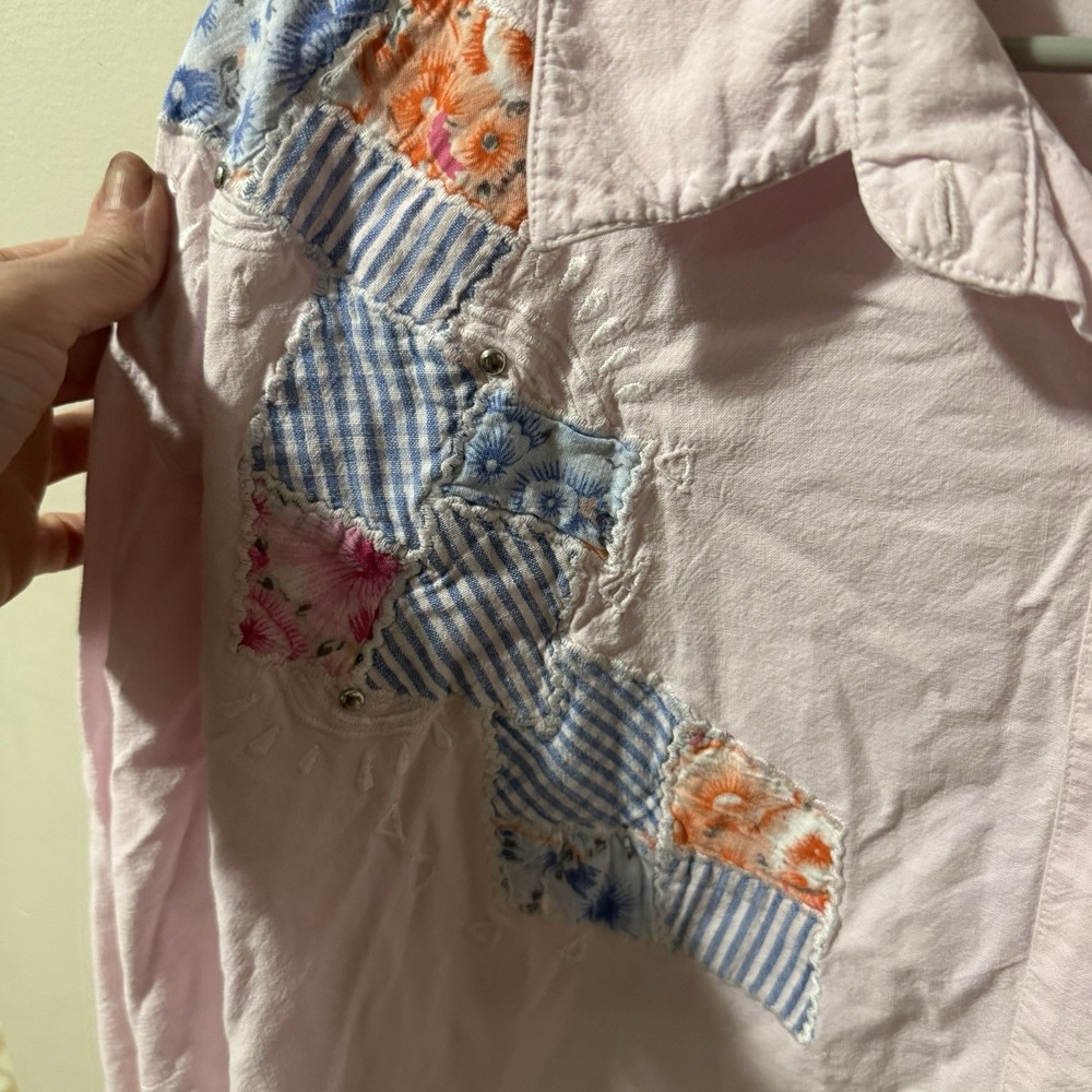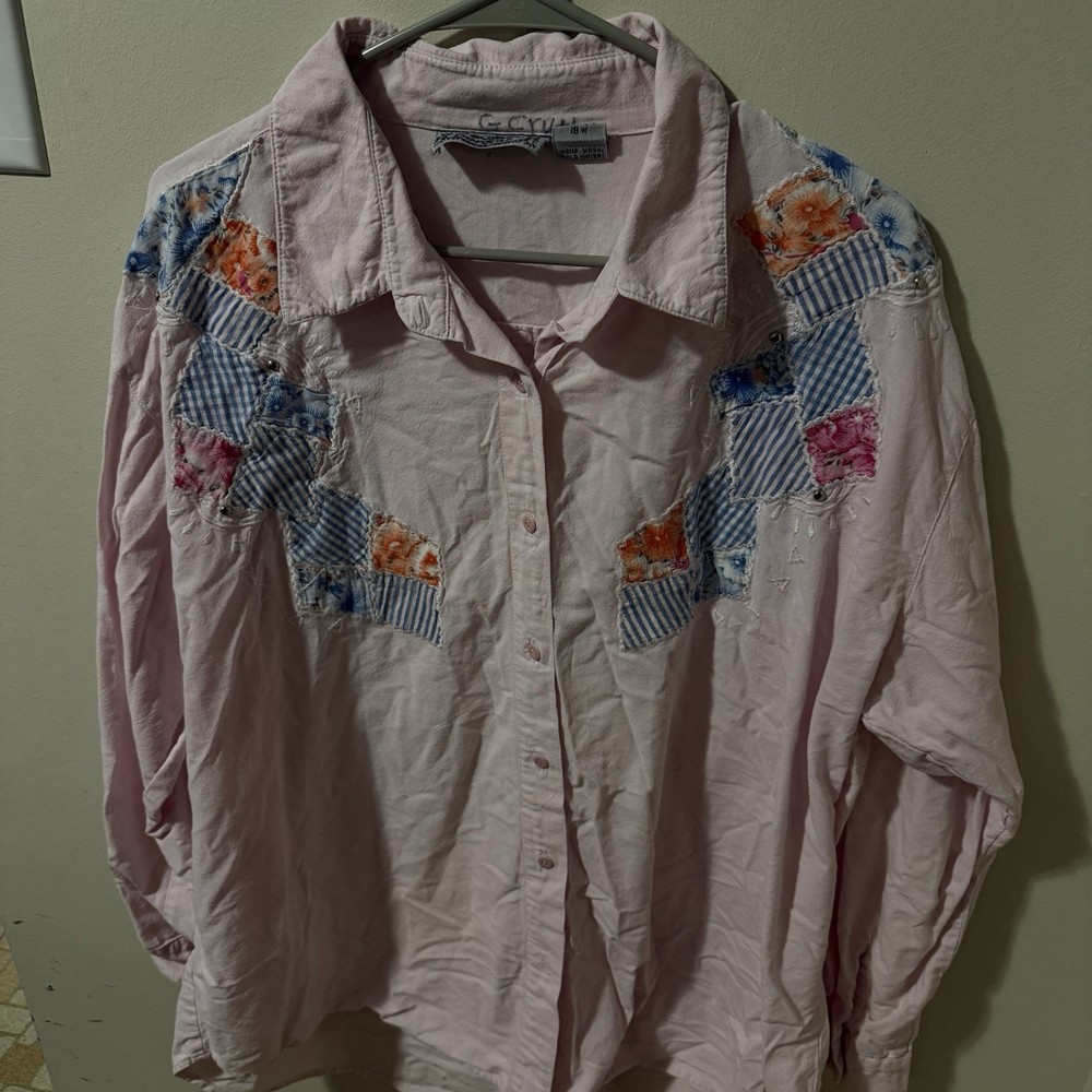 Add a romantic 90s cottagecore touch to your wardrobe with this vintage Bonjour patchwork blouse. This soft pink button-front shirt features beautifully detailed patchwork applique panels made of mixed gingham and floral cotton fabrics. The raw-edge stitching and subtle stud accents give it that handmade, artisan boutique feel that was popular in the late 80s–90s. Details: • Brand: Bonjour • Size: 18W (Plus Size) • 100% Cotton • Made in India • Button front closure • Long sleeves • Unique floral + gingham patchwork panels • Raw edge applique stitching • Lightweight breathable cotton Perfect for: • Cottagecore aesthetic • Teacher-core / vintage academia • Prairie inspired styling • Farmhouse chic • 90s boho revival Condition: Good vintage condition with normal wear consistent with age. No major flaws noted. This is a rare plus-size vintage piece with charming handcrafted-style detail that is difficult to find in today’s fast fashion market.