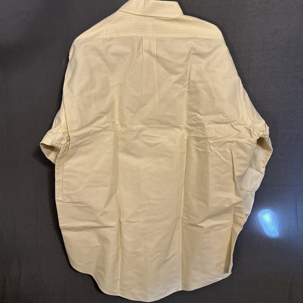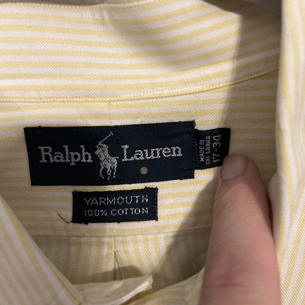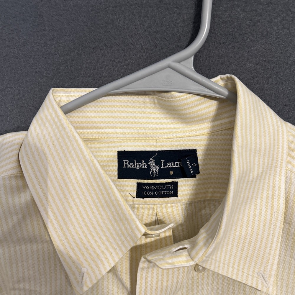 This Vintage 90's Ralph Lauren Yarmouth Oxford Yellow Men's Button Down Shirt is a classic piece perfect for casual occasions. Made from 100% cotton with a button-down collar and long sleeves, this shirt features a striped pattern and a light fabric wash. The shirt is designed in size XL with a regular fit, making it a versatile addition to any wardrobe. The Ralph Lauren brand and the 90s theme bring a touch of designer flair to this timeless and colorful piece.