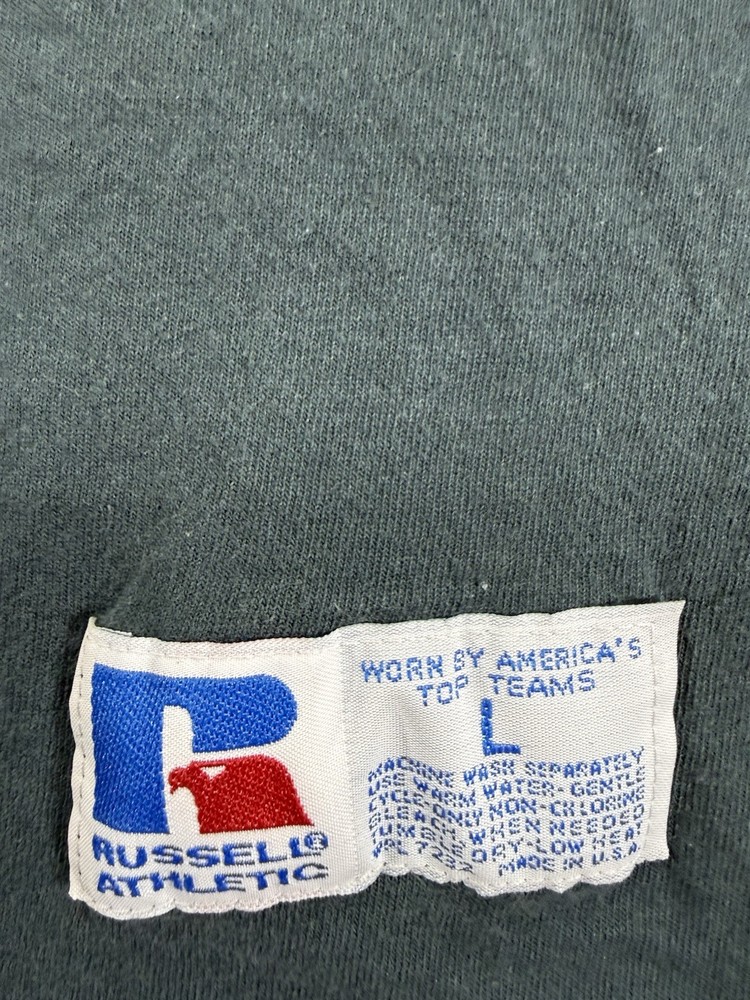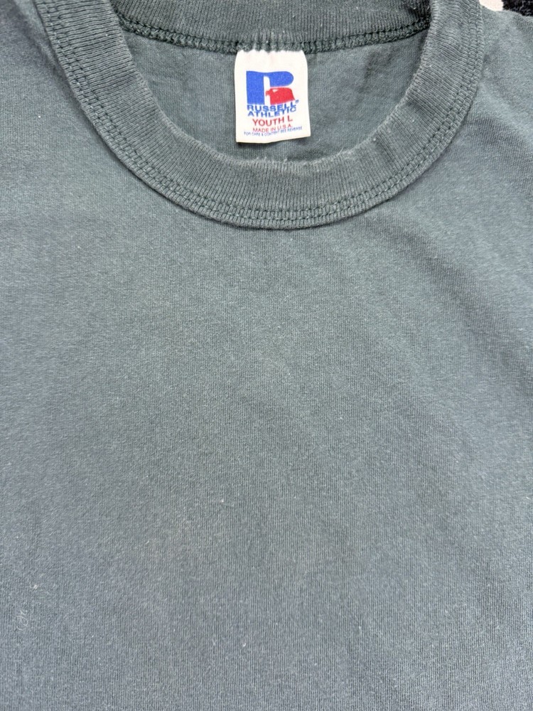Vintage 90s Russell Athletic Blank T Shirt! Size youth large in a faded black color. Measurements in photos. Preowned very good condition with some signs of normal wear. Preowned subject to stain/imperfection/signs of wear/fade/discoloration.