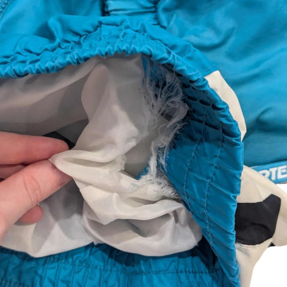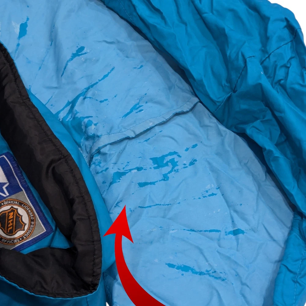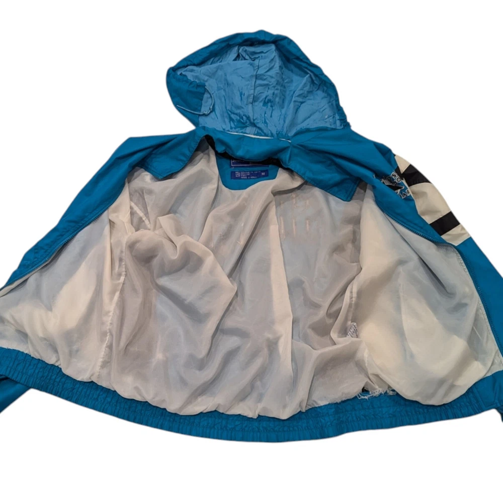 Vintage 90s San Jose Sharks Starter NHL Hockey Windbreaker Jacket Medium Pre-owned Prewashed in detergent More teal than pics show A lot of wear: Hood has marks on the inside Both ends of the sleeves have a bunch of marks Rip on the back Rip to the inside liner Marks on the front Refer to pictures for overall condition and sizing.