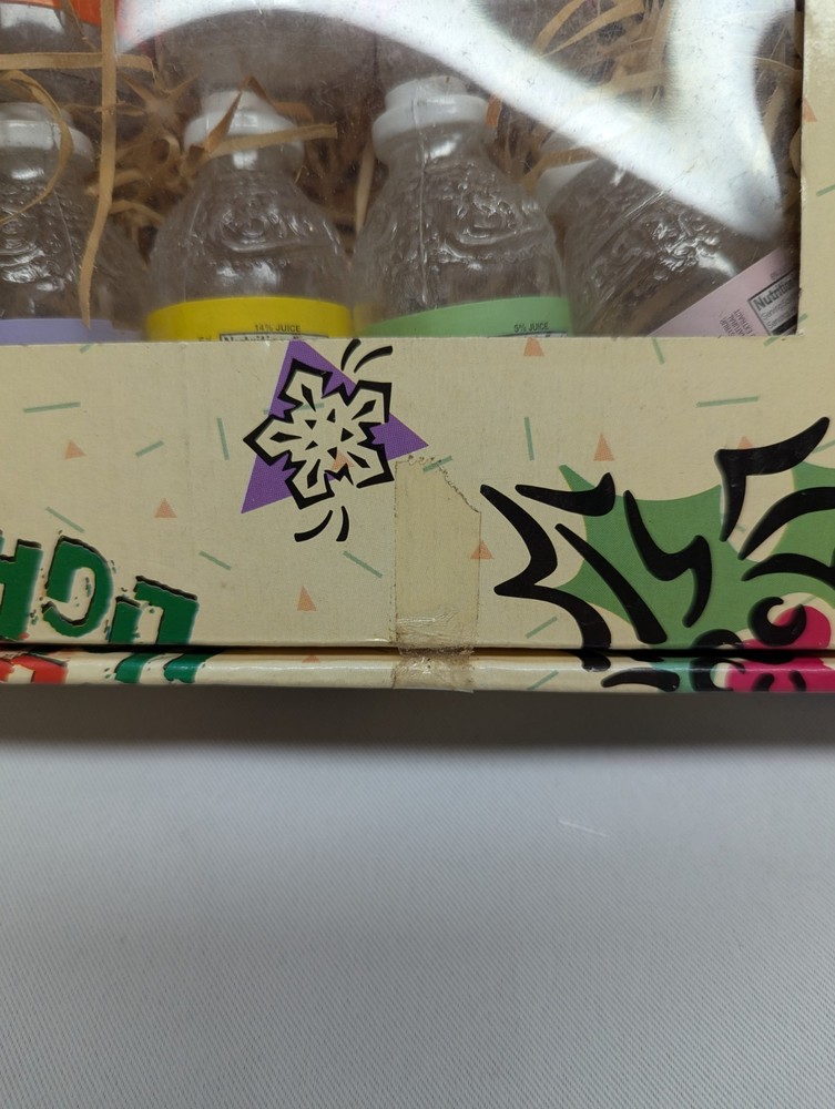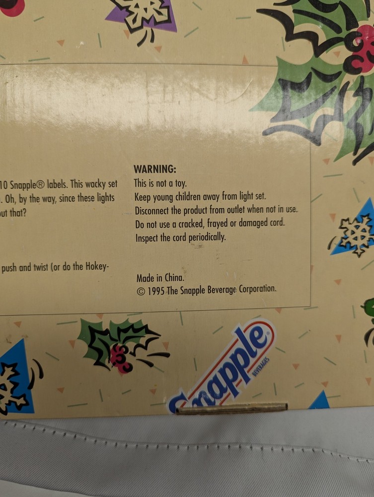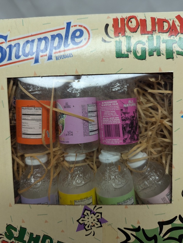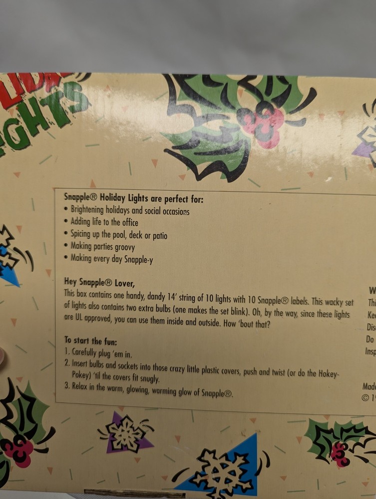 The product is a rare vintage set of 1995 Snapple 14' string holiday patio lights, featuring a multi-color design. These original string lights are unopened, making them a unique collectible item for fans of Snapple or vintage advertising. Perfect for adding a nostalgic touch to any holiday or outdoor display, these lights capture the essence of 90s food and beverage advertising.
