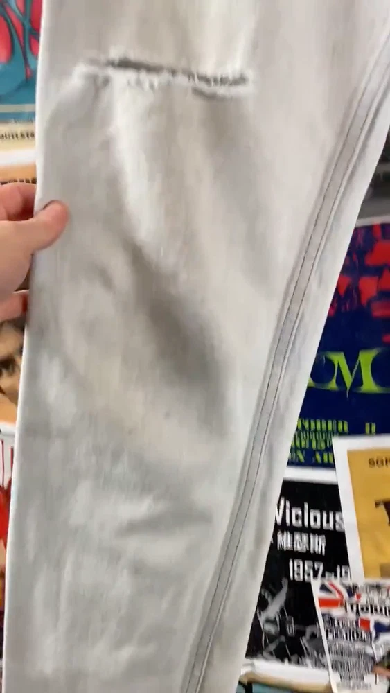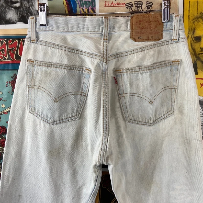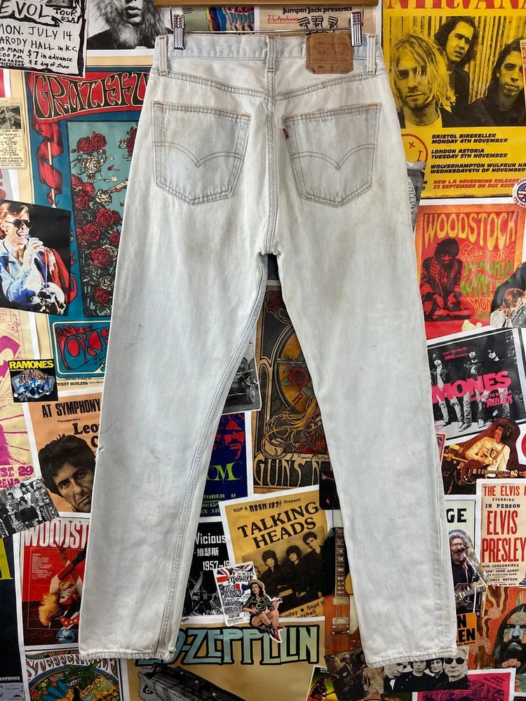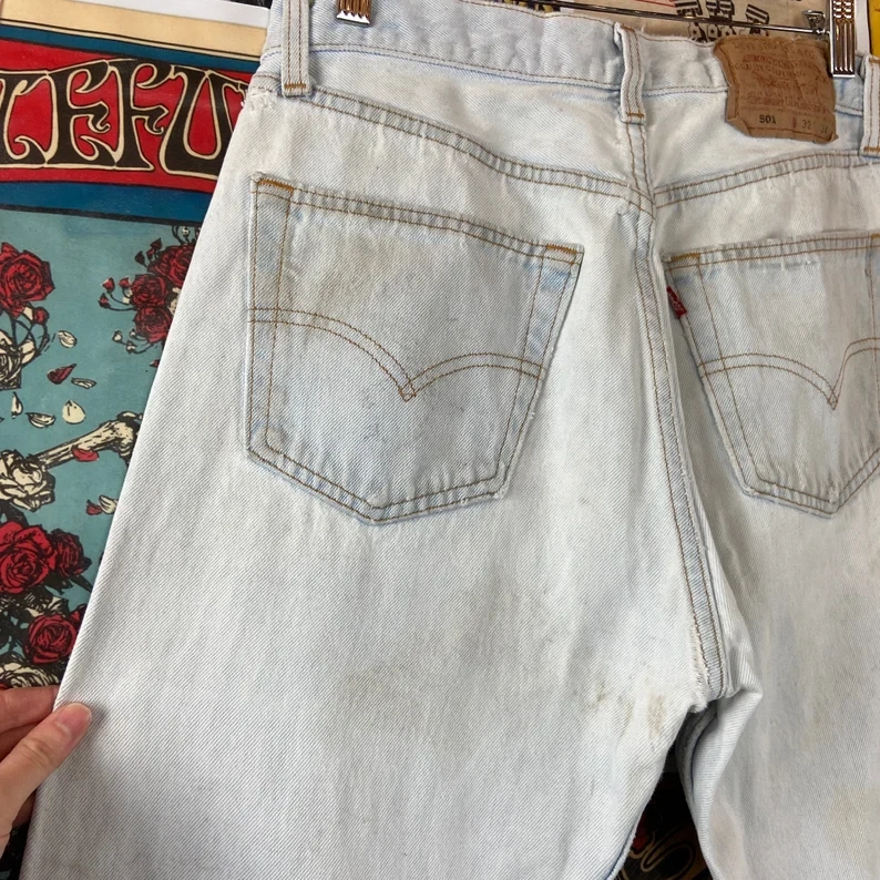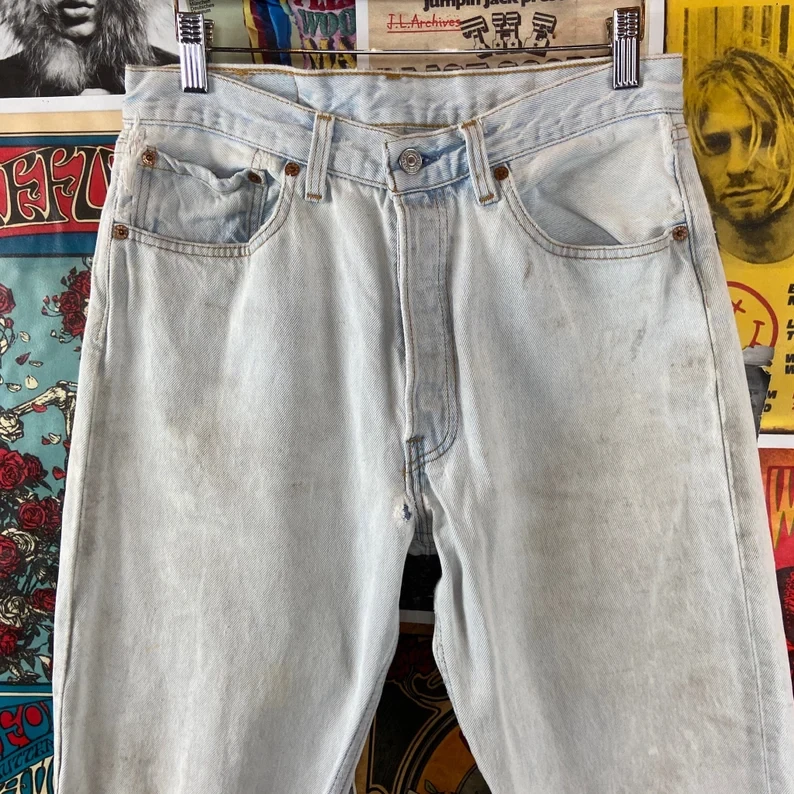 Vintage 90s light wash stained and faded Levi's 501 denim jeans. Made of 100% cotton in U.S.A. Selling in as is condition - has staining/discoloration and a mended hole {see images + video}. Tagged size 32x34, but measures at 30x33 3/4". Perfect 90s grunge jeans! Are tagged as a women's on the back of the label, but can be worn unisex. Check measurements for sizing. waist -- 30" hips -- 39" rise -- 11" thigh -- 21" inseam -- 33 3/4" cuff -- 7.5" total length -- 41"