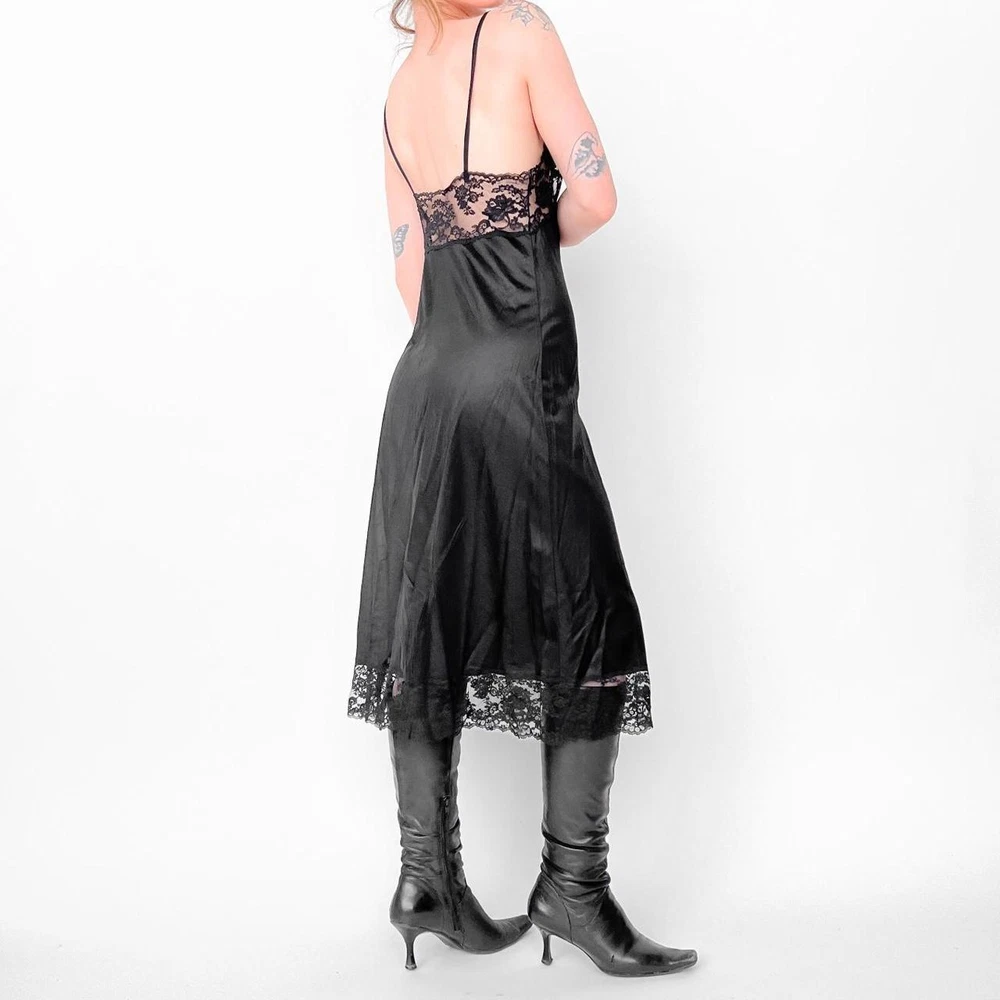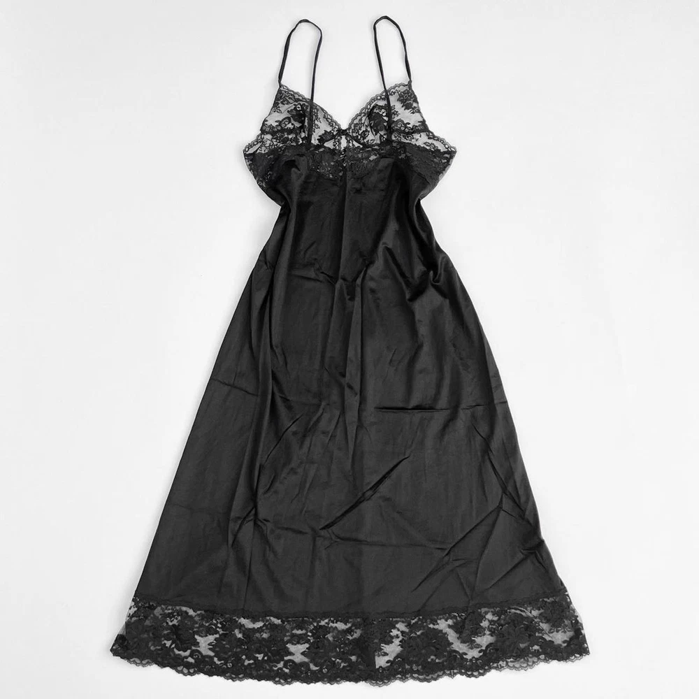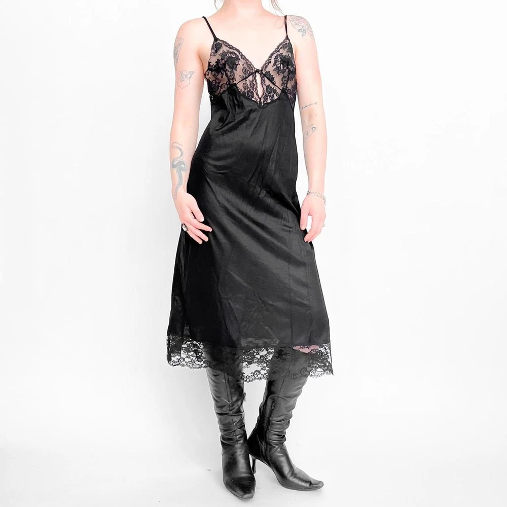 vintage “the limited” black lace trim maxi slip dress. size medium bust: 15.5”, length: 39.5” nylon model measurements: bust: 32a, waist: 25”, hip: 34.5”, height: 5’6