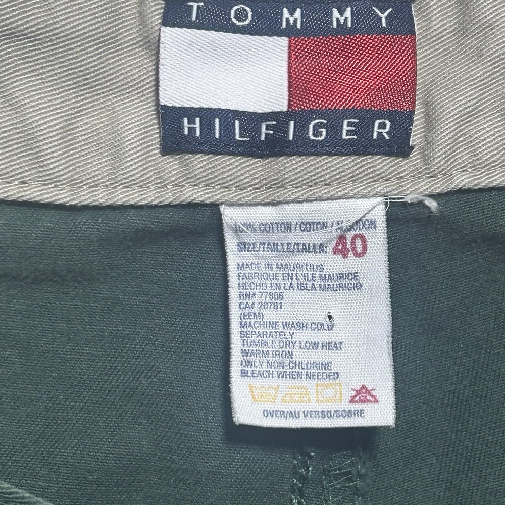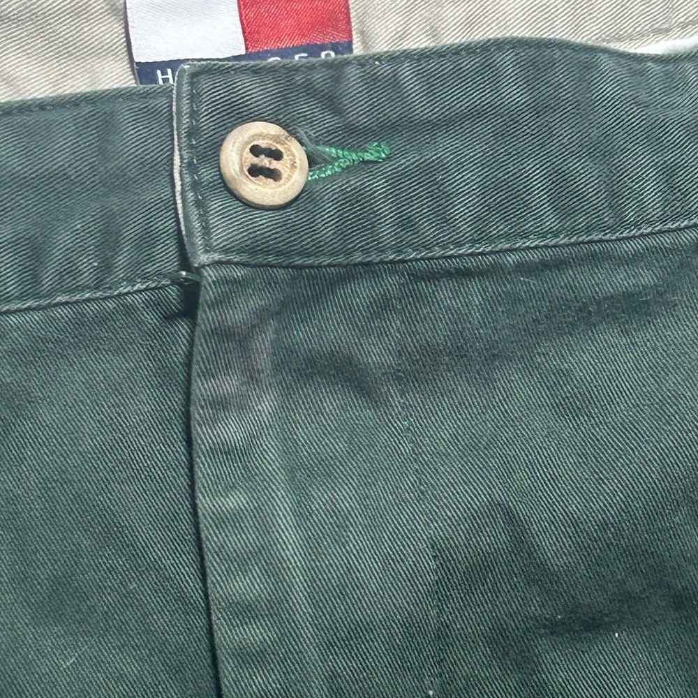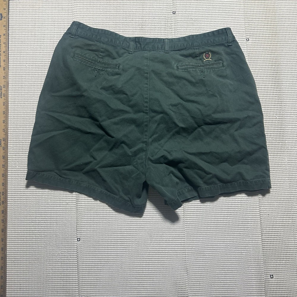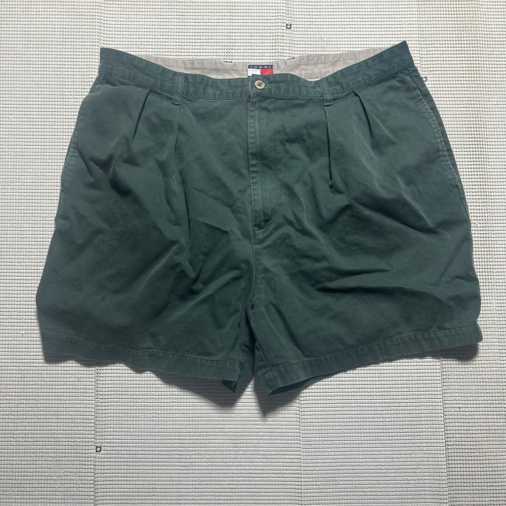Slight discoloration by zipper This is a vintage pair of Tommy Hilfiger chino shorts for men in size 40, featuring a faded green color. The shorts have a regular fit with a pleated front design, showcasing a 90s-inspired style. Made from cotton material, these above-the-knee shorts exude a retro vibe perfect for casual summer outfits.