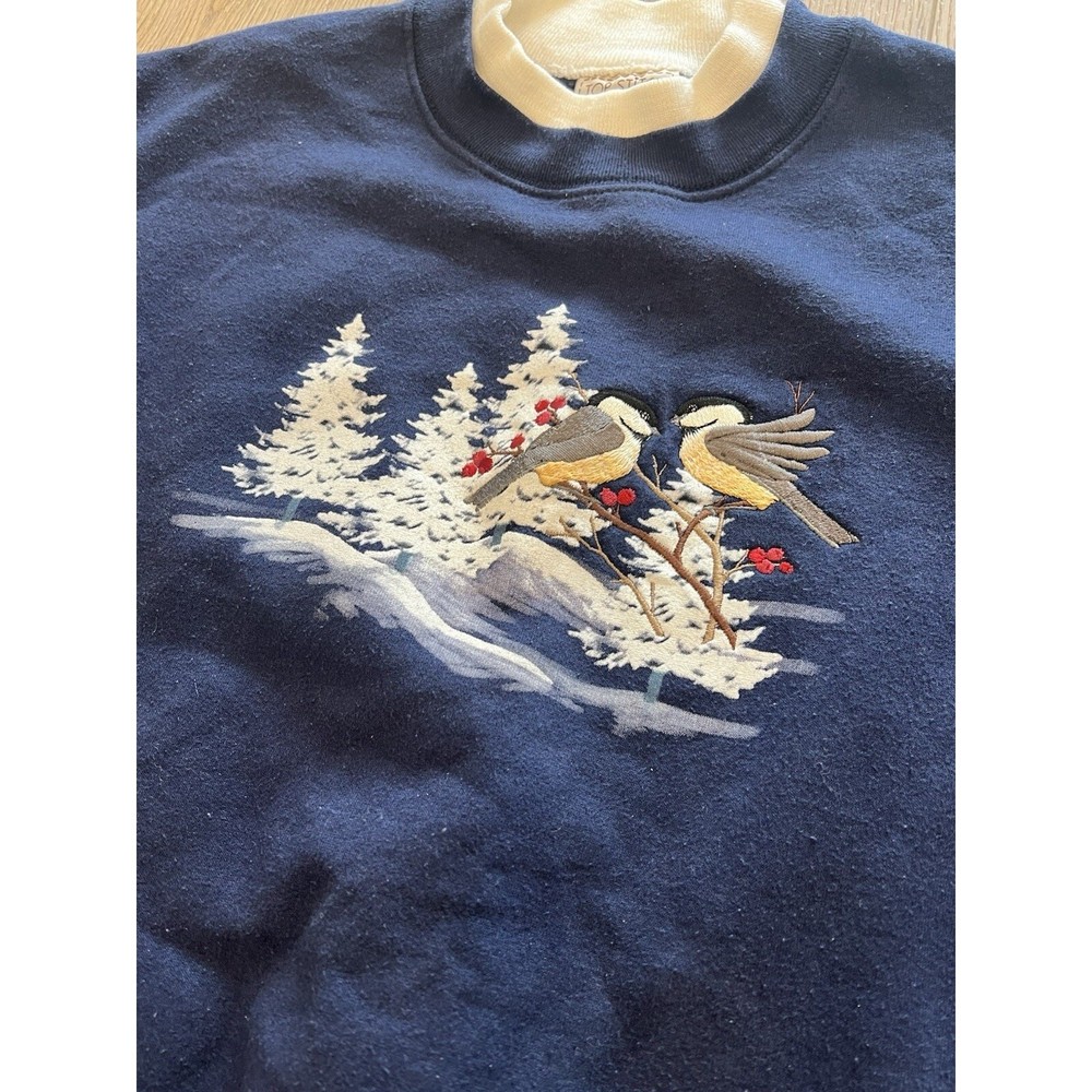 This is a vintage 90s Morning Sun cotton sweatshirt for women in blue. It features embroidered bird designs, a crew neckline, long sleeves, and a pullover style. The heavyweight fabric is ideal for winter, with a solid pattern. This sweatshirt is a blend of cotton materials, has a regular fit, and is perfect for casual wear, parties, or travel. It has a nostalgic theme and can be machine washed for easy care. Measurements Ptp: 21.5” Shoulder to bottom: 24.25”