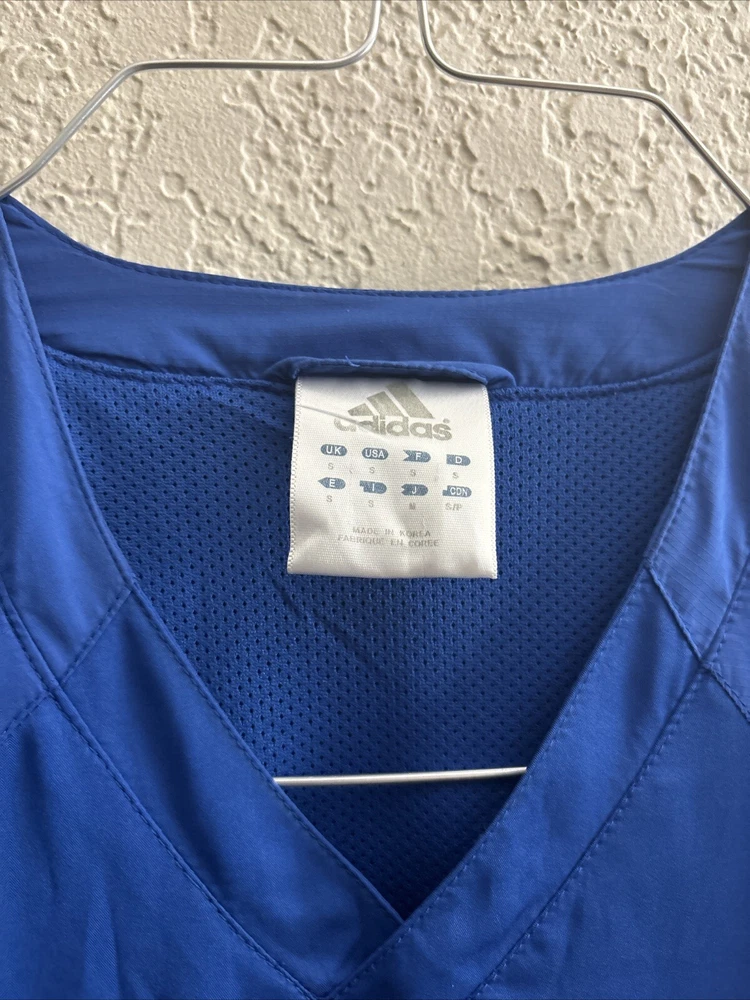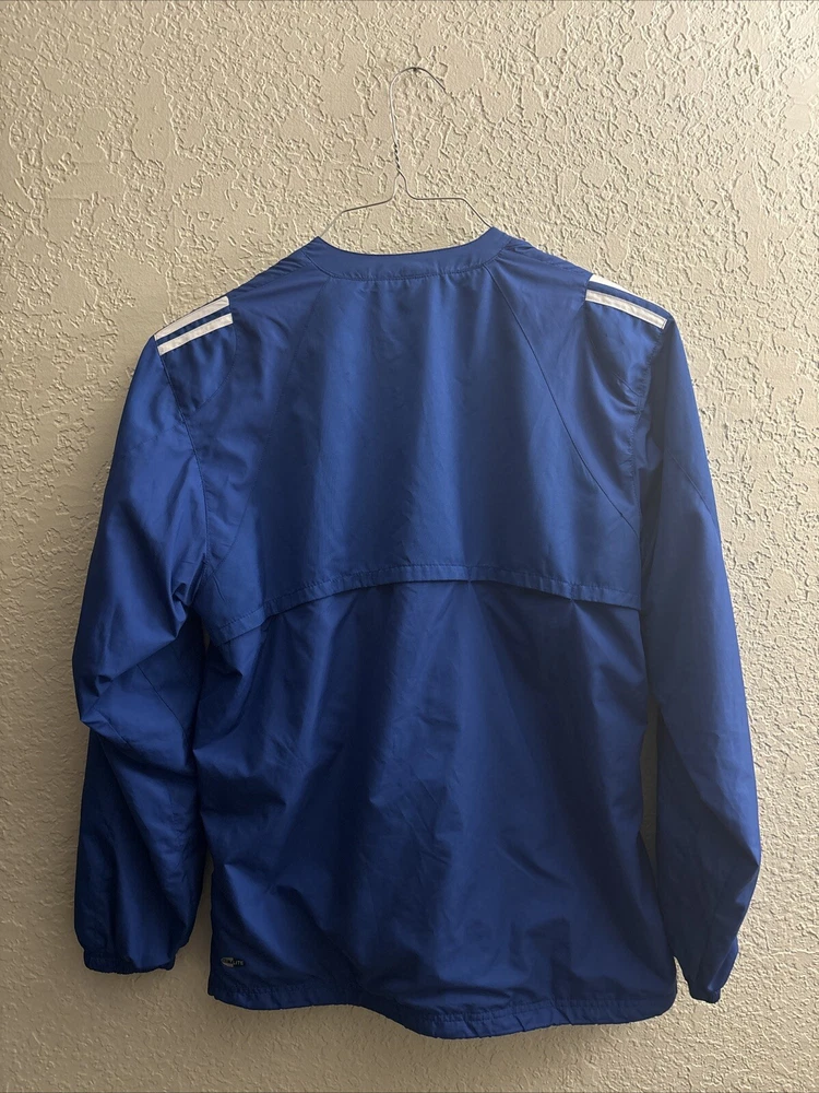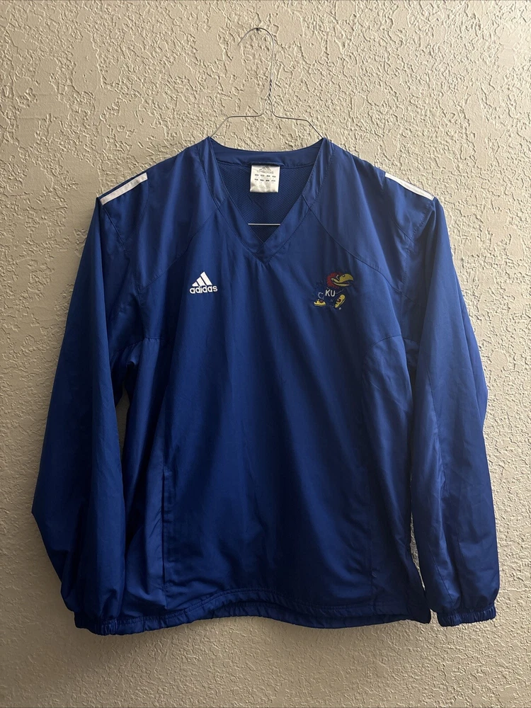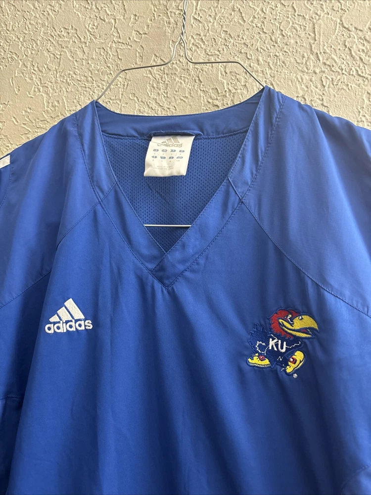 Show off your love for the Kansas Jayhawks with this vintage 90s Y2K Adidas pullover windbreaker jacket. This jacket features the iconic Adidas logo and the team name in bold blue letters. It is designed for both men and women, making it a perfect fan apparel for basketball games. The jacket is made of high-quality material that ensures durability and comfort. It is a great addition to any fan's collection.