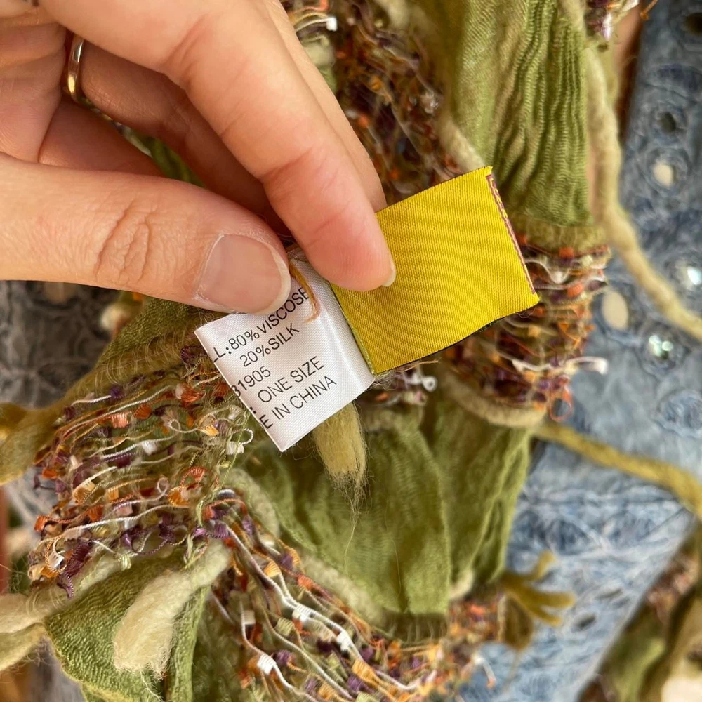 Vintage Y2K Grunge Fairy Scarf Hippie bohemian distressed Description: 90s or 00s green multicolor silk blend scarf by Scala. ***Other clothing/accessories not included. Condition: good. Yarn coming loose in some places; adds to overall character of scarf Dimensions: - length: 52 inches - width: 19 inches