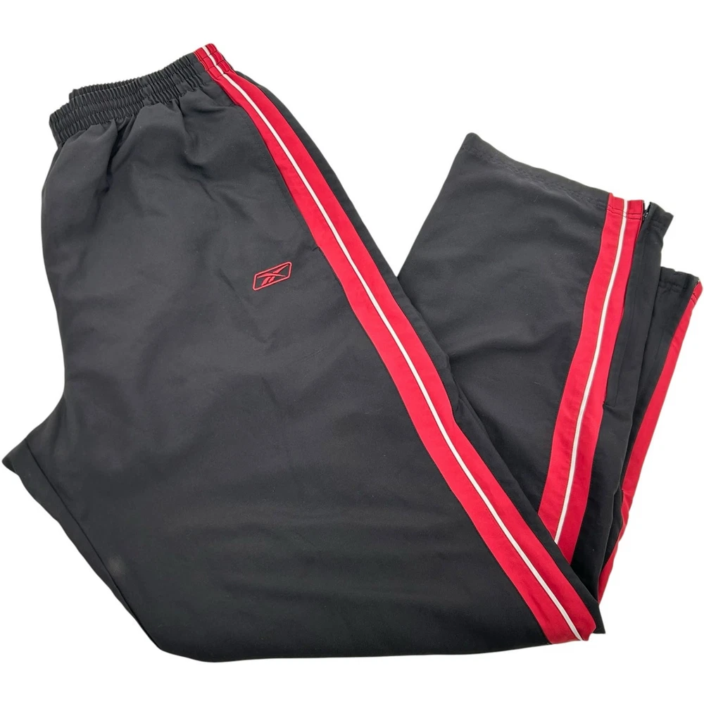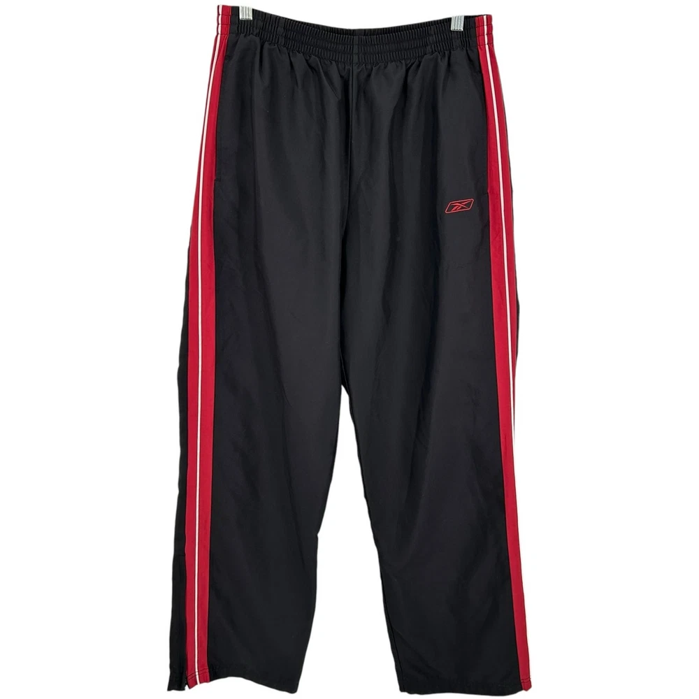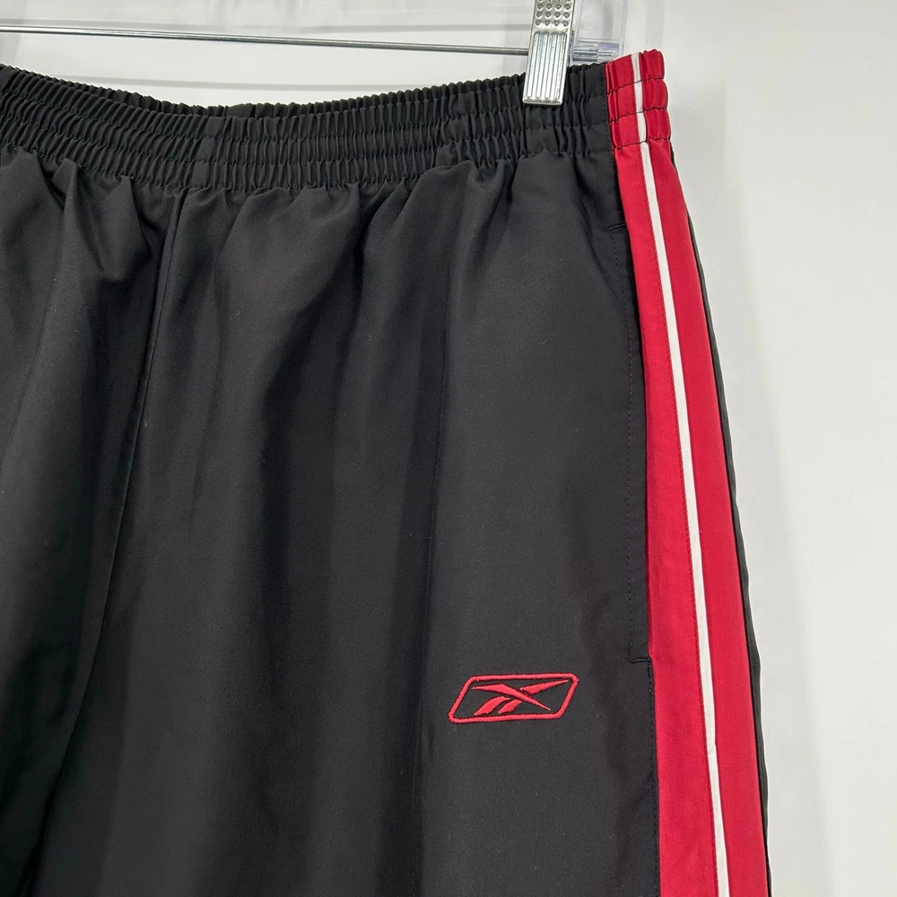 Vintage 90s men's black red Reebok wide leg lined baggy windbreaker track sweatpants w/ zippered ankles Tag Size: L Waist: 31-36" (stretch) Inseam: 32" Leg Opening: 10" Item is in good used condition. Look at photos to see the condition. All, if any, flaws have been pictured. See the last photo for measurements. The waist measurements are measured flat and then multiplied by 2 to get the full measurement around. Please know which measurements fit you prior to purchasing, and don’t just rely on the size tag. Feel free to ask any questions! ***Item is cross posted on several platforms***