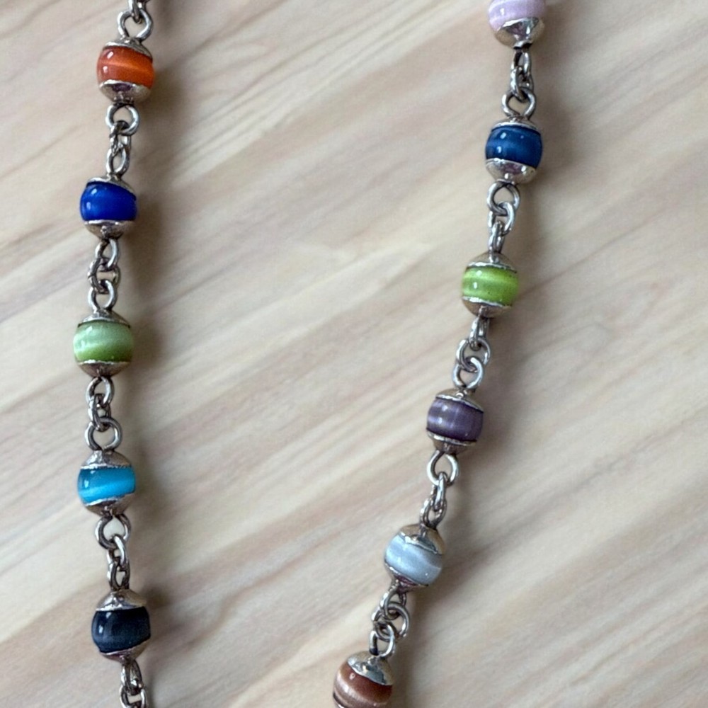 This vintage 925 sterling multi color cat eye bead necklace features a heart pendant with a toggle clasp closure. The necklace is made of sterling silver with colorful beads and a cat's eye main stone. It has a charm style with a beaded design, making it a unique and stylish accessory. The necklace is 16" in length, perfect for adding a touch of vintage flair to any outfit. **Please note I am a veteran seller of 17 years under (TheChic_SheShed) I opened this account to move my jewelry to, as I closed my etsy shop. So please do not mind the little to no feedback. Check out my other account.