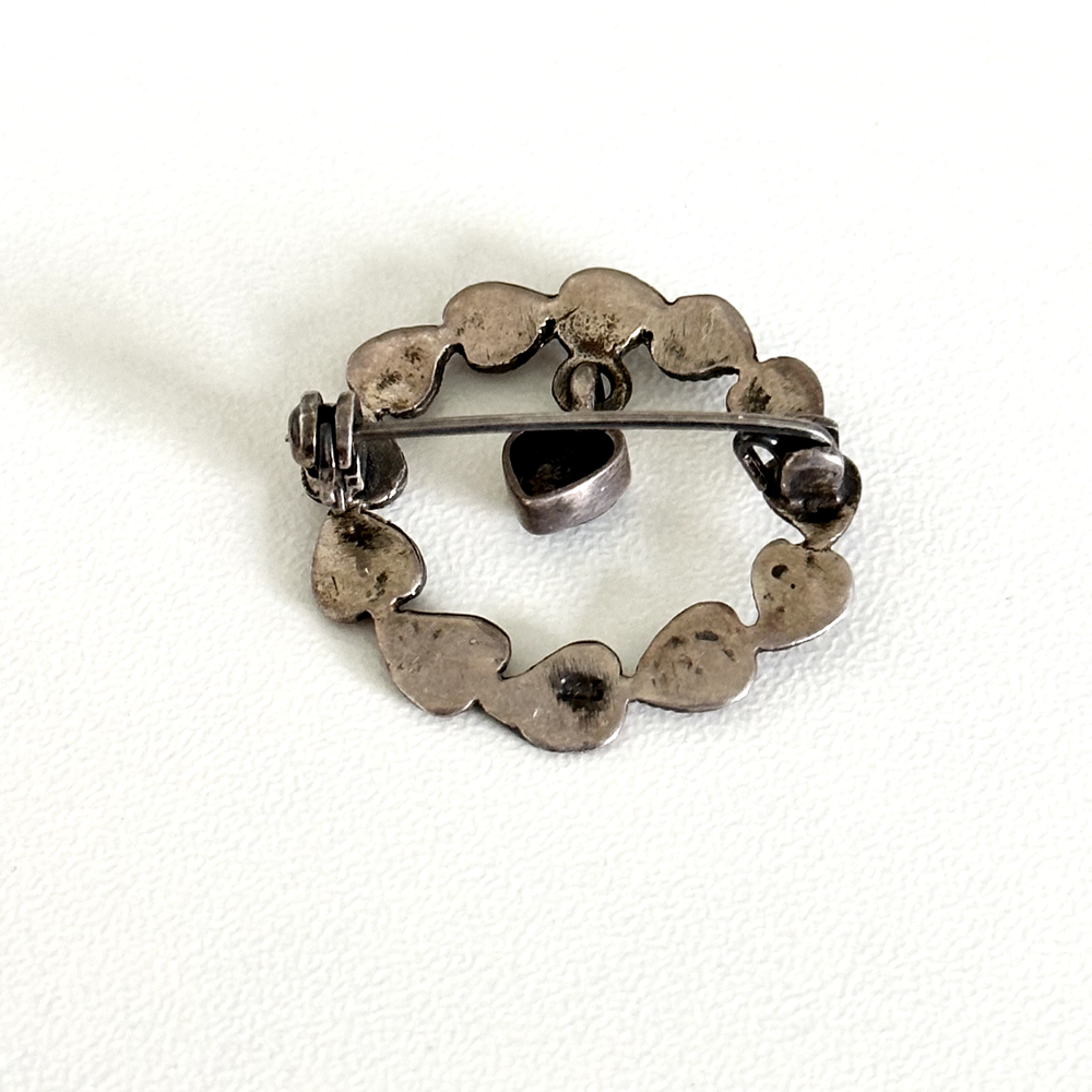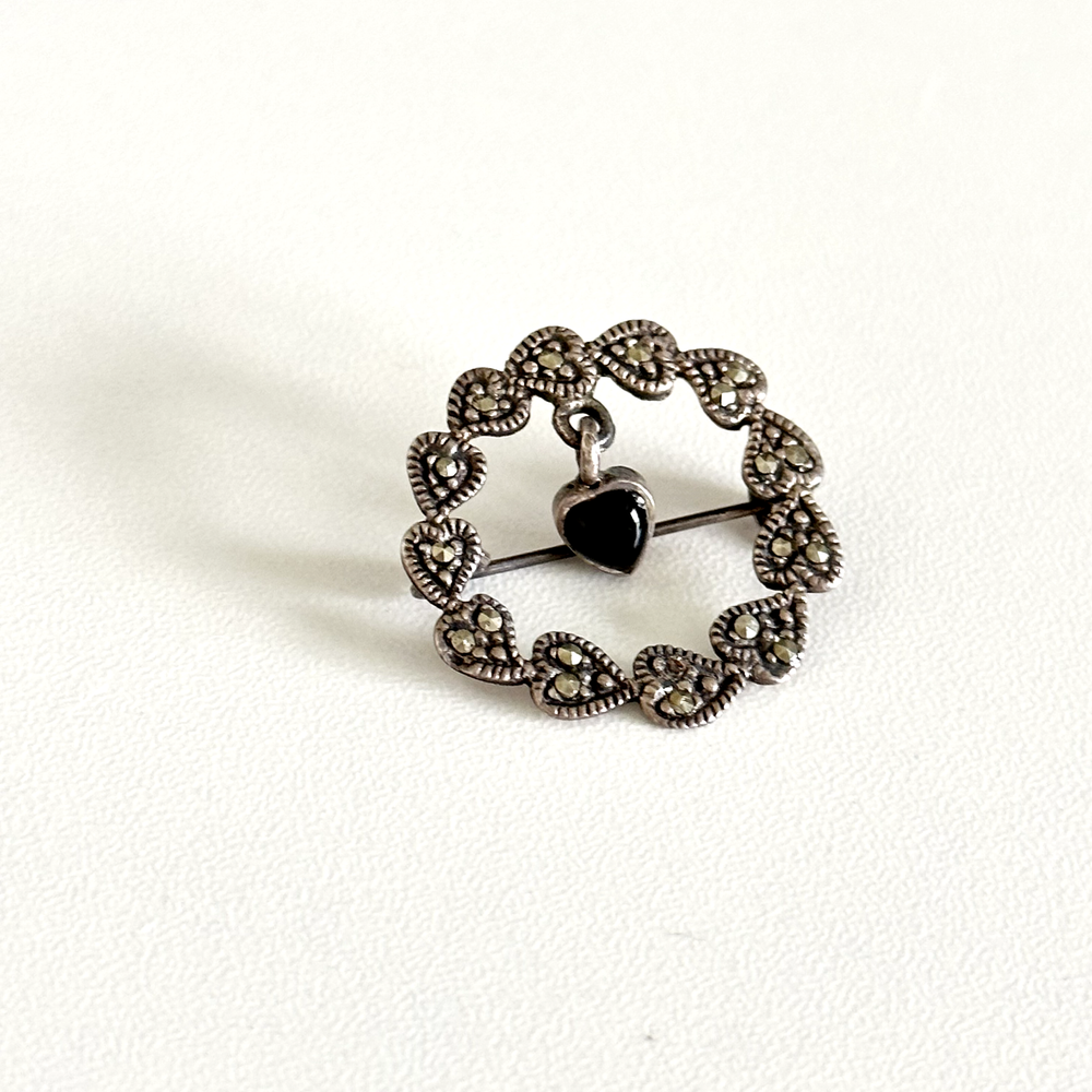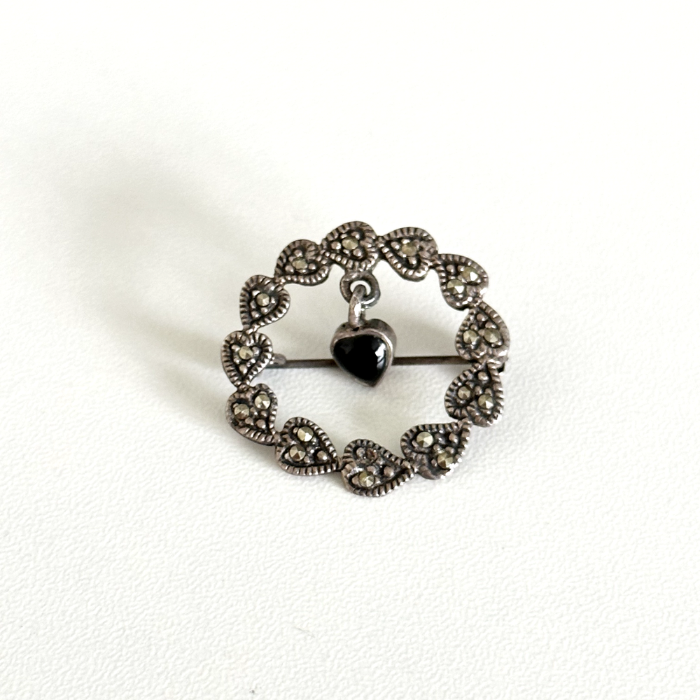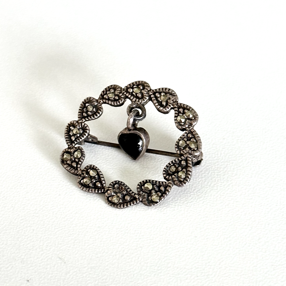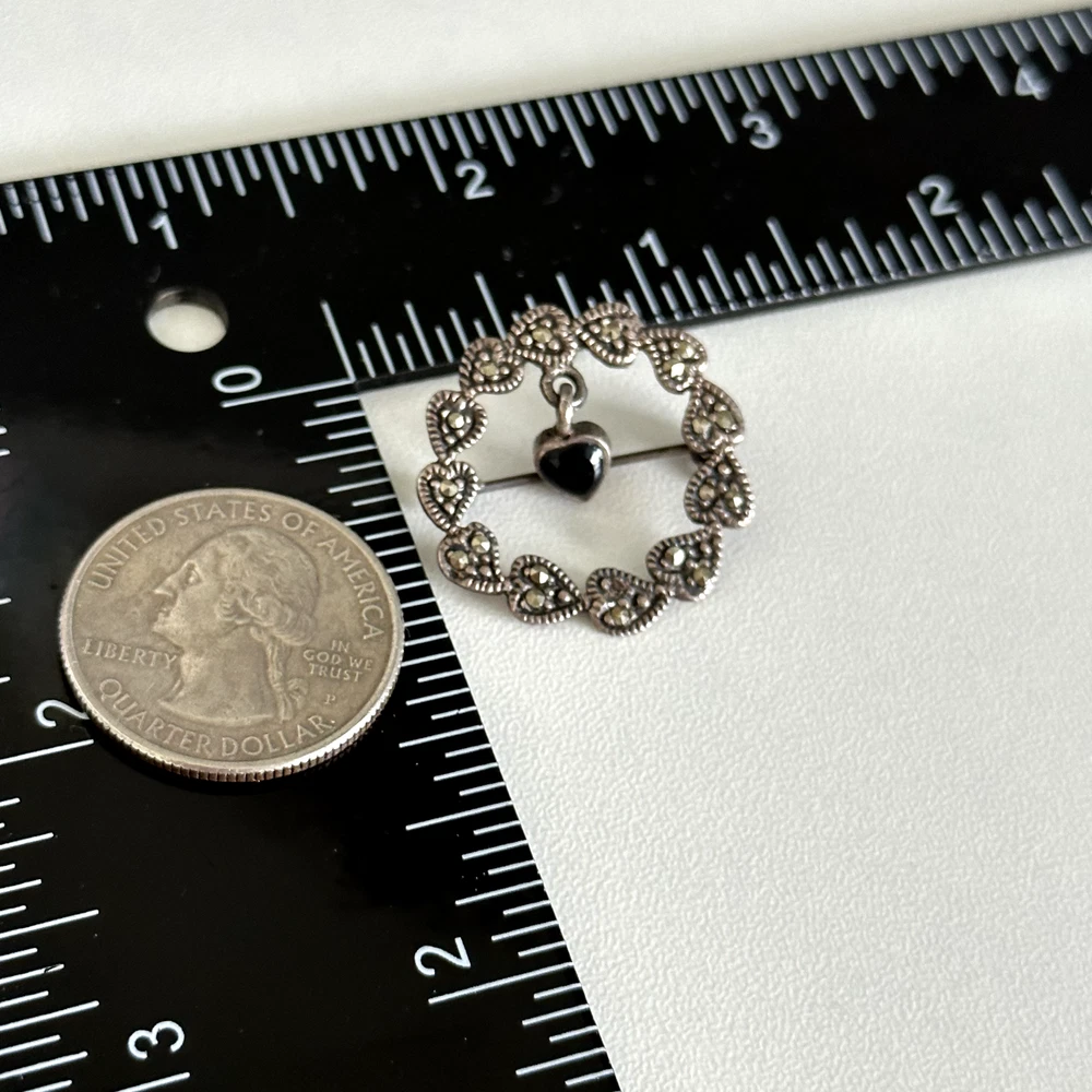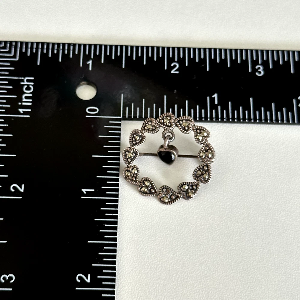Lovely Vintage 925 Sterling Silver Black Onyx Dangle Heart Marcasite Wreath Brooch Pin Length: 1" Weight: 3.3 grams Signed: 925 Good vintage condition. Has one small missing marcasite. Pin part works perfectly. - Fast shipping, I ship the same or next business day! I also combine shipping. - Thank you so much for shopping with me and please check out my other jewelry listings, I post new pieces daily!