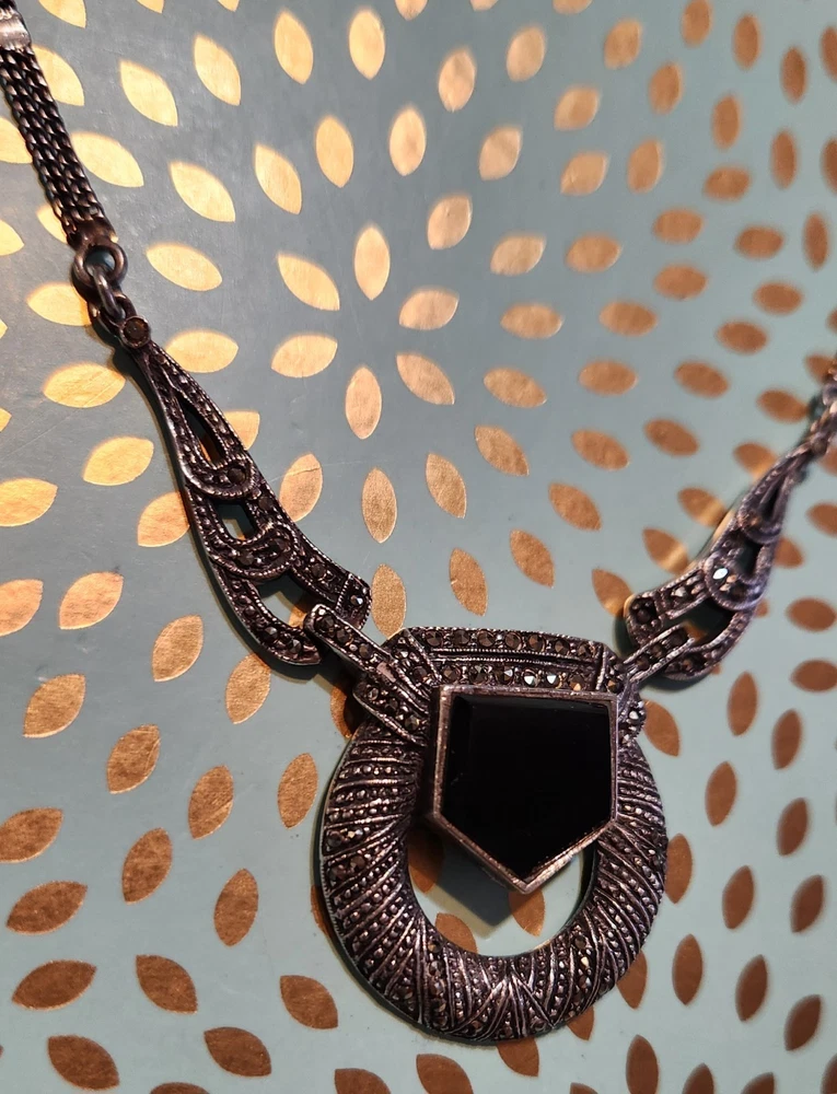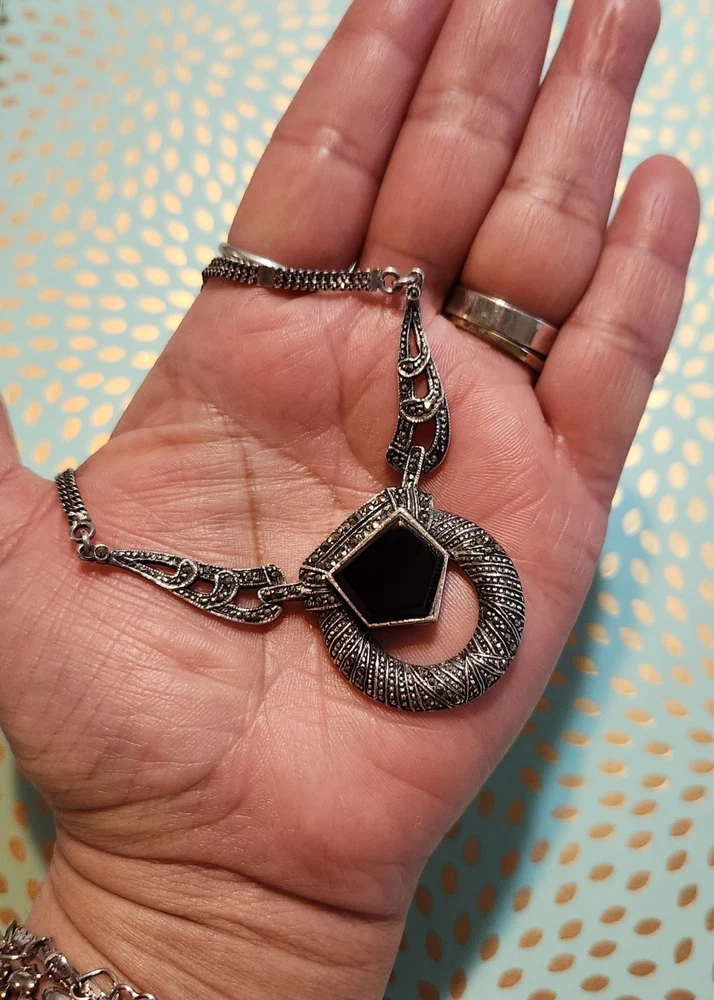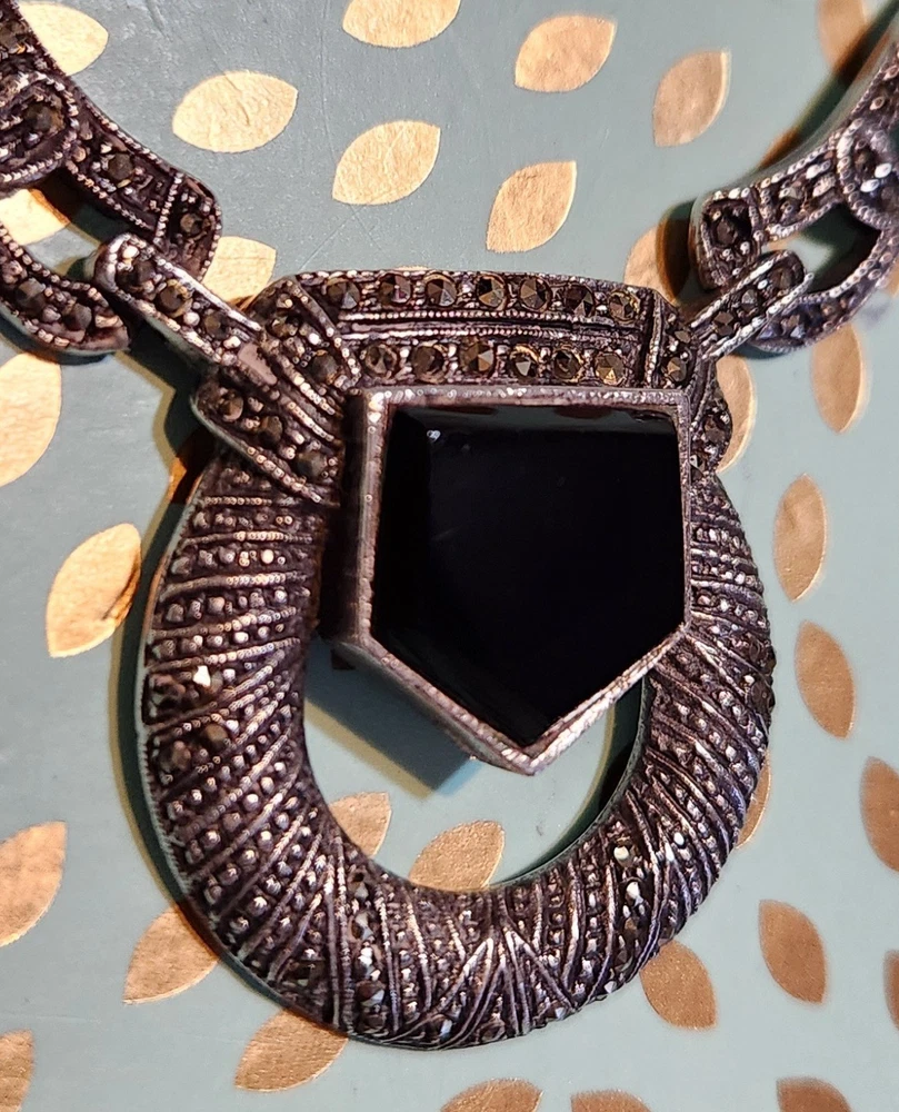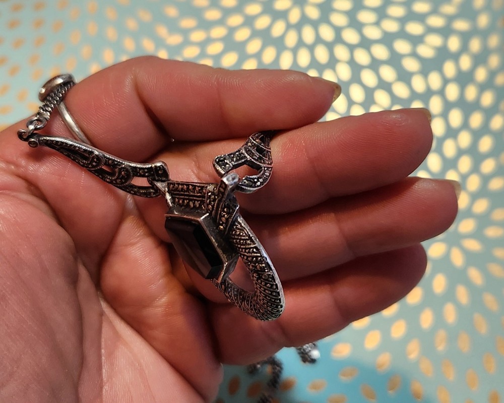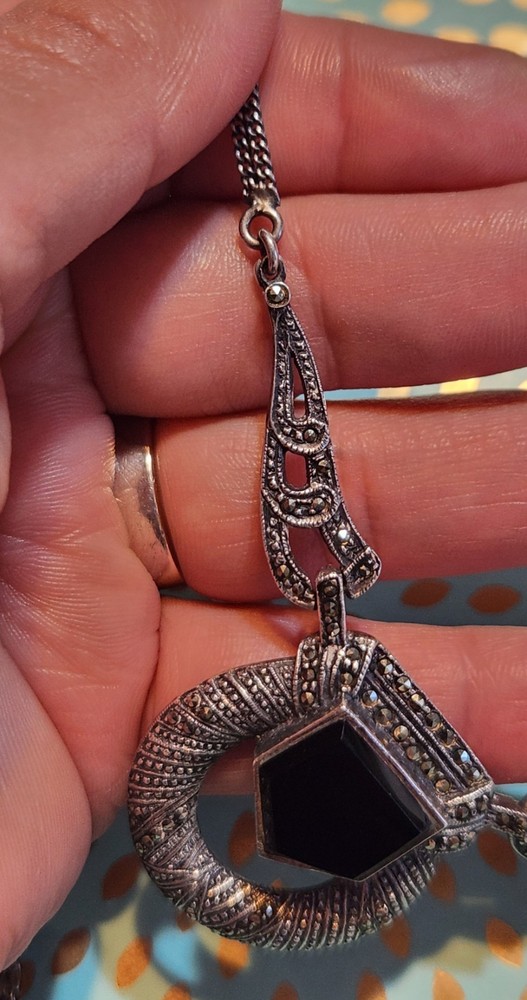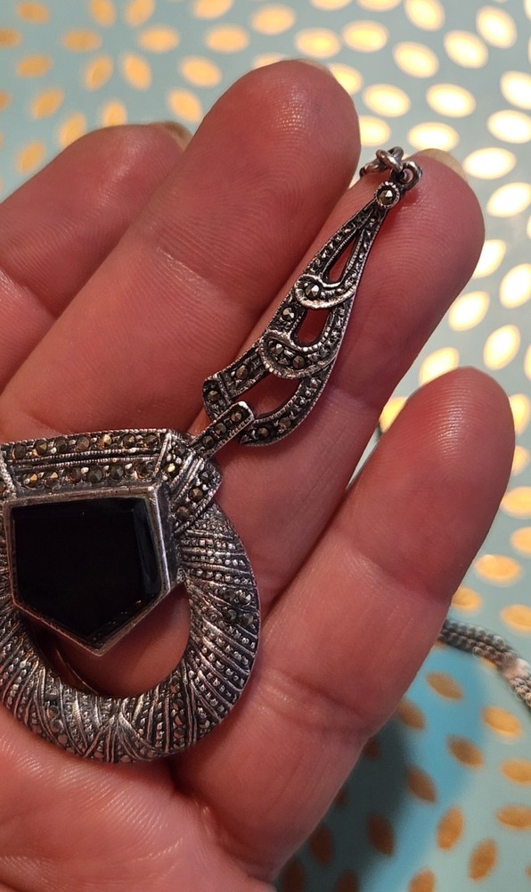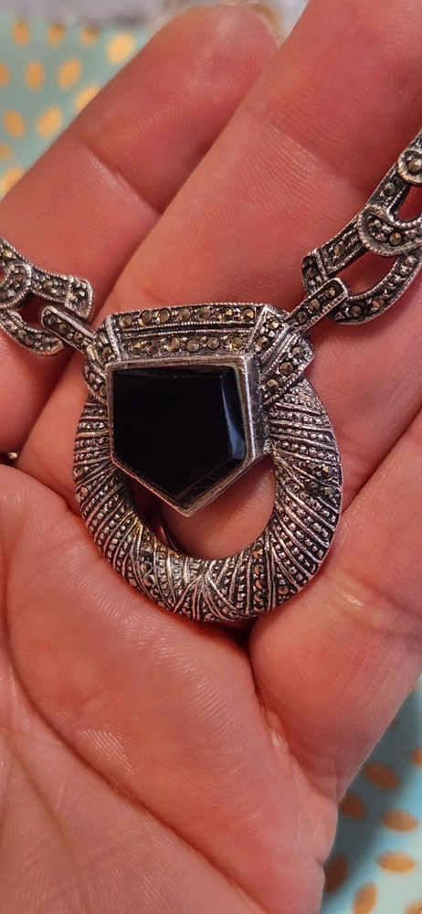 This vintage 925 Sterling Silver Necklace features marcasite stones with a black onyx stone at its center, adding a touch of elegance and sophistication to any outfit. The necklace is crafted with a spring ring closure for easy wear and is made of natural materials, making it a unique and timeless piece of jewelry. The classic chain style and sterling silver metal give this necklace a timeless and sophisticated appeal, perfect for those who appreciate vintage and antique jewelry.