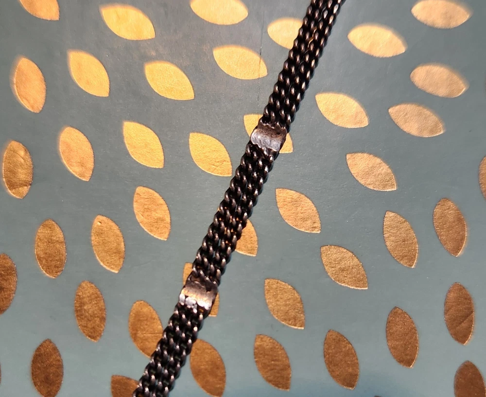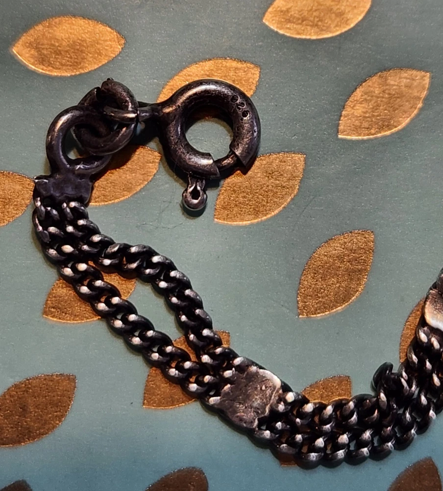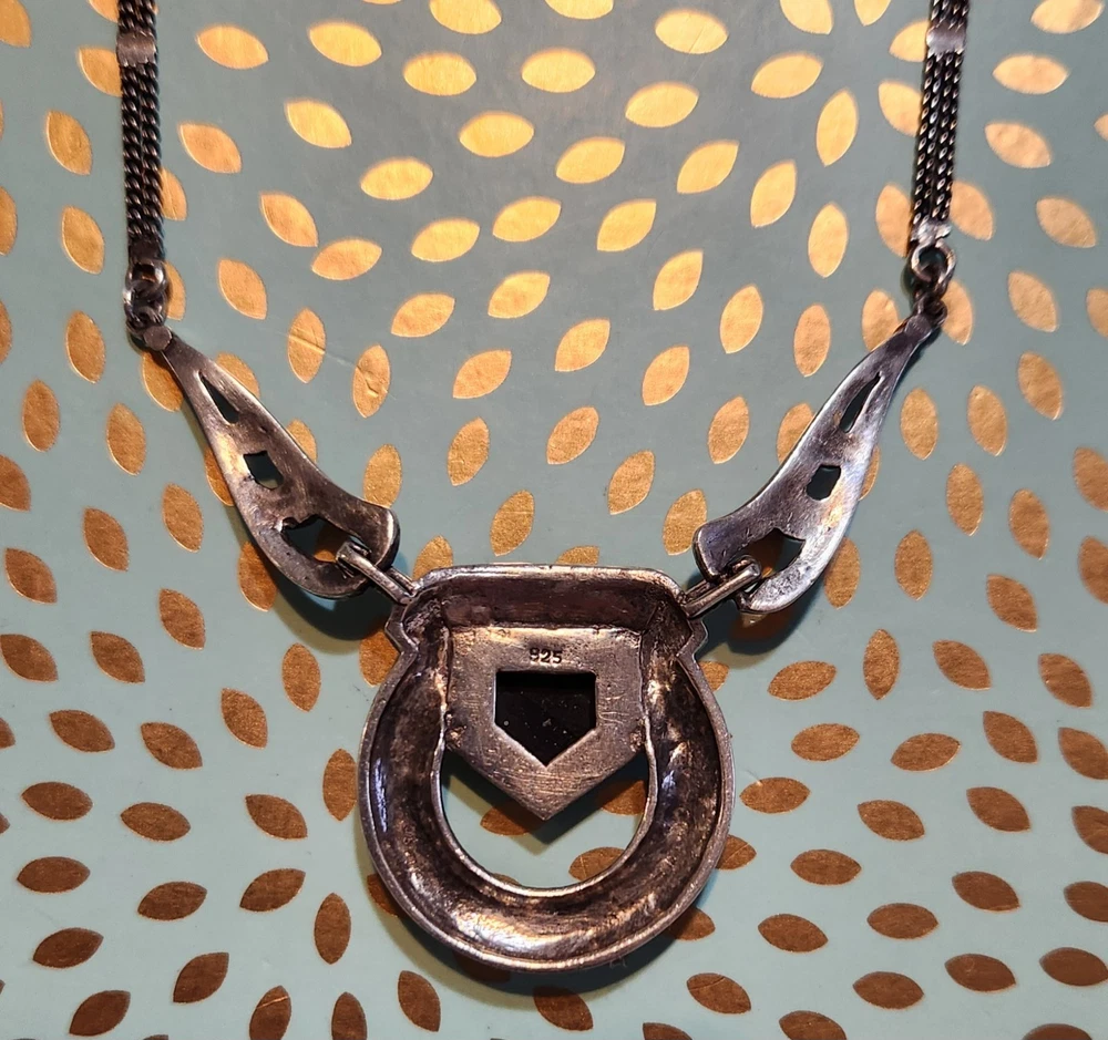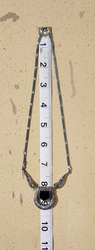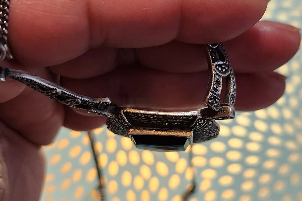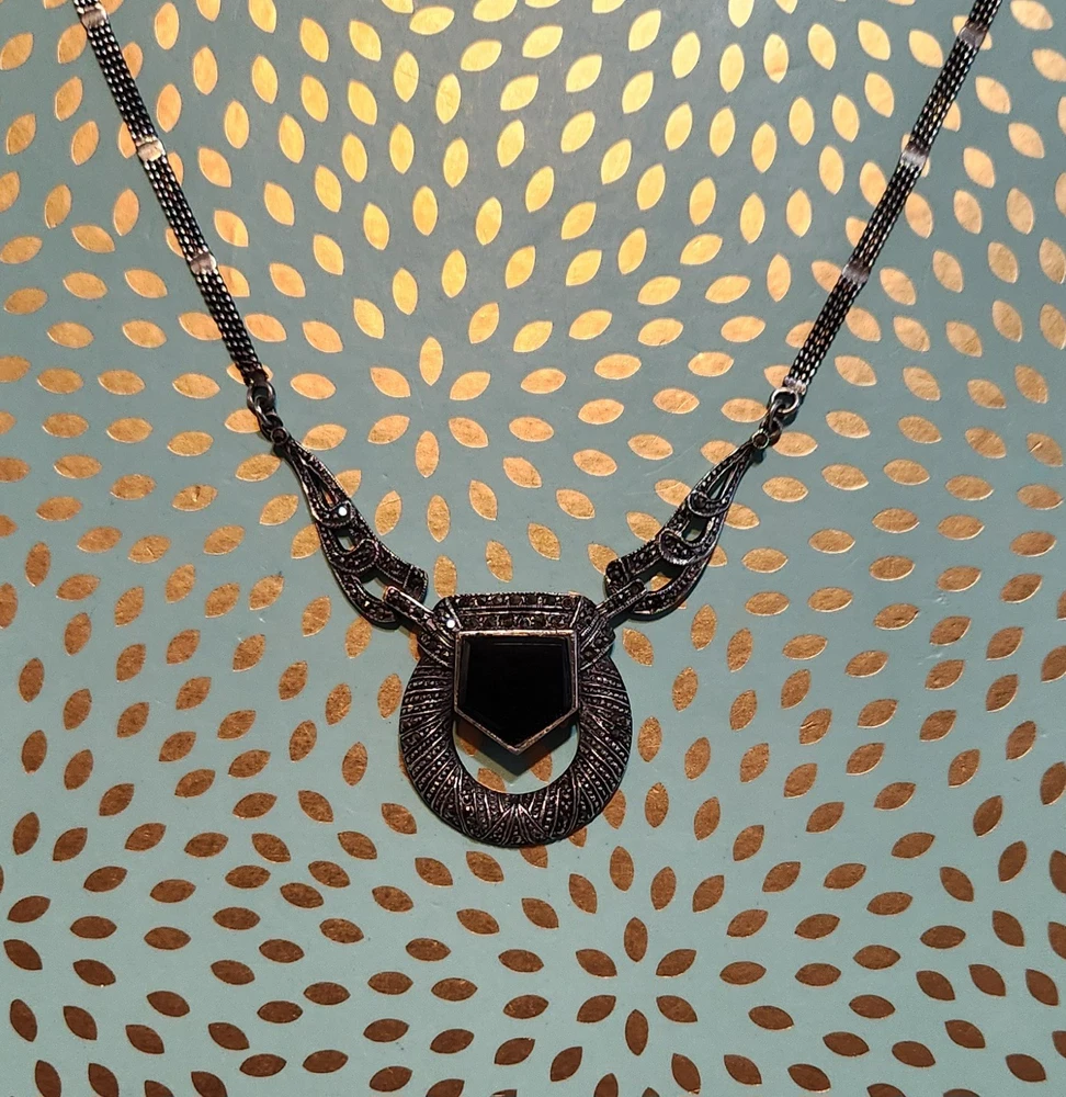 This vintage 925 Sterling Silver Necklace features marcasite stones with a black onyx stone at its center, adding a touch of elegance and sophistication to any outfit. The necklace is crafted with a spring ring closure for easy wear and is made of natural materials, making it a unique and timeless piece of jewelry. The classic chain style and sterling silver metal give this necklace a timeless and sophisticated appeal, perfect for those who appreciate vintage and antique jewelry.