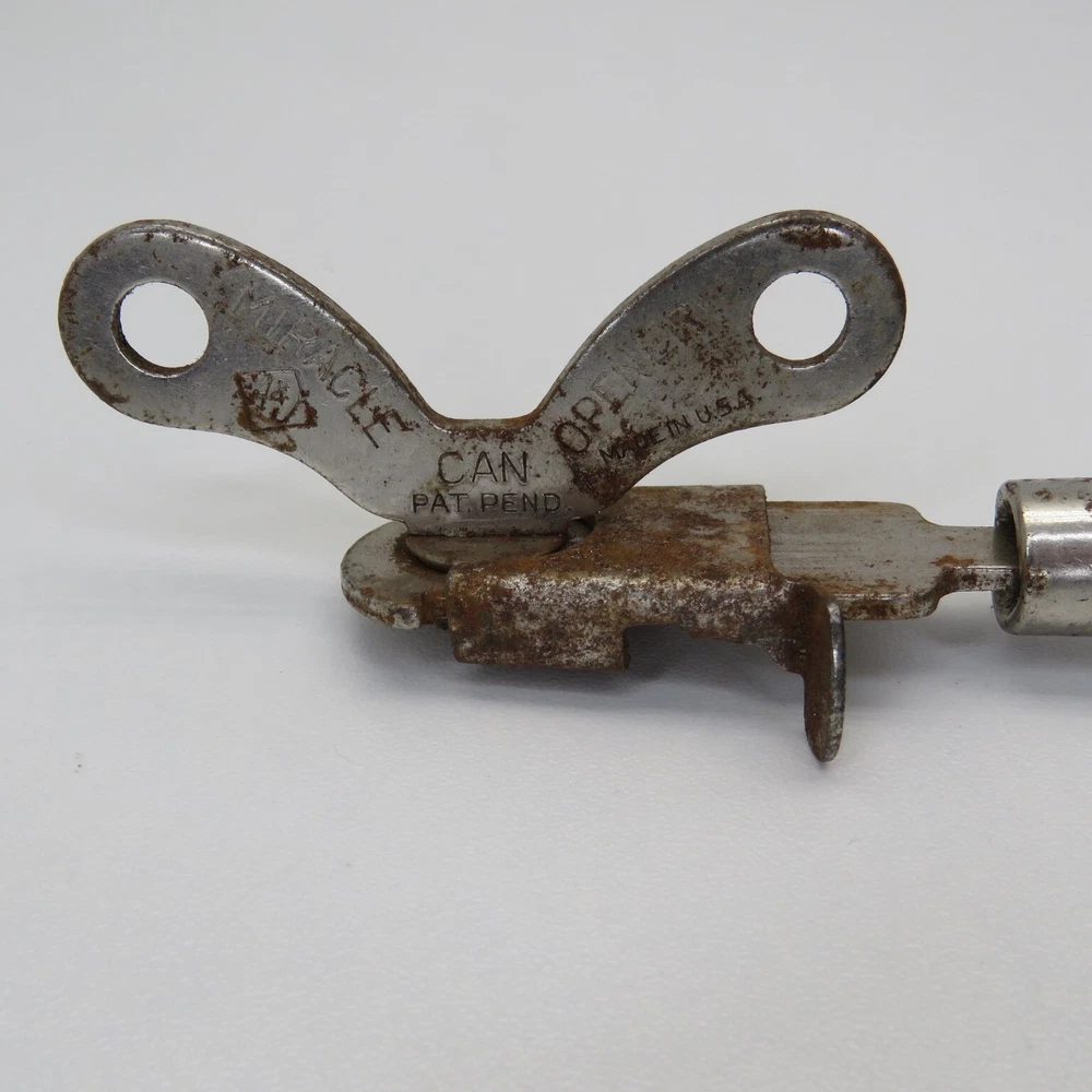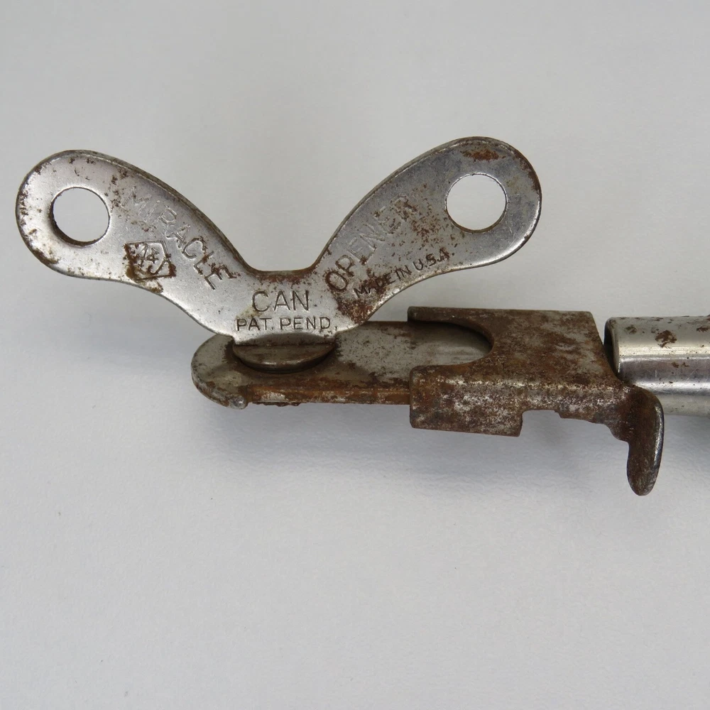 This is a vintage A&J Miracle Can Opener. The kitchen used piece is in rough condition with rust to the metal and chipping green paint on the wood handle. Although the metal is rusty, the moving mechanisms move freely. The gadget is marked "Pat. Pend." and "Made in USA". This is a collectable item only and not for use with food. Please see pictures for actual condition. Please contact me with any questions. When possible I can combine shipping on multiple purchases. Please wait for a revised invoice before paying. Check out my other cool items!