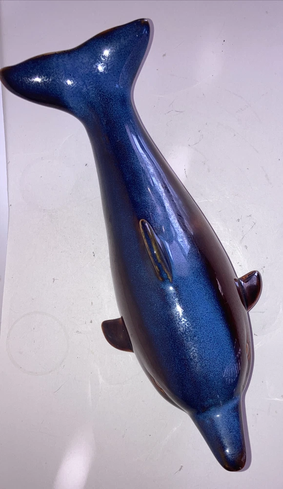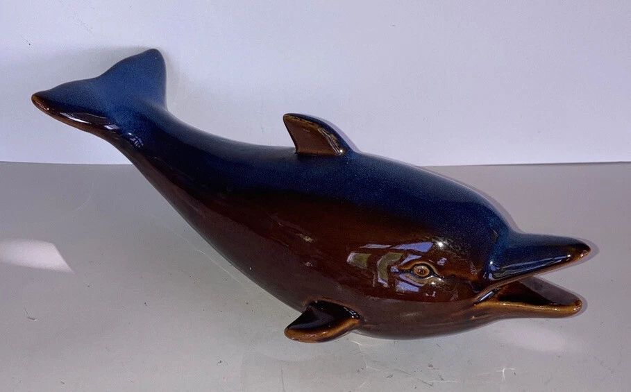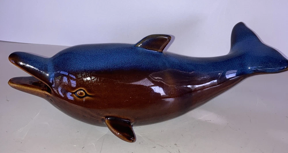 Vintage ART DECO GLAZED BLUE AND BROWN CERAMIC DOLPHINS POTTERY.