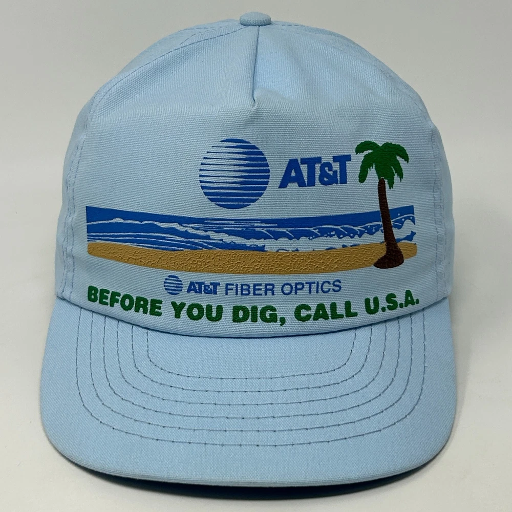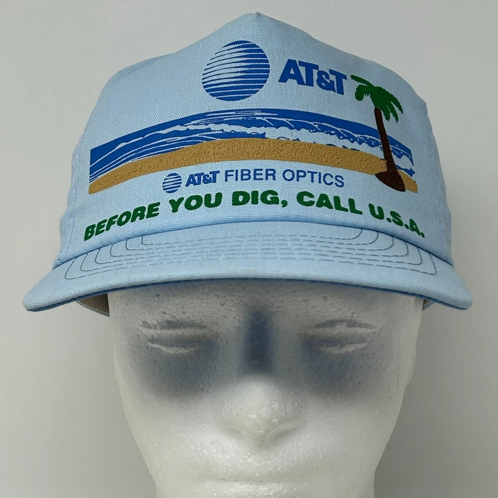Vintage AT&T Telecommunications Call Before You Dig Baseball Cap Hat Fiber Optics Telephones Nevada California 80s Made In USA Snapback Five Panel A-Frame Blue Will be shipped in a box. CONDITION: In very good used condition. No flaws noticed. Has been cleaned and sanitized. See photos.